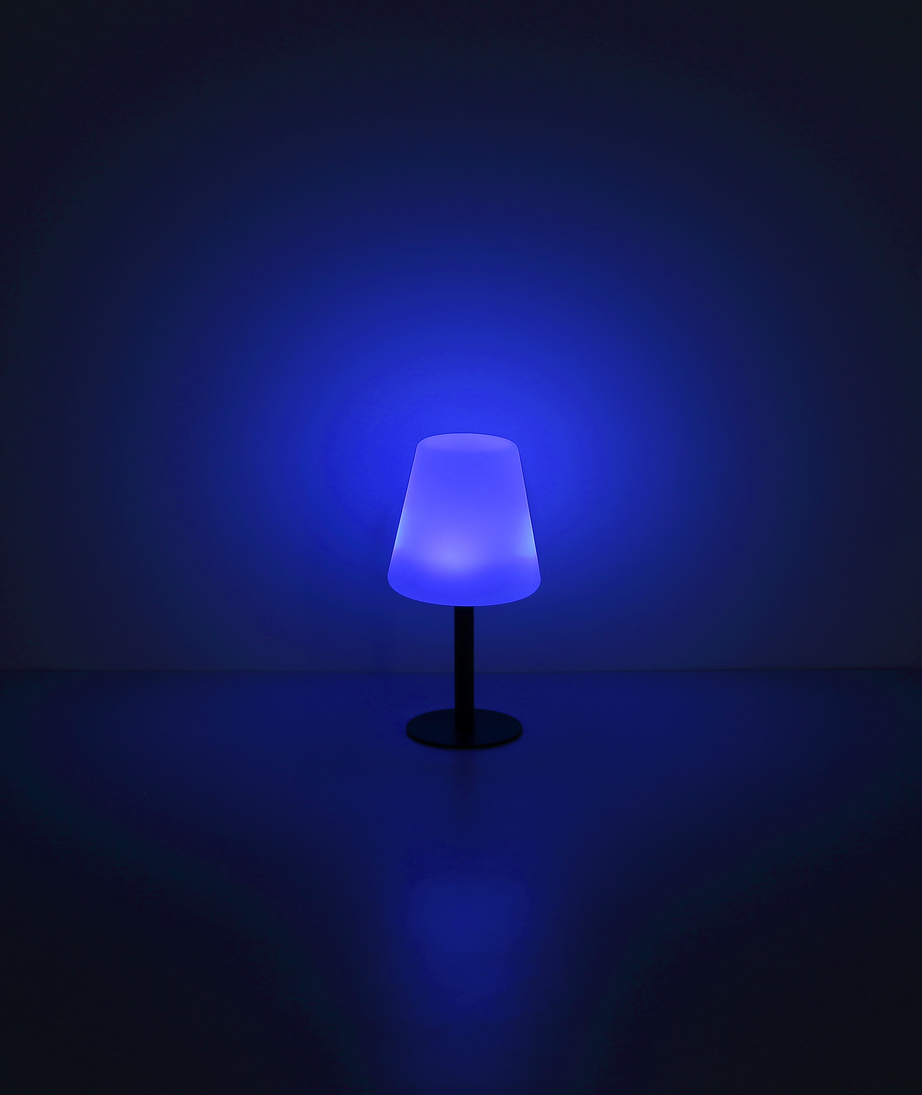 This simple solar lamp inspires with modern design and a great color scheme. A 30 cm long metal rod protrudes from a round black matt base to form a shapely shade (Ø 15 cm) with integrated RGBW LEDs. The luminaire has a 3000 Kelvin warm white light and can be changed and fixed in RGB colours by means of pressure and tap changers. In addition, an IP44 degree of protection against splashing water is given, making it perfect for outdoor use.