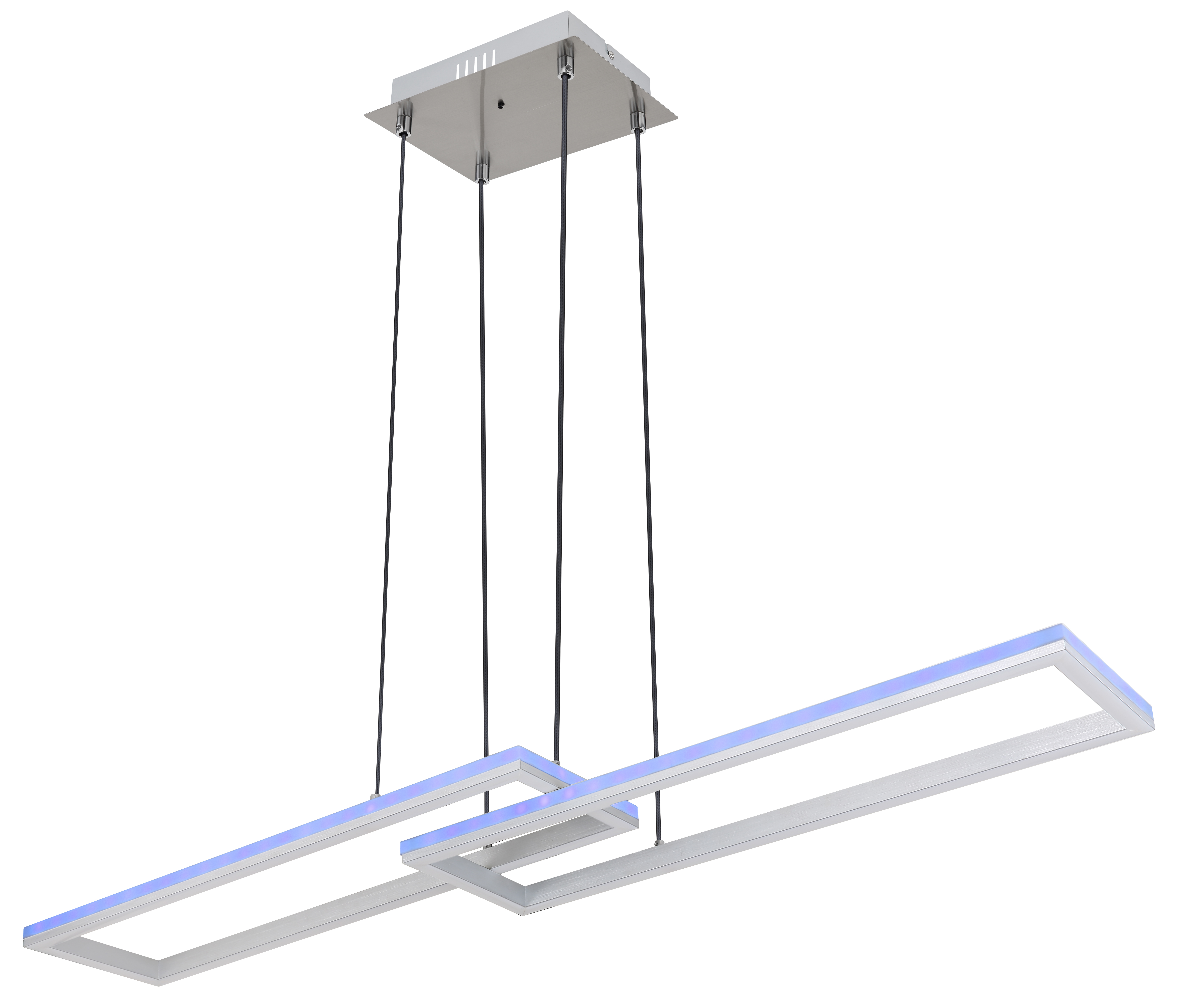 La lampada a sospensione ha un corpo realizzato in metallo grigio-argento e alluminio spazzolato e un paralume in plastica opalina. Il cavo è nero tessuto e la lampada è dimmerabile con diversi passaggi tramite l'interruttore a parete. È possibile fissare i colori e c'è un cambia colore RGB dove i colori possono anche essere fissati. C'è anche un effetto arcobaleno RGB, una funzione di memoria, una luce notturna, un timer e un telecomando (incluse 2 batterie AAA). Le dimensioni sono LxWxH: 1195x255x1200mm e la lampada contiene un LED con 40W e 230V, che ha una sorgente luminosa di sorgente 460-5150lm e 210-2300lm di uscita, oltre a un LED RGB con 5W e 230V. Il CCT (temperatura di colore) è 2700-6500K.