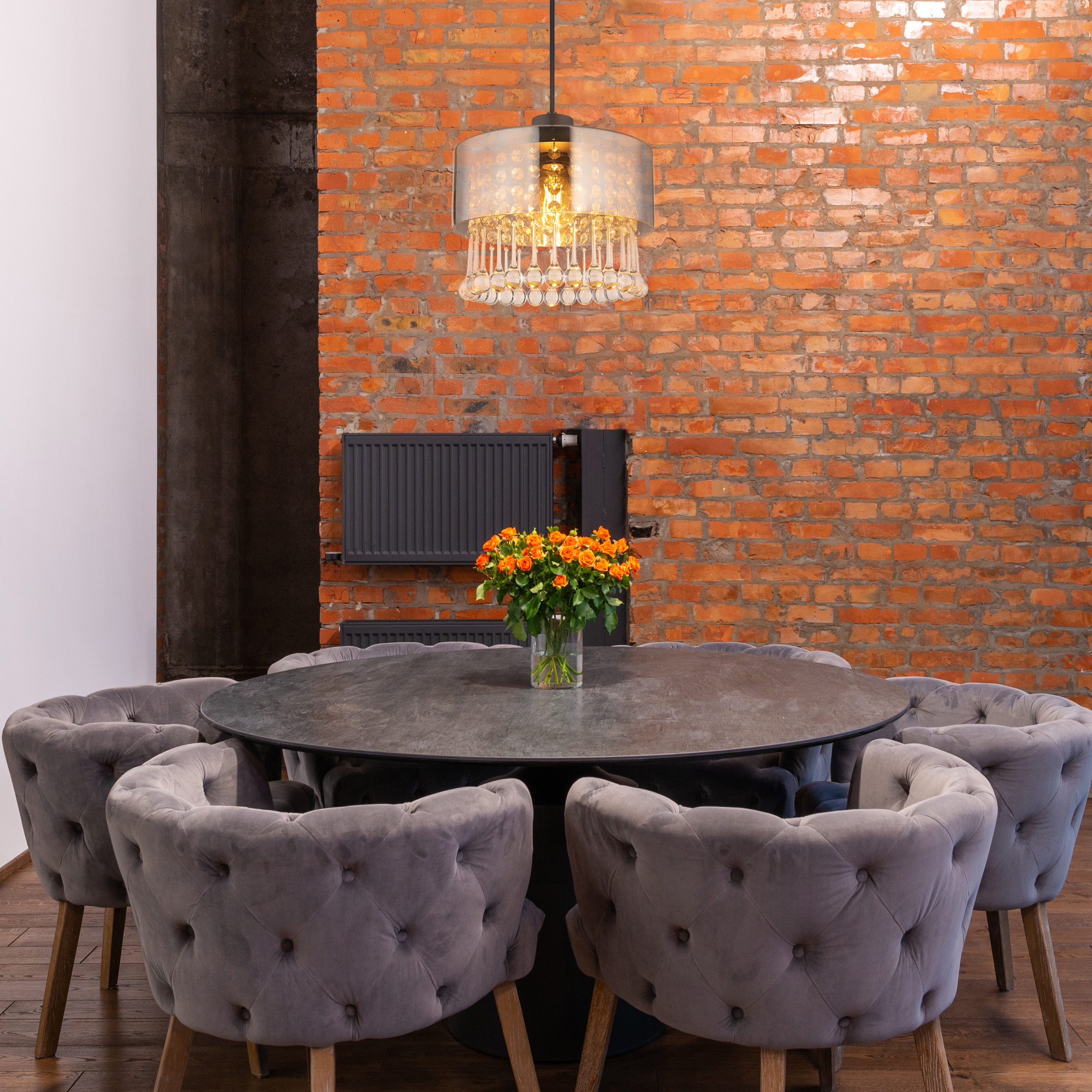 La lampada a sospensione HENDRY è un vero gioiello per qualsiasi stanza. Con il suo design rotondo e il paralume rifinito con cristalli scintillanti appesi all'interno, aggiungerà un tocco elegante e tradizionale alla tua casa. Il corpo della lampada a sospensione HENDRY è realizzato in metallo nero opaco, che le conferisce un aspetto nobile e senza tempo. Il paralume della lampada a sospensione HENDRY è realizzato in vetro color fumo ed è decorato con gocce acriliche trasparenti e cristalli di vetro. Questo crea un bellissimo gioco di luce e luce che immerge ogni stanza in un'atmosfera accogliente. Con un diametro di 250 mm, la lampada a sospensione HENDRY è ideale per ambienti più piccoli o come parte di un'installazione luminosa. Offre una luminosità sufficiente ed è un vero e proprio colpo d'occhio. La lampada a sospensione HENDRY è un perfetto esempio di illuminazione tradizionale con un tocco moderno. Attirerà sicuramente l'attenzione di tutti e bagnerà la tua casa di una luce radiosa.
