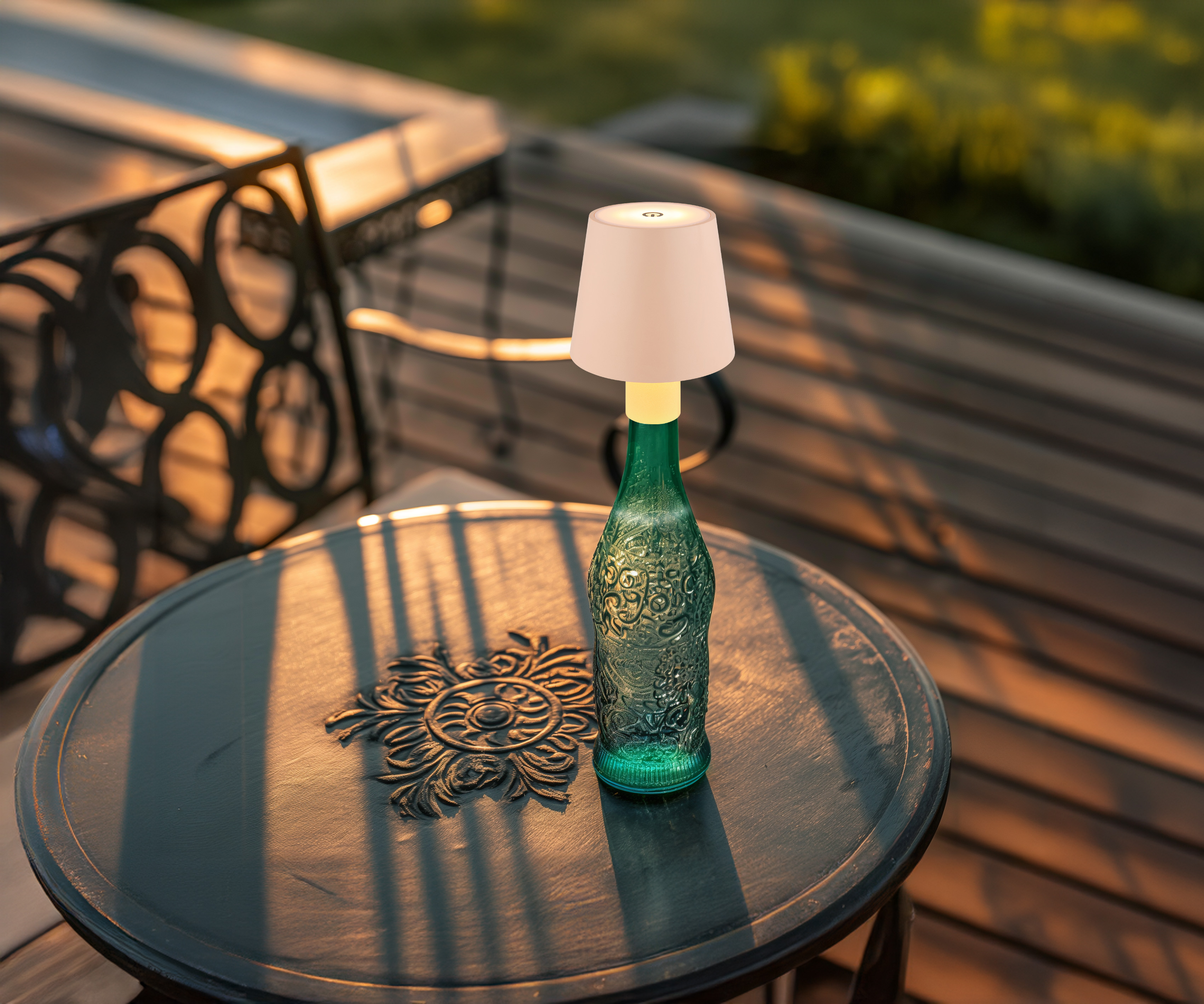 La lampada da tavolo VANNIE si presenta in una forma rotonda che crea un look elegante e minimalista. Il paralume è realizzato in plastica color pesca con finitura laccata opaca ed è completato da una piastra in plastica opalina. Questo paralume è appositamente progettato per essere posizionato su bottiglie, in modo che la lampada possa essere posizionata anche su supporti diversi. Le dimensioni della lampada da tavolo VANNIE sono ø 106 mm, il che significa che può essere inserita anche in piccoli ambienti. L'apparecchio ha una funzione dimmerabile che può essere azionata tramite un dimmer touch continuo. Inoltre, l'apparecchio dispone di una funzione di memoria che consente di salvare l'ultimo livello di luce. Un altro vantaggio è l'integrazione di un cavo di ricarica USB, che consente di caricare la batteria. La luce ha una funzione touch per l'accensione e lo spegnimento. L'apparecchio emette una quantità di luce effettiva di 130 lumen con una temperatura di colore di 3000 K. Il tempo di ricarica è di circa 4 ore, mentre il tempo di combustione è compreso tra 4 e 6 ore. La lampada da tavolo VANNIE è inoltre certificata IP44, il che ne consente l'utilizzo in ambienti umidi. Per posizionare sulle bottiglie, è necessaria un'altezza fino a 3 cm al collo della bottiglia.