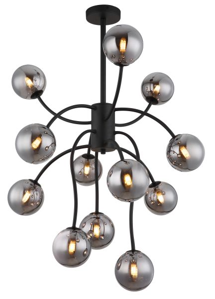 La lampada da soffitto RIHA si presenta in una forma rotonda che crea un look elegante e minimalista. L'attrazione speciale di questa lampada sono i 12 bracci curvi, ognuno dei quali porta una sfera di vetro. Le sfere di vetro sono di colore fumé e conferiscono alla lampada un design unico. Il corpo della lampada è realizzato in metallo laccato nero, che presenta una superficie opaca. Le dimensioni della lampada da soffitto RIHA sono ø 700 mm, il che significa che può essere inserita anche in ambienti di piccole dimensioni. L'apparecchio ha un'emissione luminosa effettiva di 130 lumen a una temperatura di colore di 3000 K. Questa combinazione di design e qualità della luce rende la plafoniera RIHA un ottimo accessorio per l'interior design