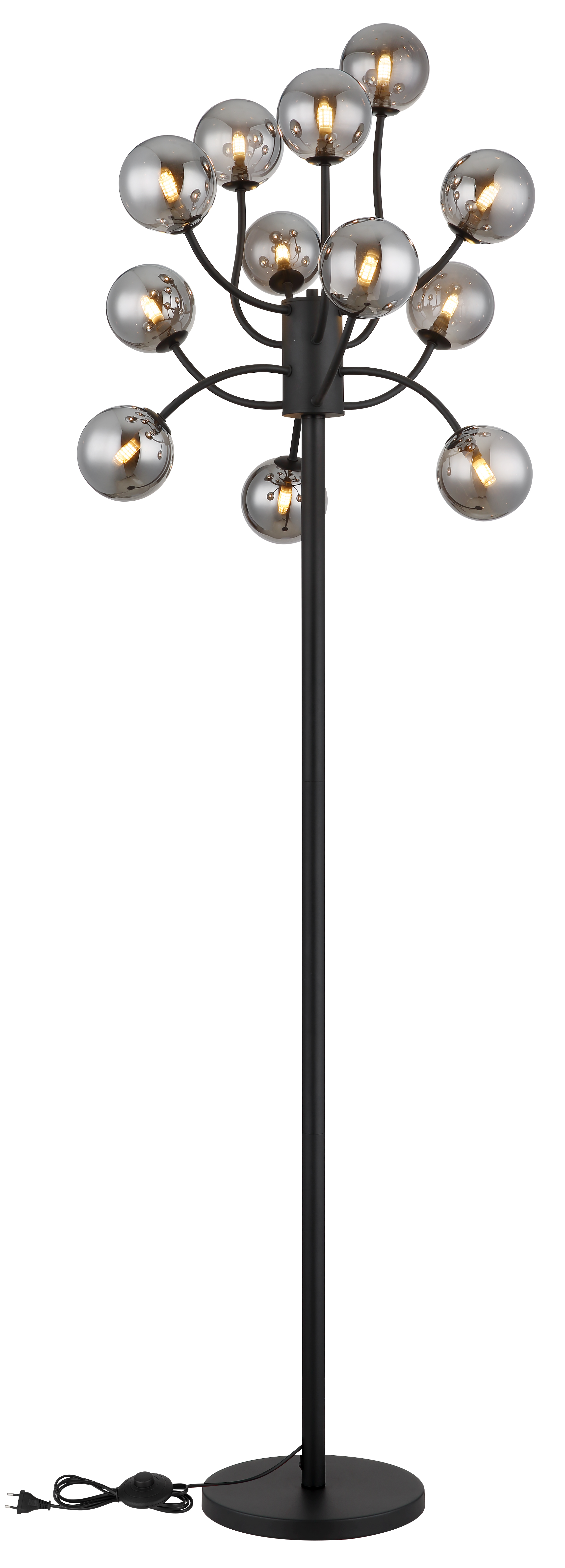 La lampada da terra RIHA colpisce per il suo design e i 12 bracci curvi decorati con sfere di vetro color fumo. Il corpo in metallo nero e l'interruttore a pedale nel cavo offrono funzionalità ed eleganza. Con una potenza luminosa di 130 lumen e una temperatura della luce di 3000 K, questo apparecchio fornisce un'illuminazione morbida e invitante. Ideale per soggiorni moderni o angoli lettura che necessitano di una fonte di luce elegante.