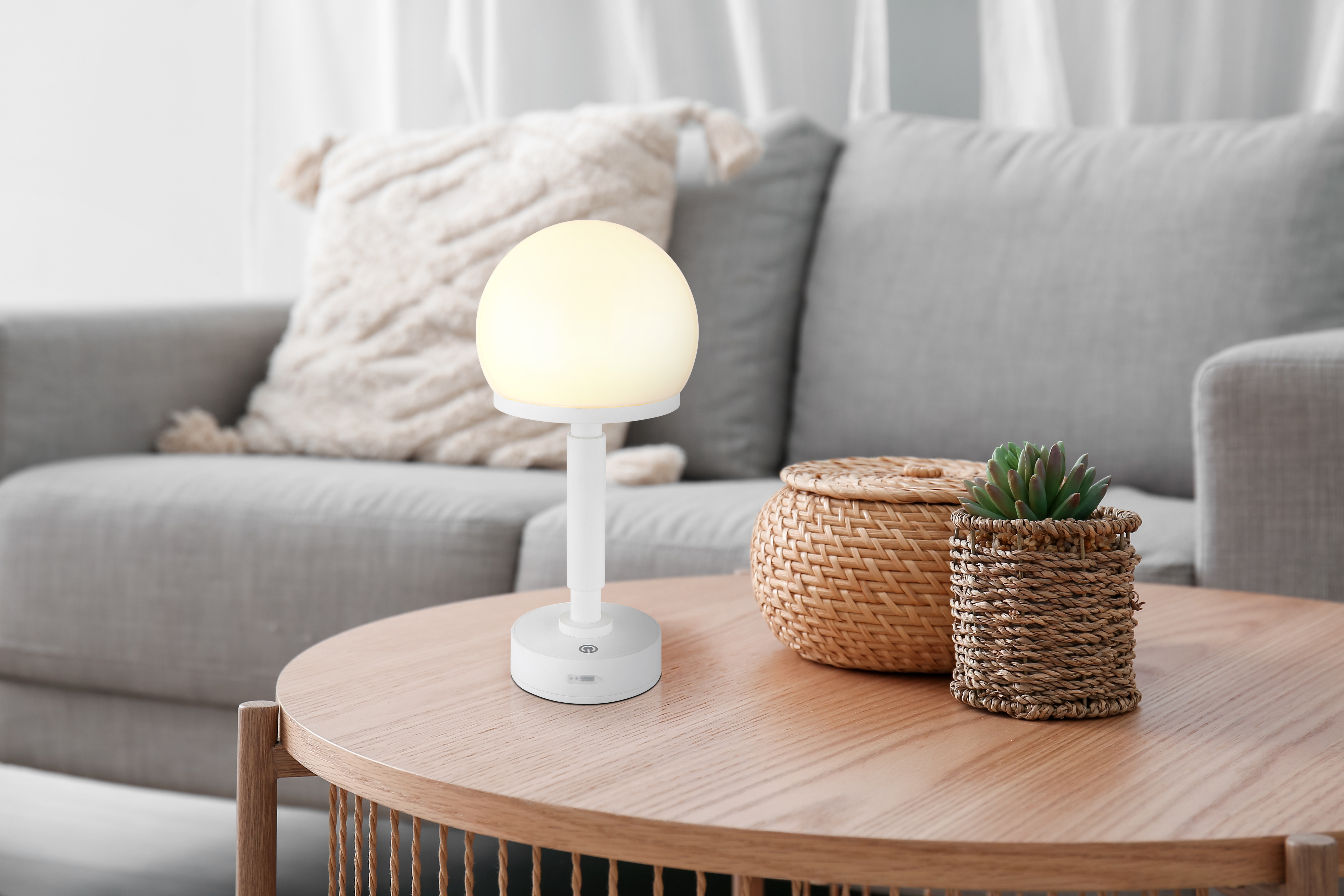 La lampada da tavolo HAKU in bianco opaco in plastica combina un design moderno con funzioni pratiche. Con la sua forma rotonda, il tubo dritto e la semisfera, emana un'eleganza senza tempo. Il paralume in plastica opalina garantisce una distribuzione uniforme della luce e crea un'atmosfera piacevole nella stanza. Un dimmer touch integrato consente di regolare la luminosità della lampada come si desidera, mentre il cavo di ricarica USB incluso garantisce una facile ricarica. La lampada da tavolo offre un flusso luminoso di 60 lumen e una temperatura di colore calda di 3000 Kelvin, ideale per un'illuminazione d'atmosfera in varie zone giorno. Il tempo di ricarica è di circa 4 ore e il tempo di illuminazione dura circa 6 ore, con la luce che può essere utilizzata anche durante la ricarica. Questa lampada da tavolo è perfetta per comodini, scrivanie o come elemento decorativo su tavolini, dove unisce la funzionalità agli standard estetici.