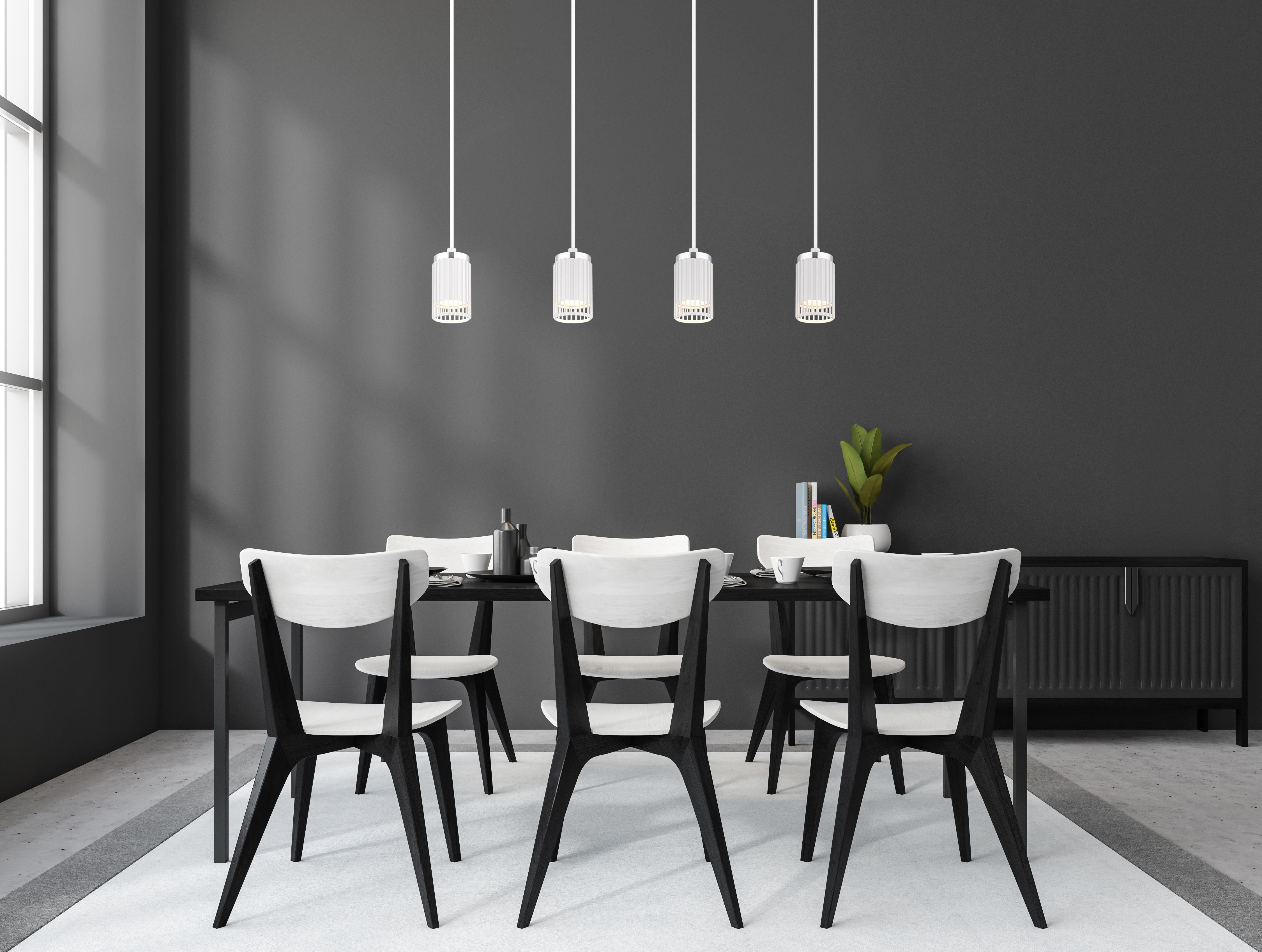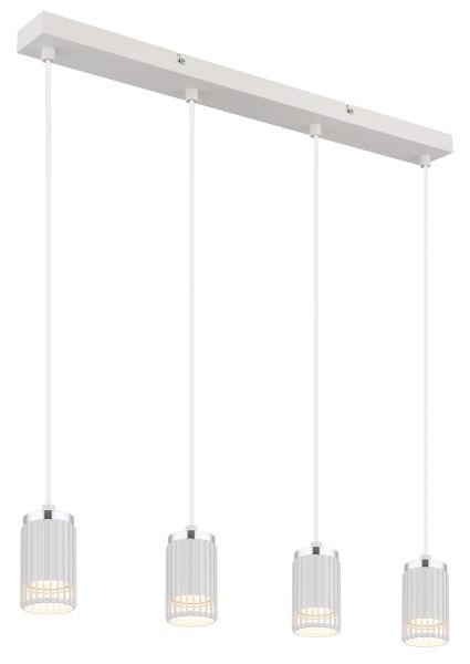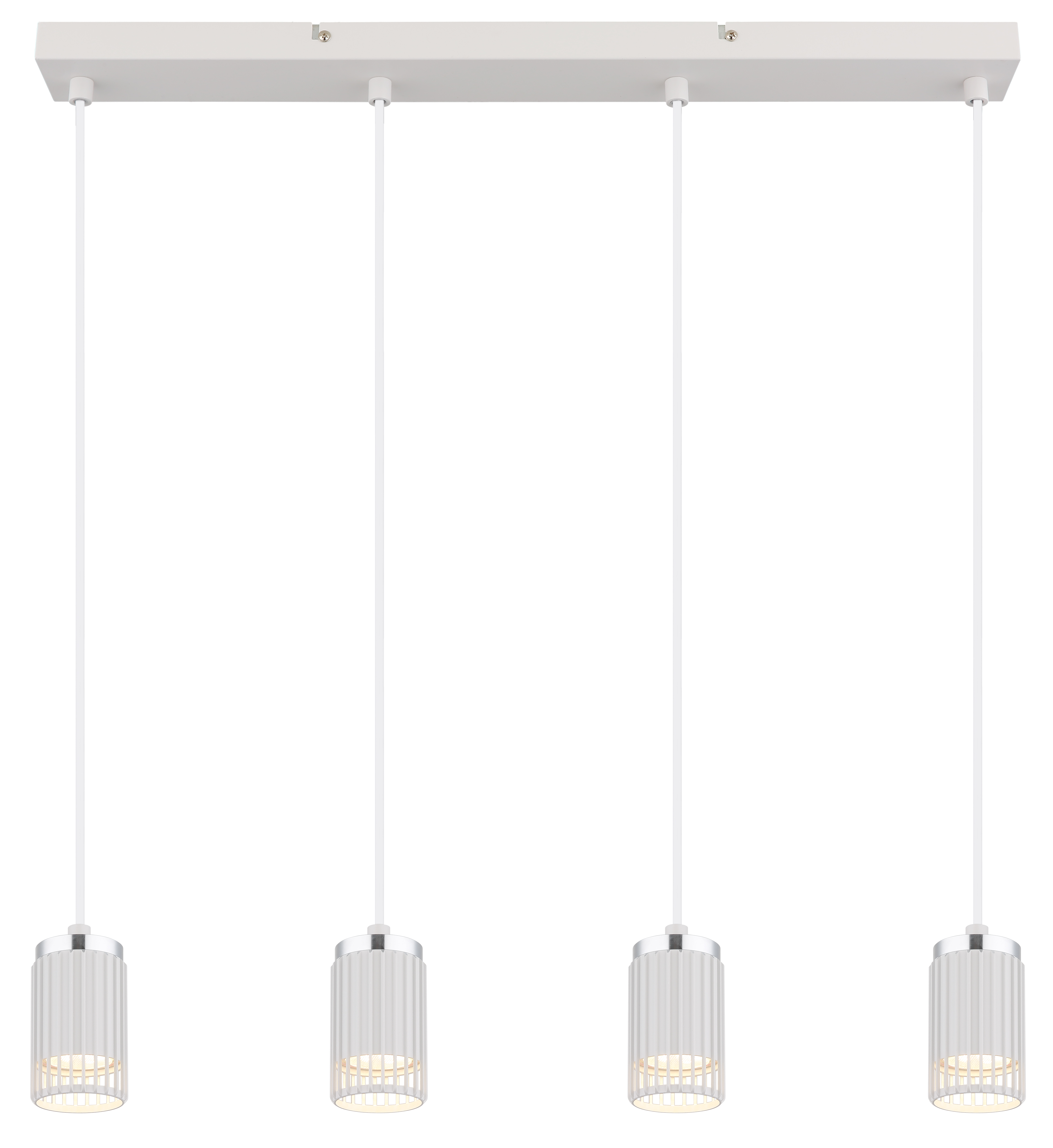 Con il suo design chiaro, la lampada a sospensione KORBEN pone accenti moderni in ogni stanza. La lampada rettangolare è caratterizzata da quattro paralumi cilindrici, rifiniti in un elegante bianco opaco e montati su aste. I paralumi sono aperti nella parte anteriore e sono realizzati in alluminio di alta qualità, che convince sia nella versione bianca opaca che in quella cromata. Con le sue dimensioni compatte di 600 mm di lunghezza e 60 mm di larghezza, il KORBEN si adatta perfettamente ai tavoli da pranzo o alle isole della cucina. La lampada a sospensione è predisposta per 4 faretti GU10, che forniscono un'eccellente resa luminosa. La combinazione del corpo in metallo bianco opaco e degli eleganti paralumi in alluminio conferisce alla lampada un design moderno e allo stesso tempo senza tempo. La lampada a sospensione KORBEN non offre solo un'illuminazione funzionale, ma anche un elegante richiamo visivo per la tua casa.