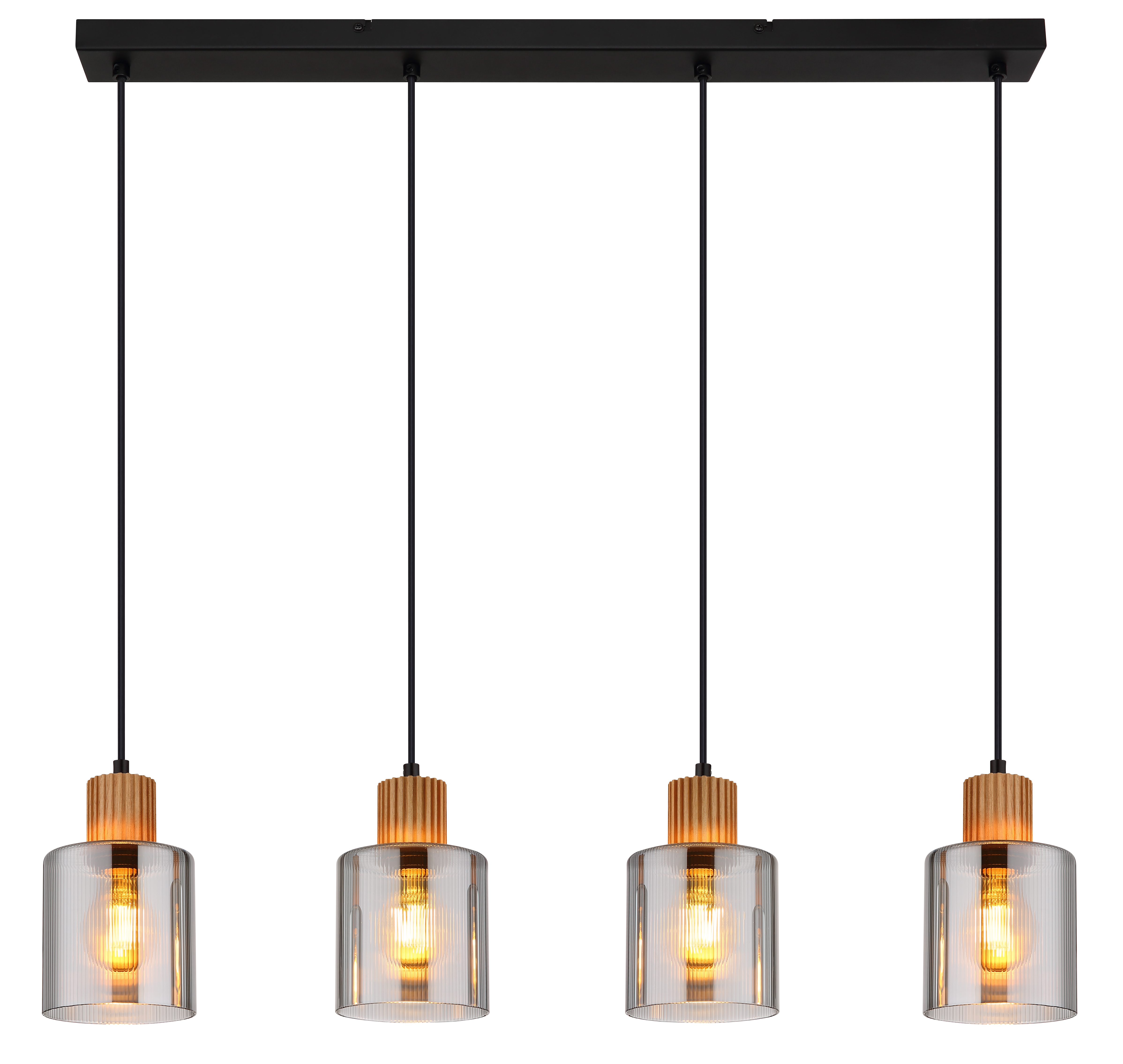 La lampada a sospensione ALEIDIS offre quattro eleganti pendenti in vetro con applicazioni in legno dal design allungato. Il corpo in metallo nero opaco e le lenti fumé si abbinano perfettamente agli accenti del legno marrone scuro. Questo apparecchio è adatto per lampadine 4xE27 (esclusive).