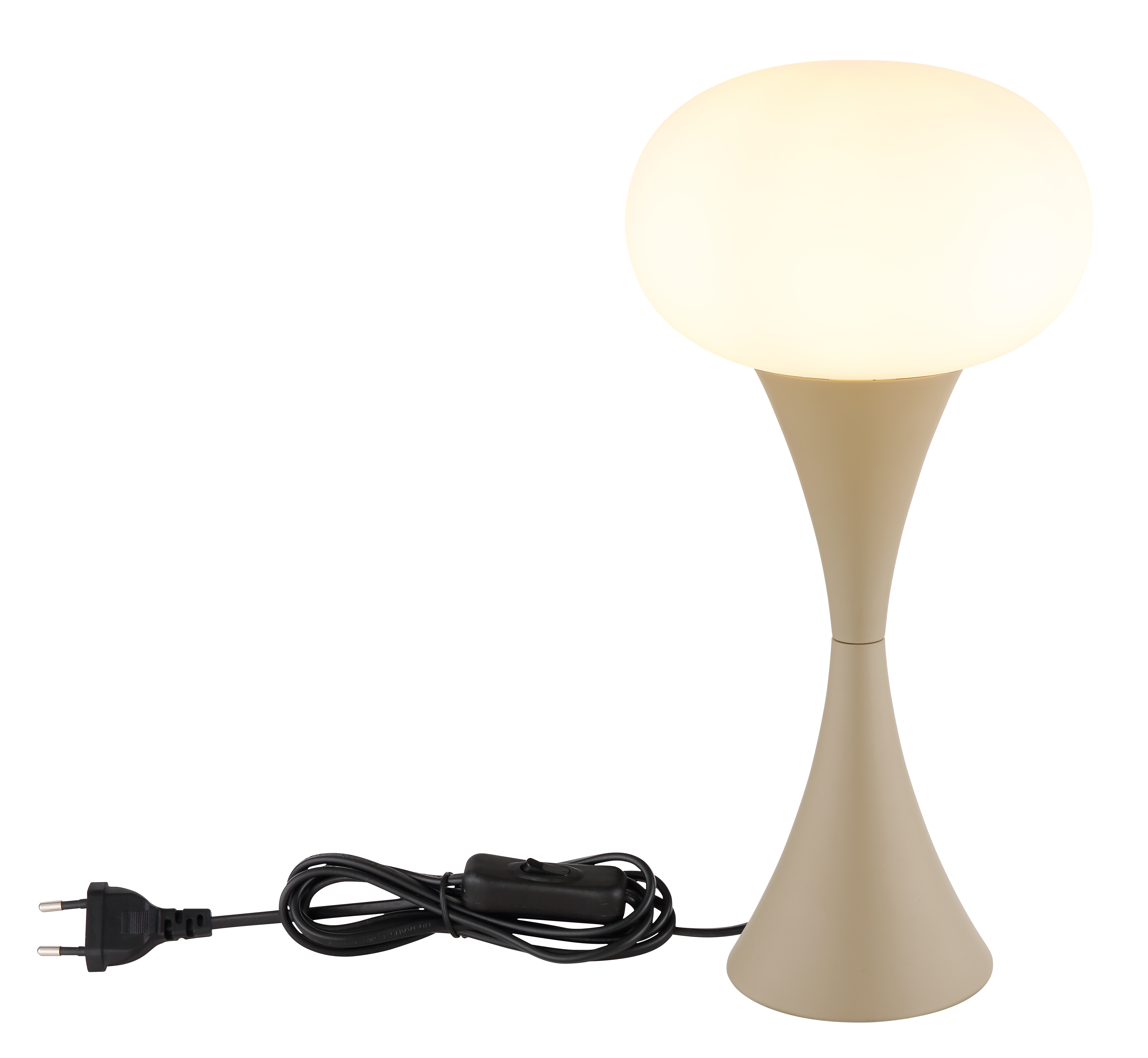 La lampada da tavolo RONALD con corpo in metallo opaco color sabbia e paralume in vetro color opale crea accenti tenui e caldi in ogni stanza. L'interruttore a bilanciere sul cavo lo rende facile da usare. Adatto per lampadine E14 (esclusivo).