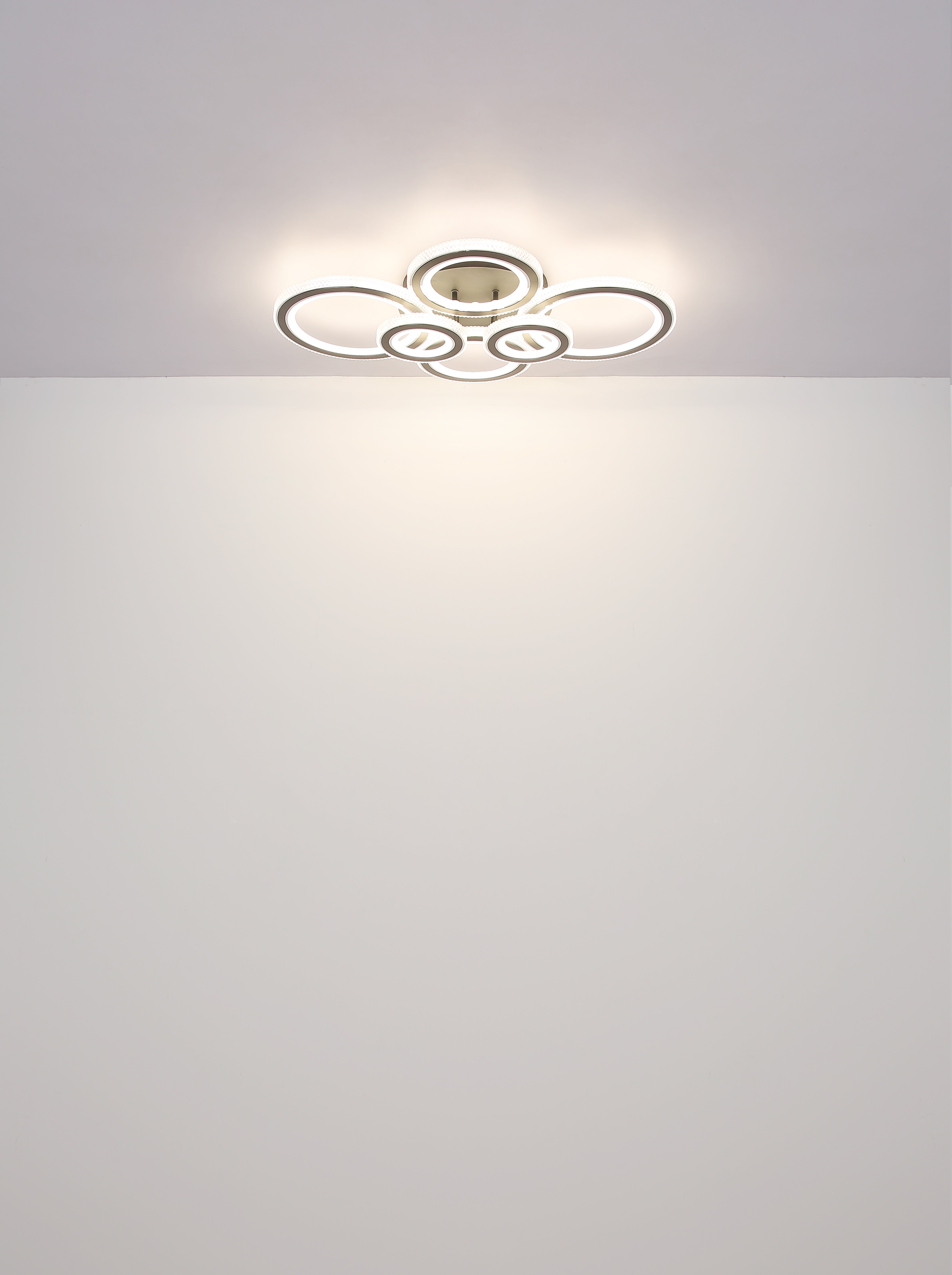 La lampada da soffitto Kora convince per il suo design moderno e rettangolare e i 6 anelli sfalsati. Il corpo in metallo nero opaco e il paralume in metallo antracite-opaco e acrilico opalino forniscono un'illuminazione elegante. La luce è dimmerabile e permette di fissare i colori. Con una funzione di memoria e una luce notturna, offre un design di illuminazione versatile. La potenza luminosa di 2890 lumen e la CCT da 2700 K a 6000 K forniscono un'illuminazione piacevole in qualsiasi stanza.