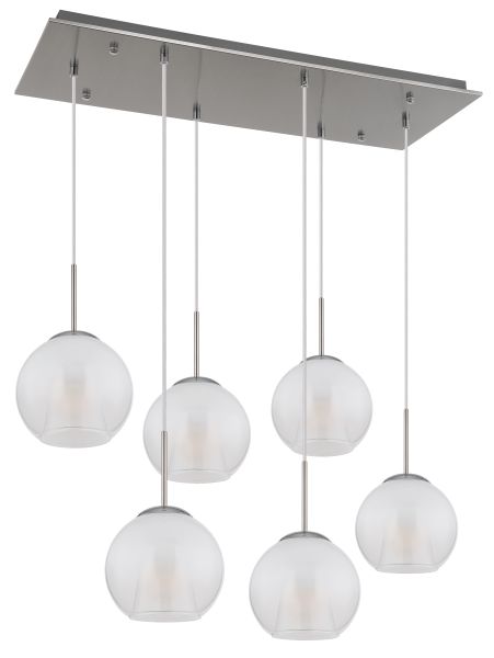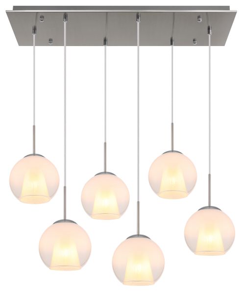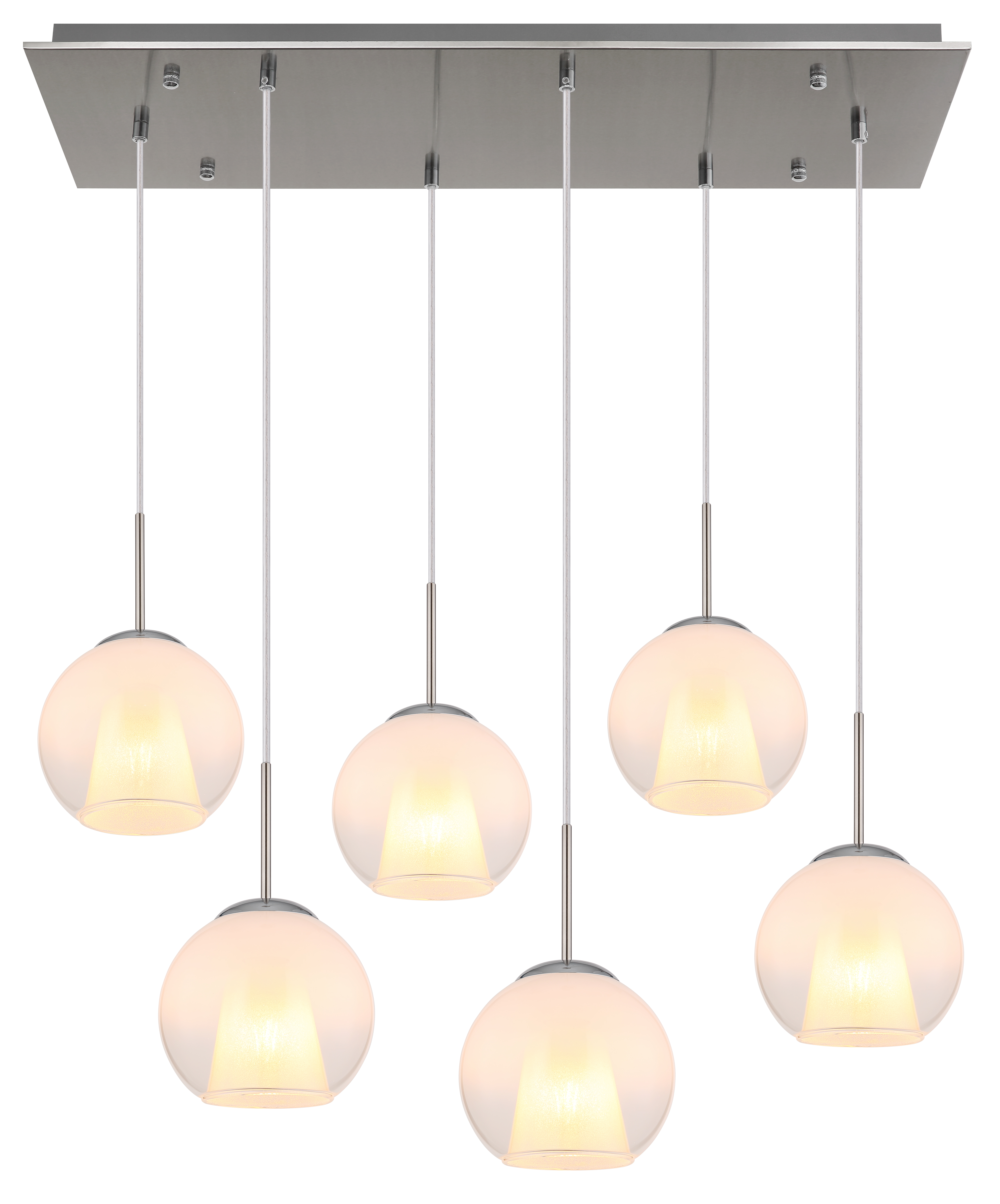 La lampada a sospensione rettangolare BARRY con sei sfere di vetro combina un design elegante con la funzionalità. Con una lunghezza di 900 mm e una larghezza di 380 mm, è perfetto per grandi sale da pranzo o cucine. Il corpo in metallo nichelato opaco e metallo cromato sottolinea l'estetica moderna. Le sfere di vetro opalino e trasparente assicurano una distribuzione uniforme e piacevole della luce. Gli accenti interni in cristallo creano ulteriori accenti e creano un'atmosfera luminosa armoniosa. L'attacco E27 consente una progettazione illuminotecnica individuale.