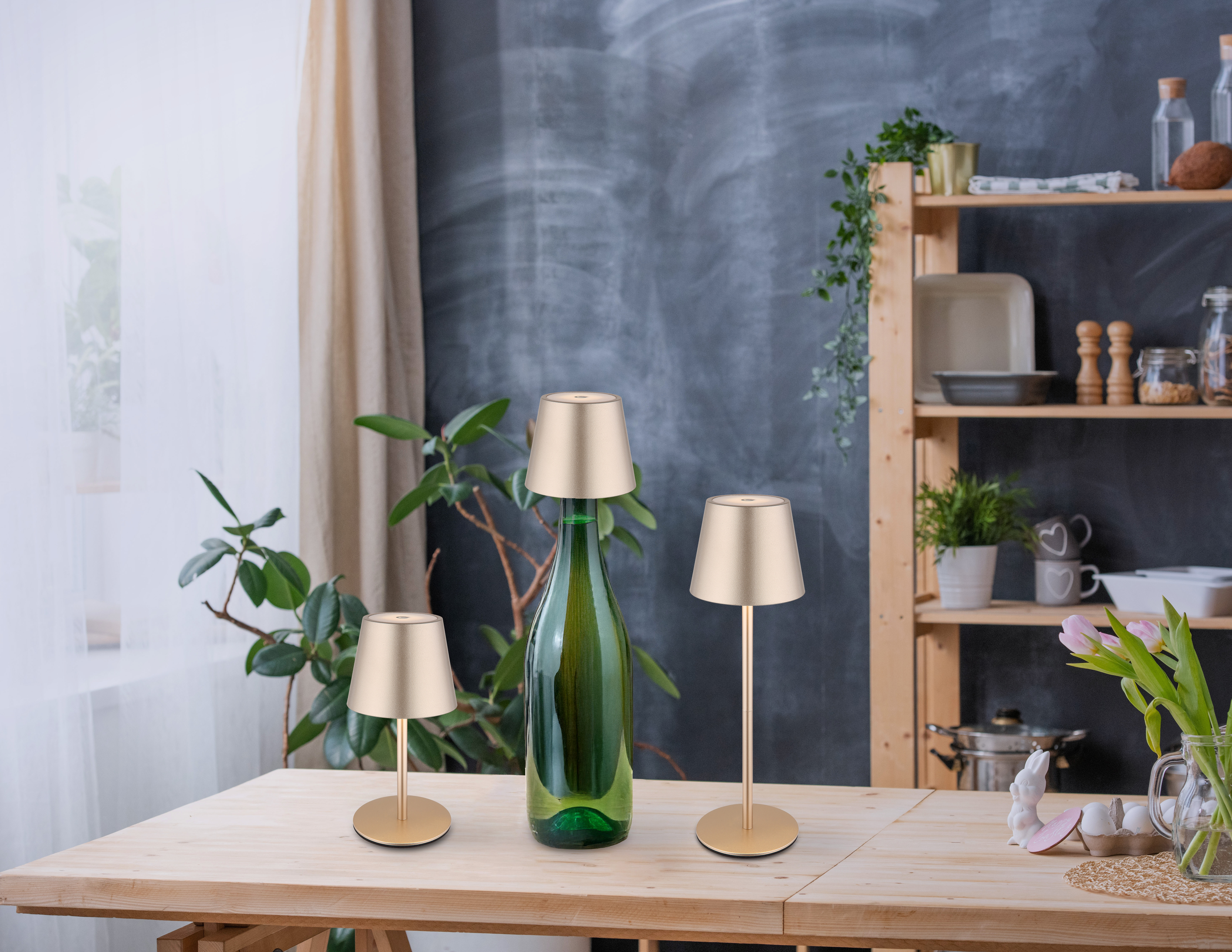 La lampada da tavolo VANNIE I offre un design versatile e una tecnologia moderna in un'elegante finitura champagne. Il corpo rotondo e il paralume in plastica opaca color opale champagne conferiscono alla lampada un aspetto elegante. La VANNIE I può essere utilizzata in modo flessibile con tre diversi usi: come lampada da tavolo con uno o due tubi o come attacco per bottiglia (incluso). Grazie a un dimmer touch continuo, la luminosità può essere regolata con precisione e il colore della luce desiderato da 3000 K a 5000 K può essere fissato. Con una potenza luminosa di 200 lumen e la pratica funzione touch-on/off, questo apparecchio offre un'illuminazione piacevole che si adatta alle esigenze dell'utente. VANNIE I può essere comodamente ricaricato tramite il cavo di ricarica USB incluso, con un tempo di ricarica di circa 3 ore e un'autonomia fino a 4 ore. Particolarmente pratico: la luce rimane attiva anche durante il processo di ricarica. Con la protezione IP54 e la moderna tecnologia LED, non è solo funzionale, ma anche durevole.
