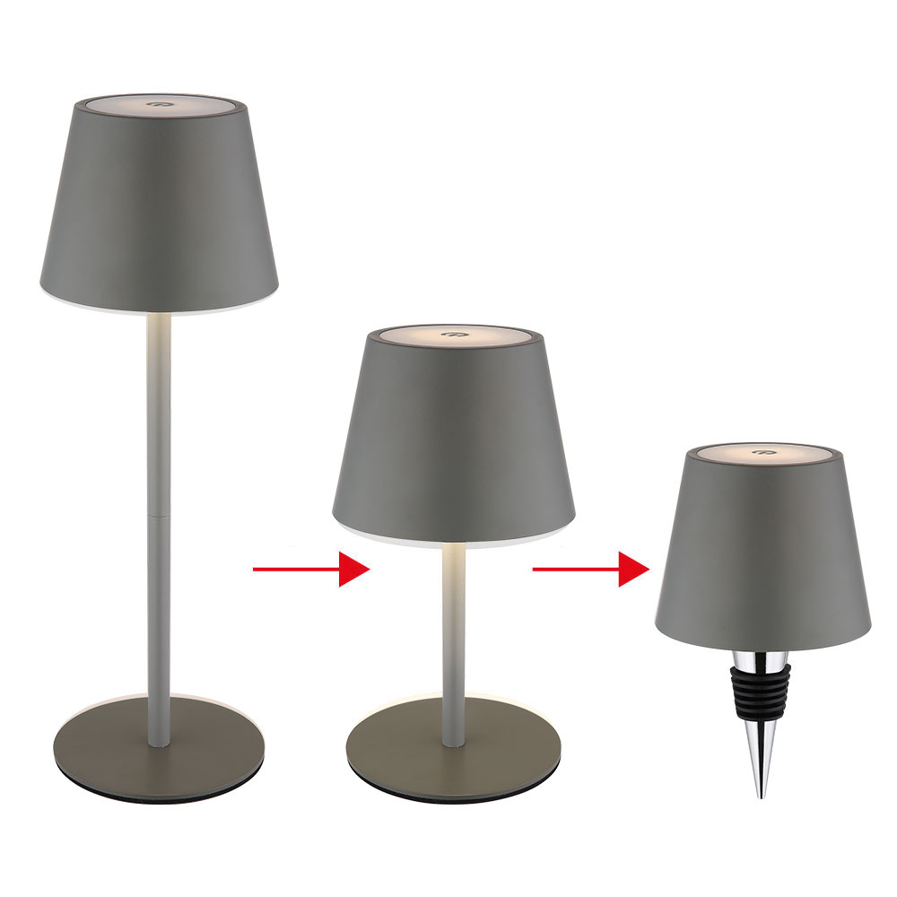La lampada da tavolo VANNIE I convince per il suo design moderno e versatile e i materiali di alta qualità in un elegante grigio. Il corpo rotondo in metallo opaco e il paralume in plastica grigio opalino conferiscono alla lampada un aspetto nobile. Offre tre diversi utilizzi: come lampada da tavolo con uno o due tubi o come attacco per bottiglia (incluso). Con un dimmer touch continuo, la luminosità può essere regolata in modo flessibile e il colore della luce può essere fissato tra 3000 K e 5000 K. Il VANNIE I eroga una potenza di 200 lumen ed è dotato di una pratica funzione touch-on/off. La lampada si ricarica tramite cavo di ricarica USB, con un tempo di ricarica di circa 3 ore e una durata fino a 4 ore. Un vantaggio speciale: VANNIE I si accende anche durante la ricarica. Grazie alla classe di protezione IP54 e alla moderna tecnologia LED, questo apparecchio non è solo elegante, ma anche resistente e ideale per vari usi.