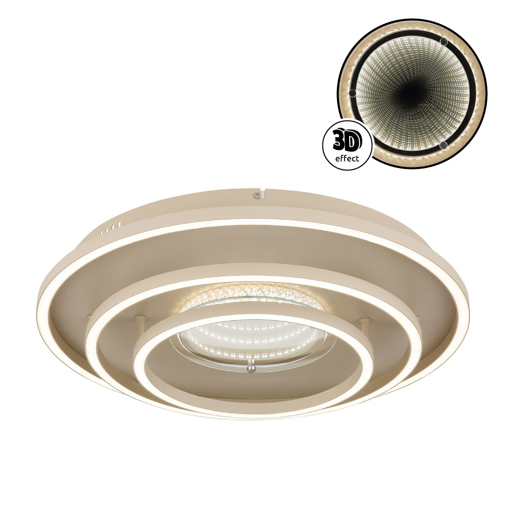 La lampada da soffitto rotonda LAWANDA colpisce per il design moderno con tre anelli LED e un effetto tunnel centrale che conferisce alla luce un tocco elegante. Il corpo in metallo opaco color sabbia offre stabilità ed eleganza senza tempo, mentre il paralume in alluminio opaco color sabbia, combinato con plastica opale e vetro 3D specchiato, assicura una distribuzione uniforme, senza abbagliamento e di stile. Con un diametro di 511 mm, il LED integrato fornisce 1461 lumen con temperatura colore regolabile da 3000 K a 6000 K. I colori sono fissi e la funzione memoria ricorda l’ultima impostazione, permettendo di personalizzare l’atmosfera luminosa. Questa lampada da soffitto combina design moderno, tecnologia LED innovativa e materiali di alta qualità, diventando un elegante punto focale in ogni stanza.