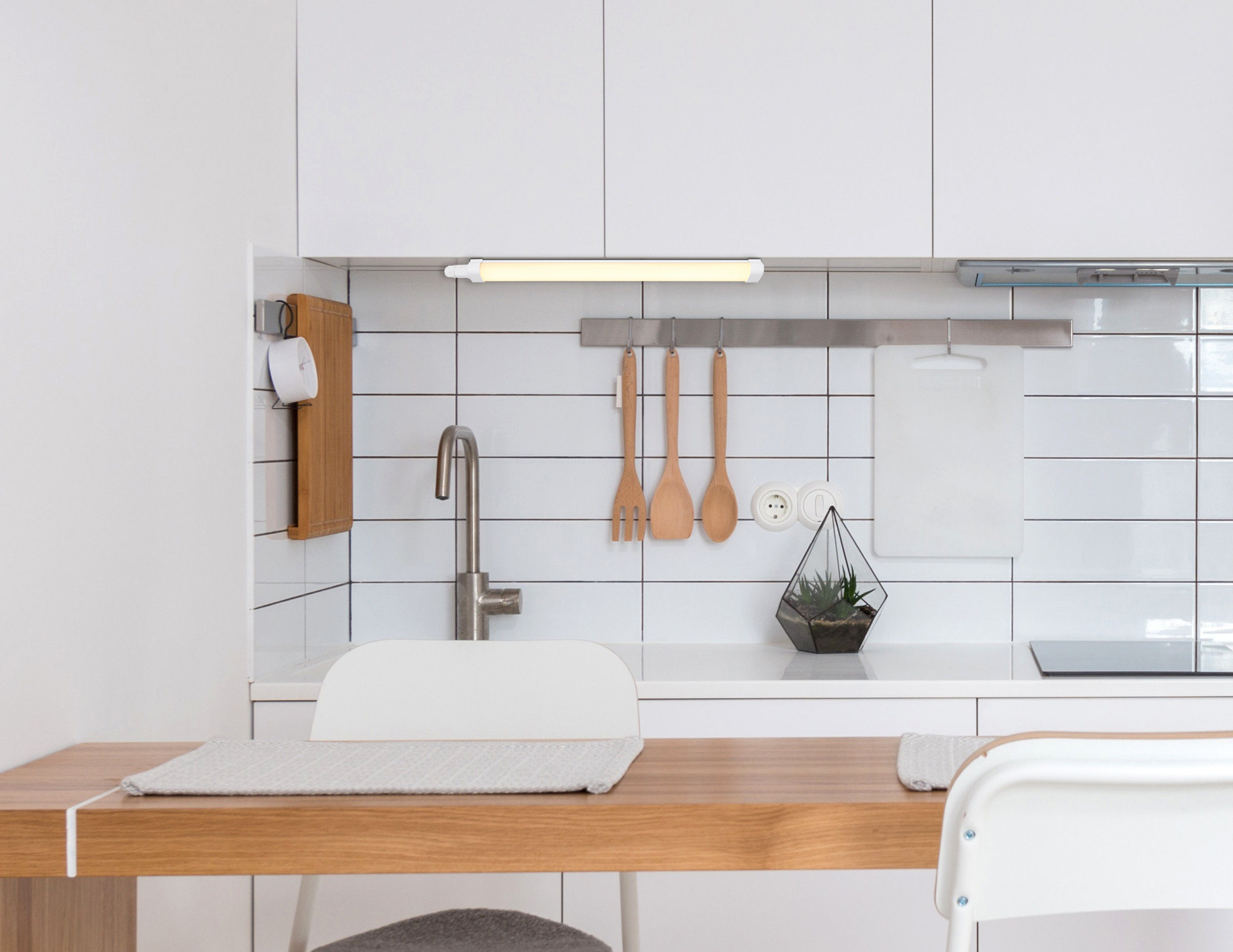 La lampada sottopensile piatta VILLY convince per il suo design tecnico ed è perfetta per illuminare mobili della cucina, scaffali o aree di lavoro. Il corpo in plastica bianca garantisce un aspetto semplice e moderno, mentre il paralume in plastica opalina diffonde la luce in modo uniforme e garantisce un'illuminazione piacevole. Con una lunghezza di 550 mm e una larghezza di soli 53 mm, la lampada si adatta a quasi tutti i profili della sottostruttura e si integra discretamente nei vostri interni. Il LED incluso fornisce un'illuminazione bianca calda da 3000 K, che crea un'atmosfera accogliente. Grazie alla classe di protezione IP65, l'apparecchio è protetto dalla polvere e dai getti d'acqua ed è quindi ideale per l'uso in ambienti umidi. Dotata di due clip di montaggio e di un collegamento esterno, la lampada da sottopensile VILLY è facile da installare e offre una soluzione di illuminazione efficiente e di lunga durata.