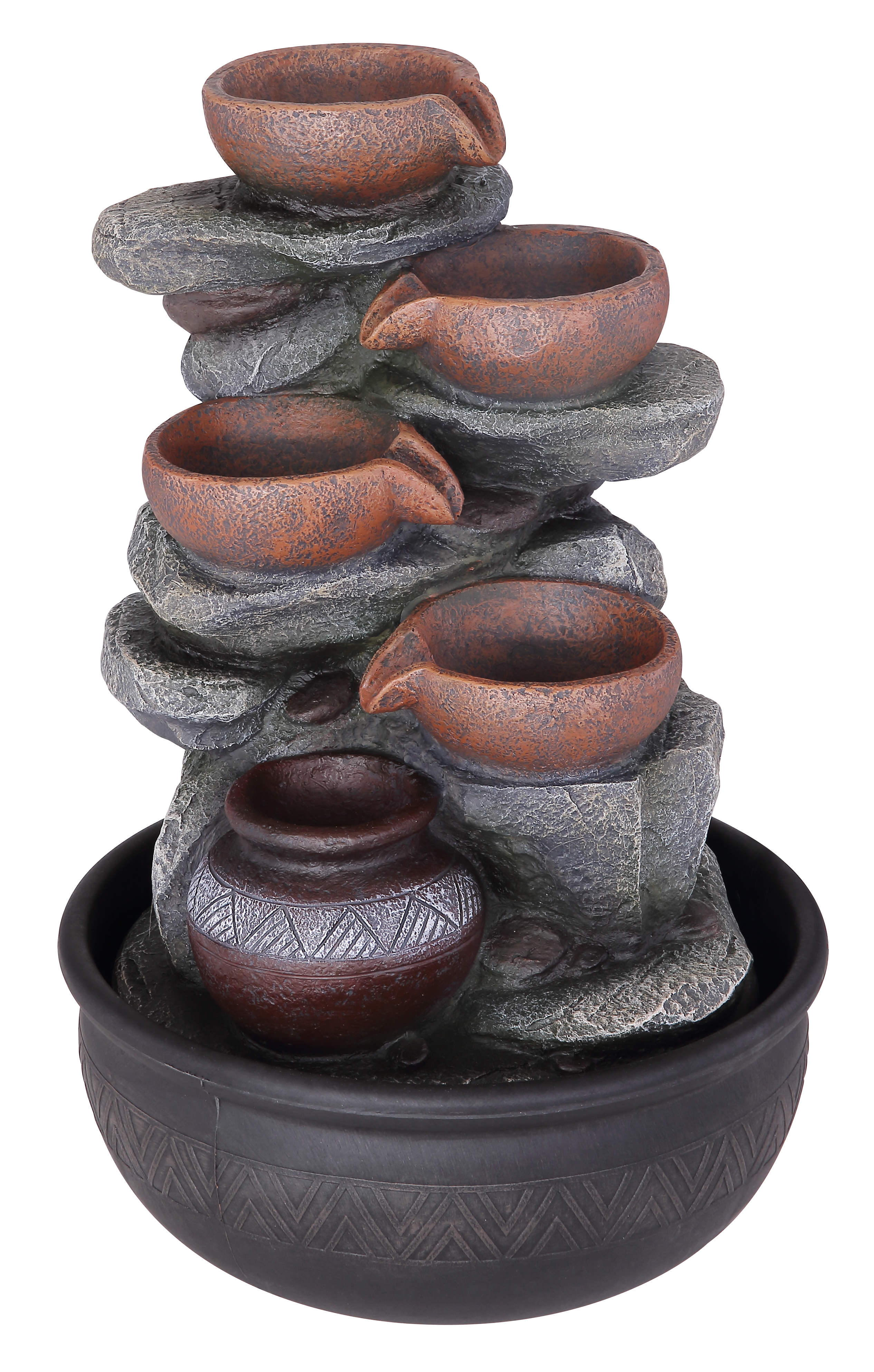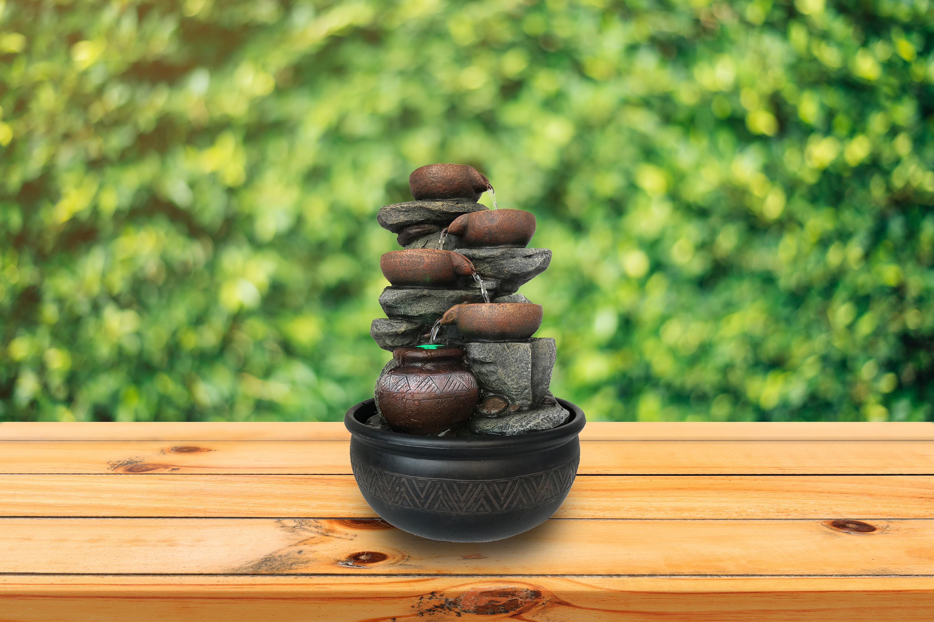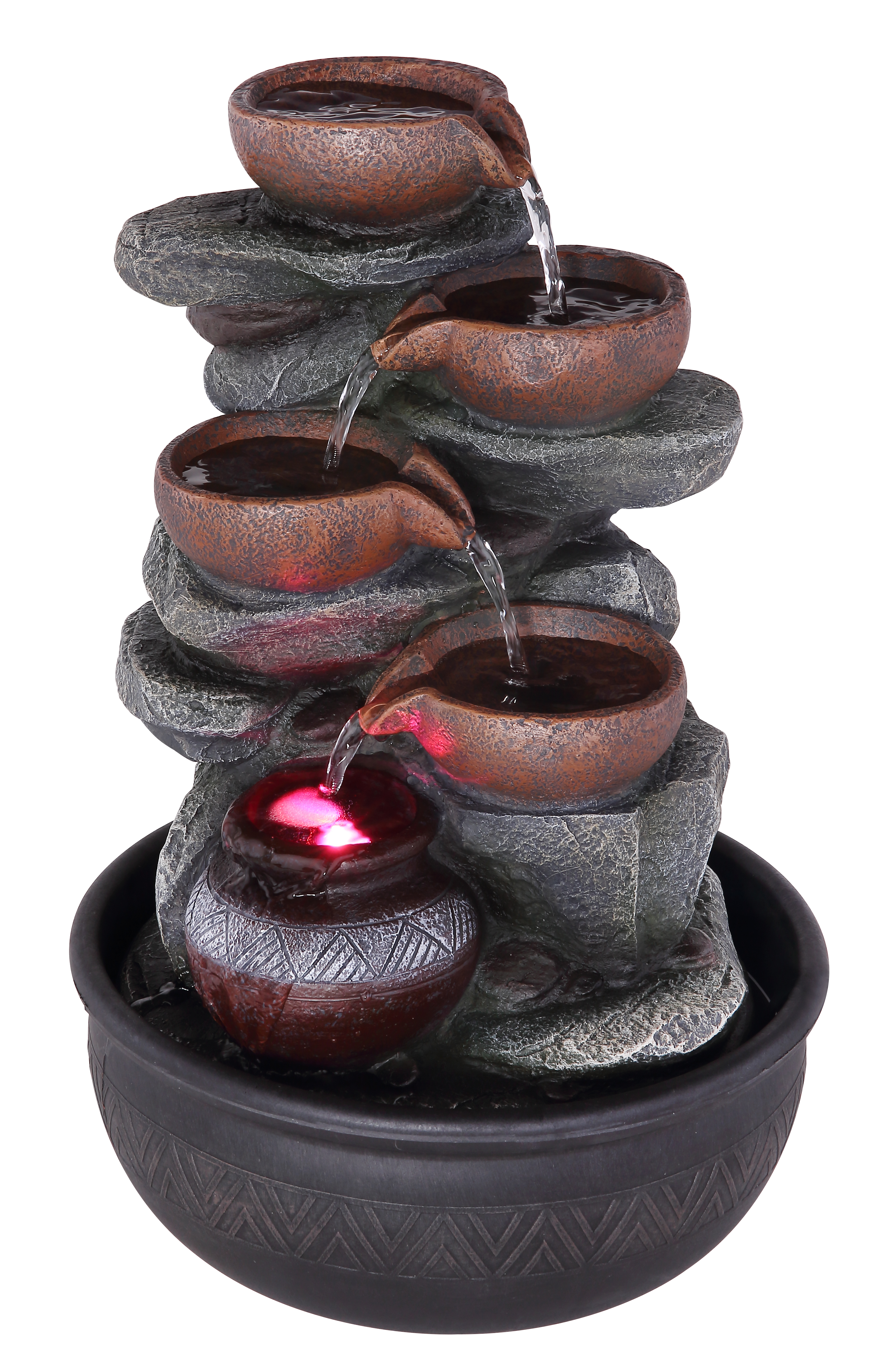 La fontana da tavolo FONTANA (alta quasi 40 cm) con il motivo della fontana potrebbe diventare il centro dell'attenzione in ogni zona. La fontana da interno in plastica nera e grigia ha una pompa inclusa e offre con la lampada a LED incorporata la luce giusta, che può anche essere cambiata di colore. Nella stessa serie di prodotti si possono trovare altre fontane di questo tipo.