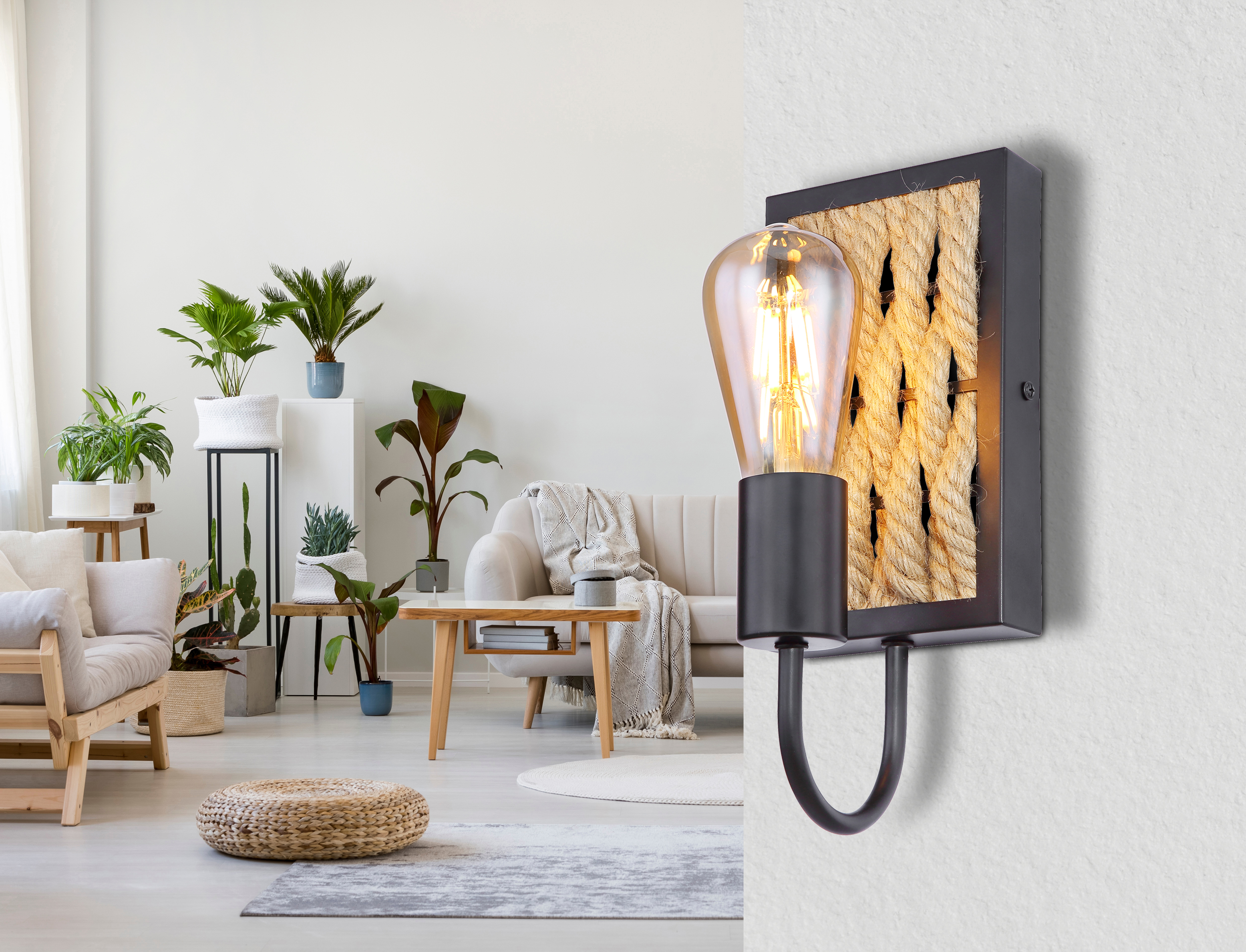 Questa applique della serie Halia è una meravigliosa aggiunta ad ogni ambiente interno. La applique alta 28 cm è composta da un cuboide di legno largo 12 cm, la cui superficie è dotata di corda di canapa. Nella parte inferiore del cuboide, c'è un'asta di metallo nero opaco che è piegata in avanti e alla quale è fissata una presa E27. Questo può essere montato con una lampadina adatta di propria preferenza, permettendo a ciascuno di determinare il colore della luce e la luminosità secondo le proprie preferenze. Con altri modelli della stessa serie, si può completare il quadro generale di ogni ambiente interno e creare un ambiente elegante.