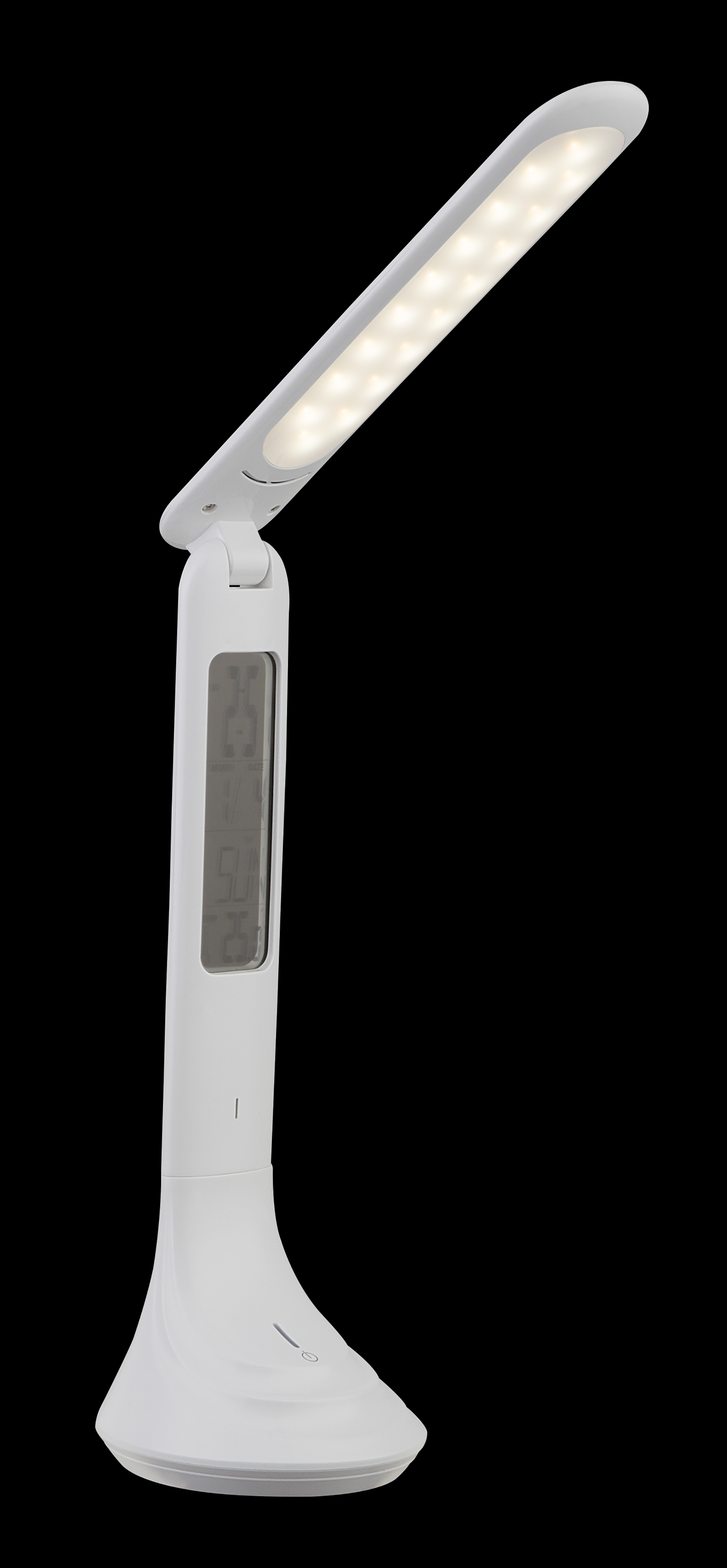 Questa grande lampada da tavolo si distingue per la sua funzionalità. La luminosità può essere regolata in tre fasi tramite il touch dimmer integrato. Il display integrato nell'alloggiamento in plastica bianca permette di leggere l'ora e la data. La funzione sveglia completa il pacchetto di prestazioni. L'illuminazione del display può essere azionata tramite un interruttore separato. La lampada da tavolo è dotata di batterie ricaricabili integrate, che ne consentono l'utilizzo al di fuori dell'alimentazione di rete.