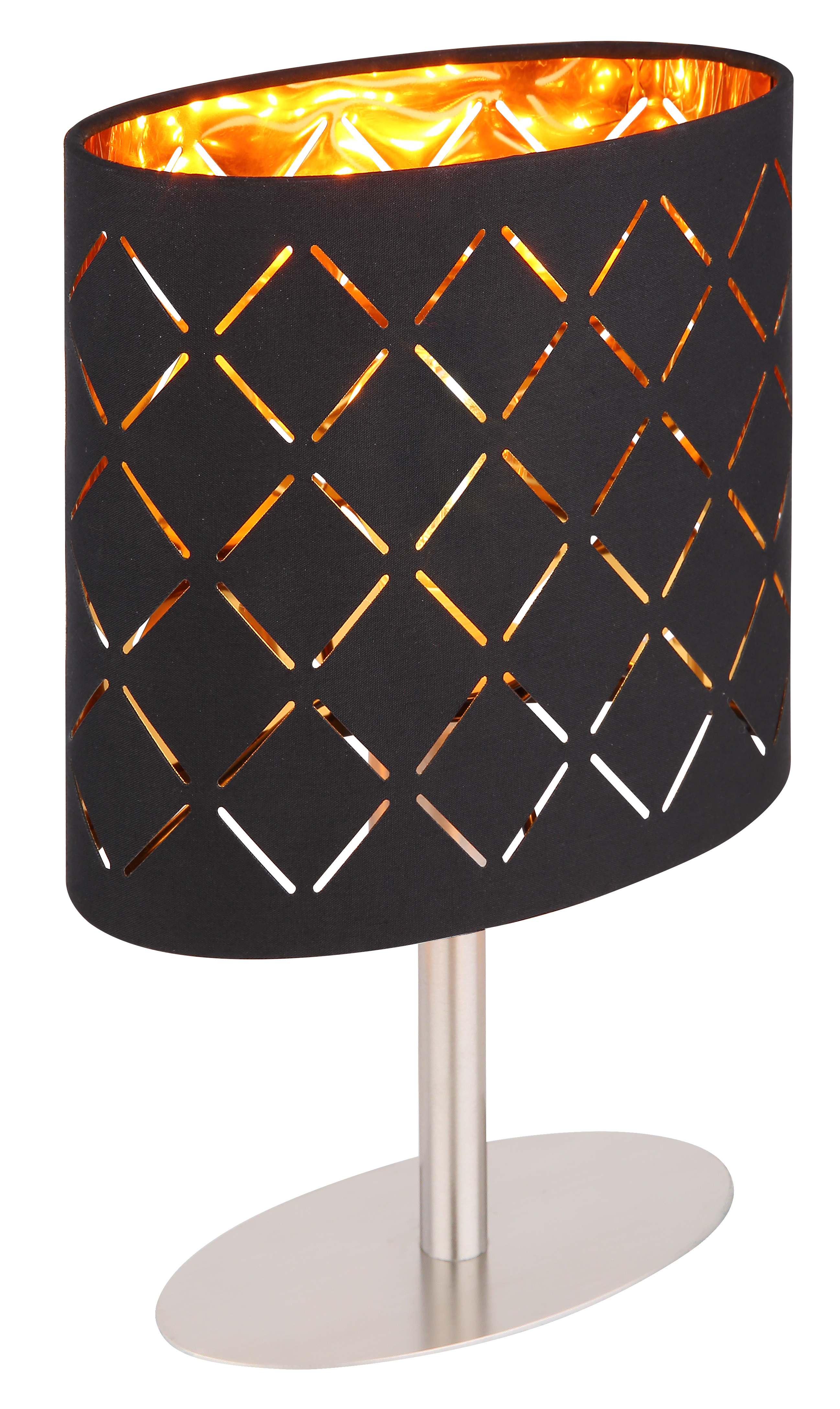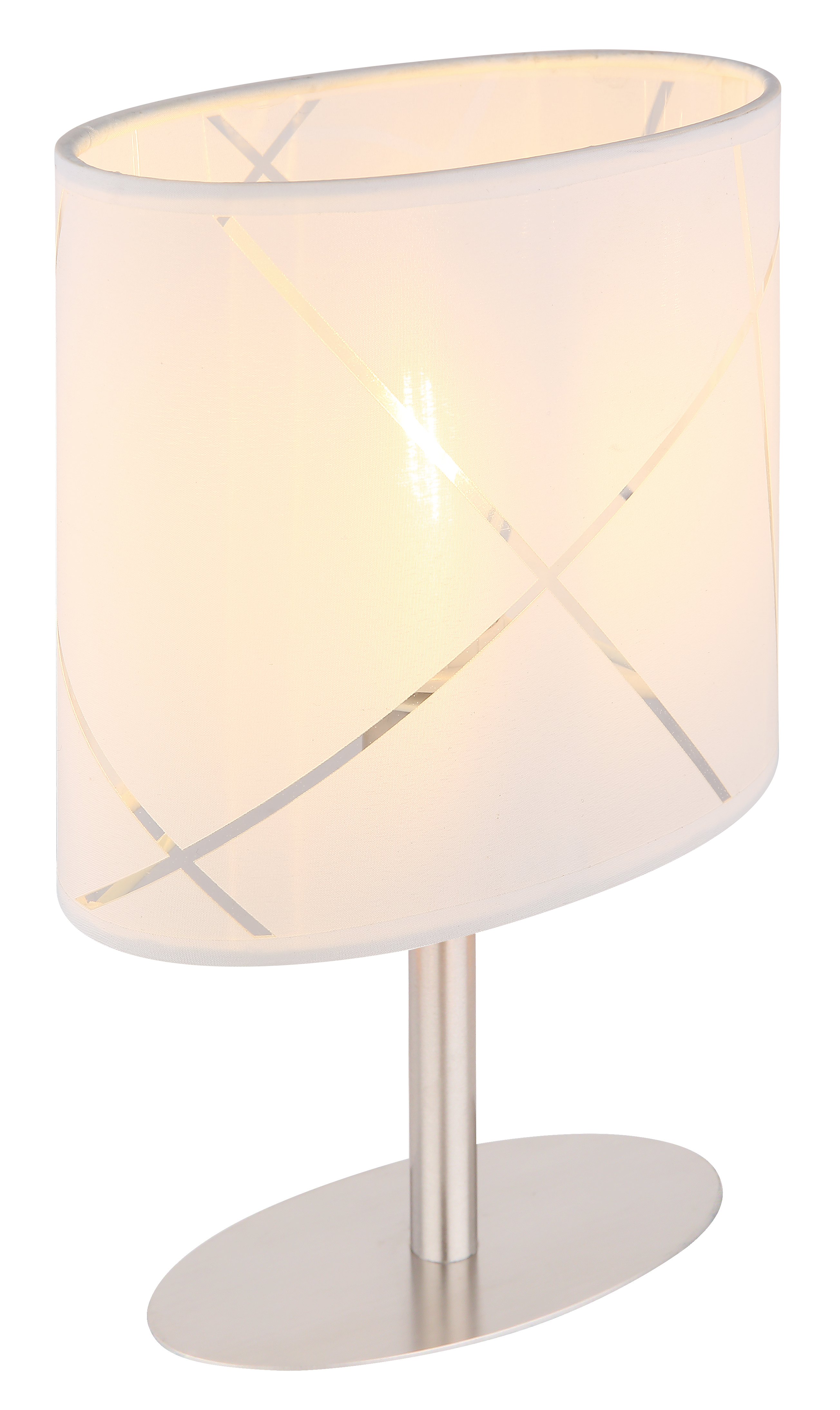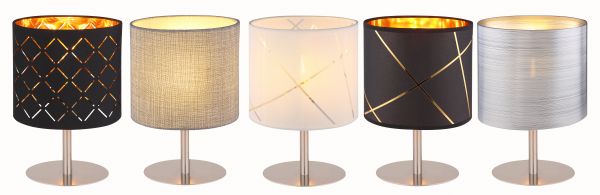 L'esposizione di lampade da tavolo Arlana è composta da quindici lampade da tavolo assortite in nero, grigio-argento, bianco o grigio. Le tonalità sono in tessuto e la base in metallo nichelato opaco. I disegni delle tonalità sono freschi e diversi, con fustelle o motivi.
