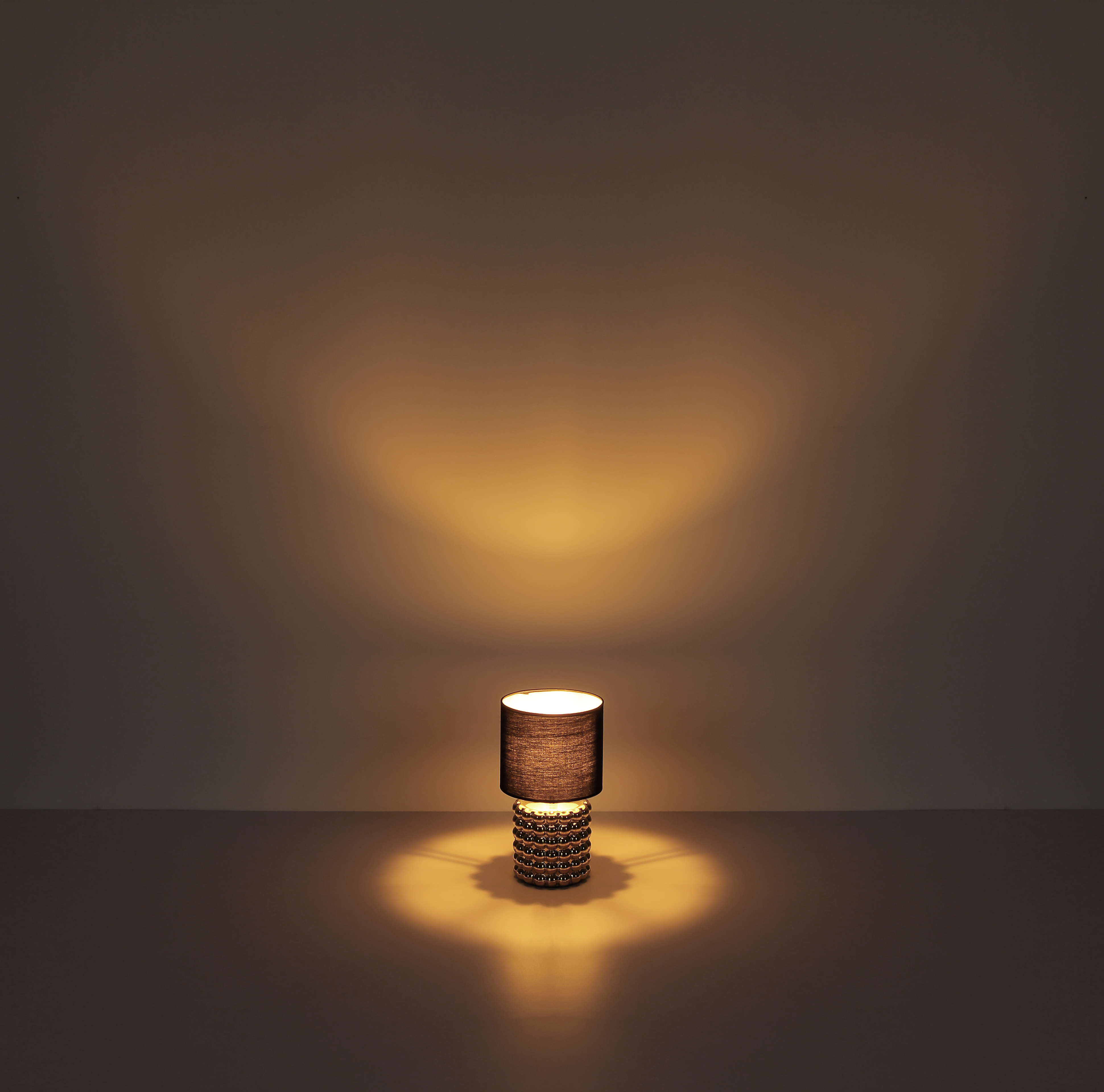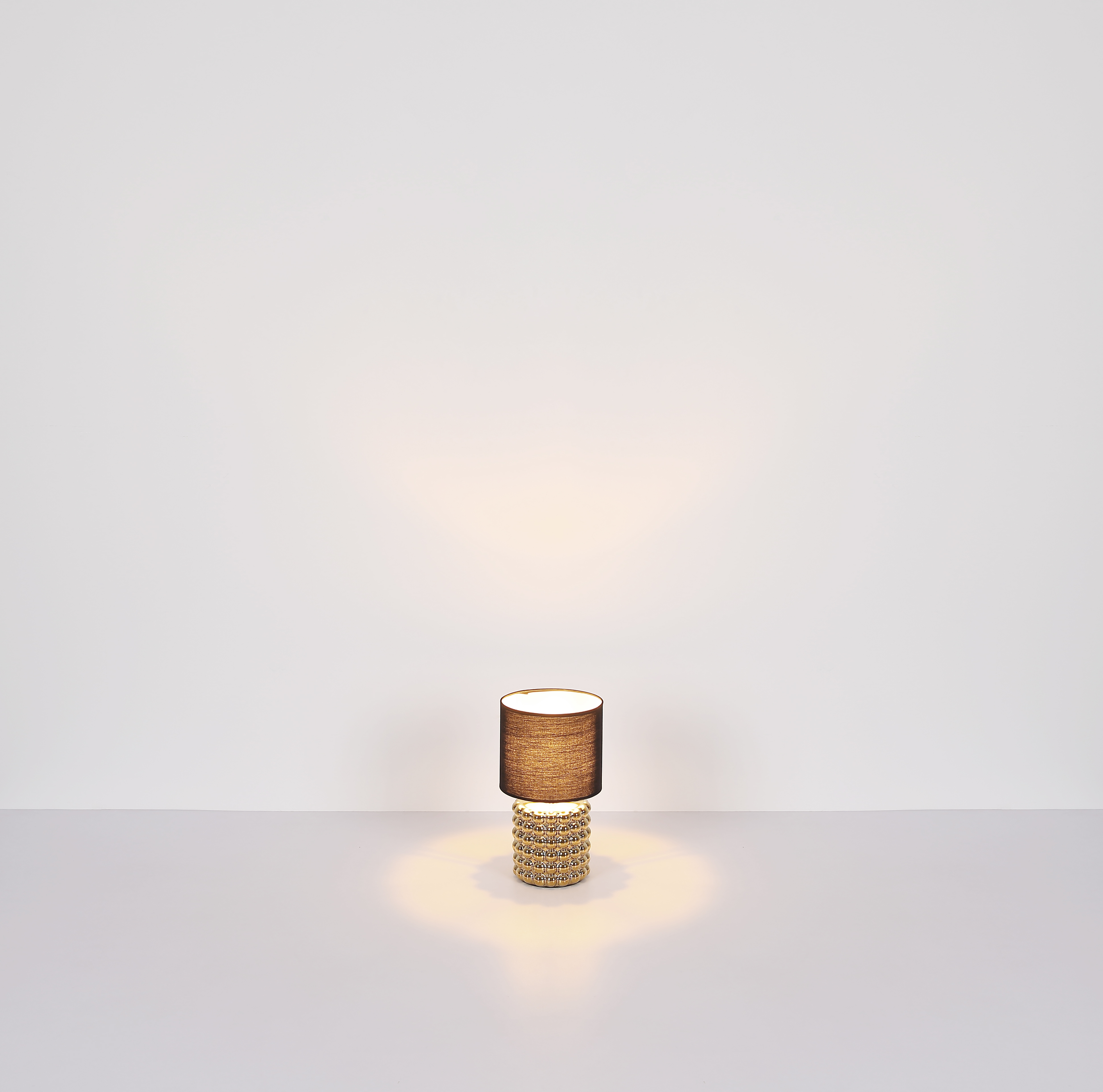 Questa formosa lampada da tavolo ispira con un bel design. Su una gamba sagomata in ceramica dorata a forma di cilindro si trova un attacco E14 con un grande paralume in tessuto nero (Ø 18,5 cm). La presa E14 consente di determinare il proprio colore di luce e la luminosità fino a una potenza massima di 40 watt. Per la longevità e il risparmio energetico, si consigliano le lampadine a LED.