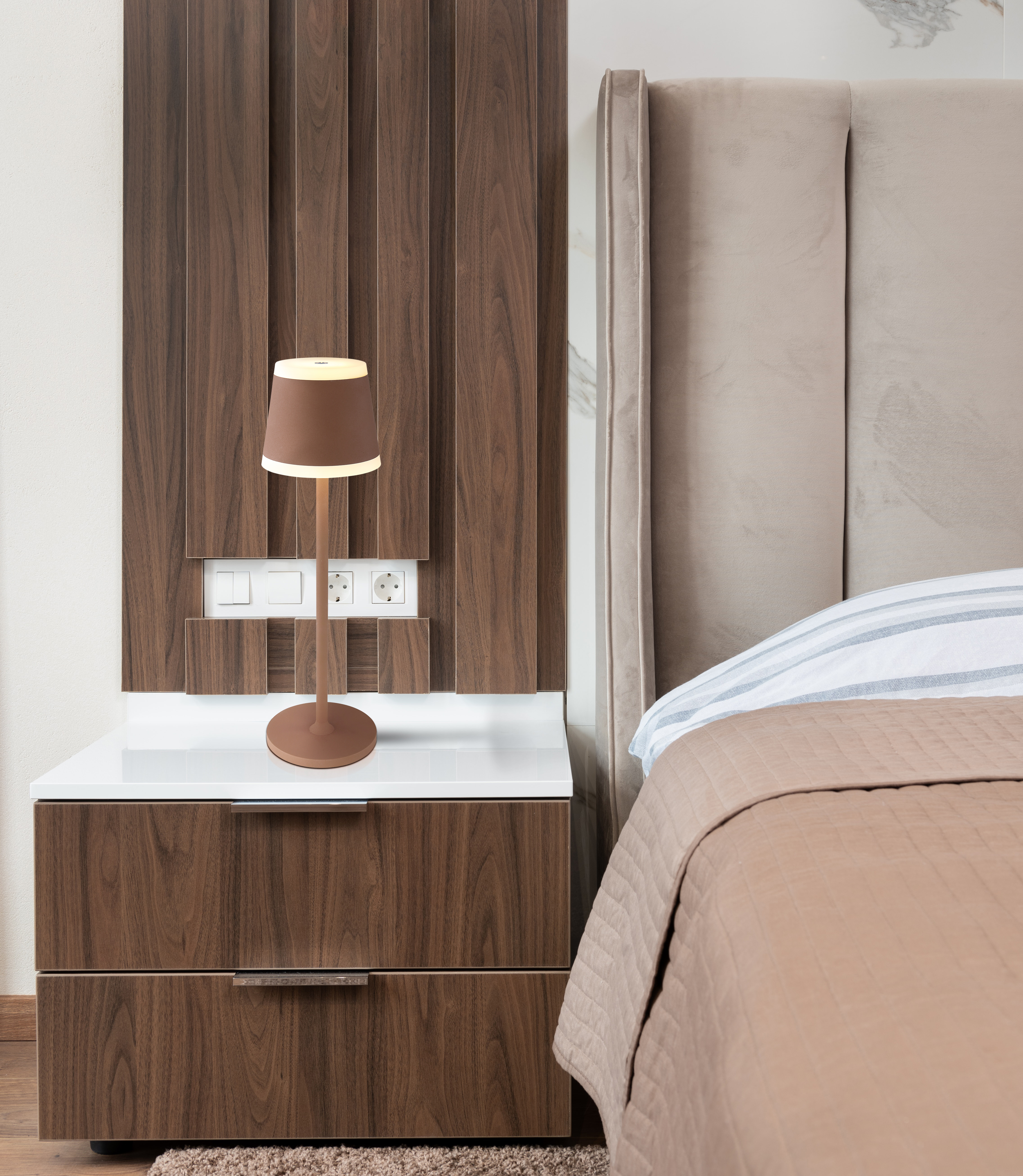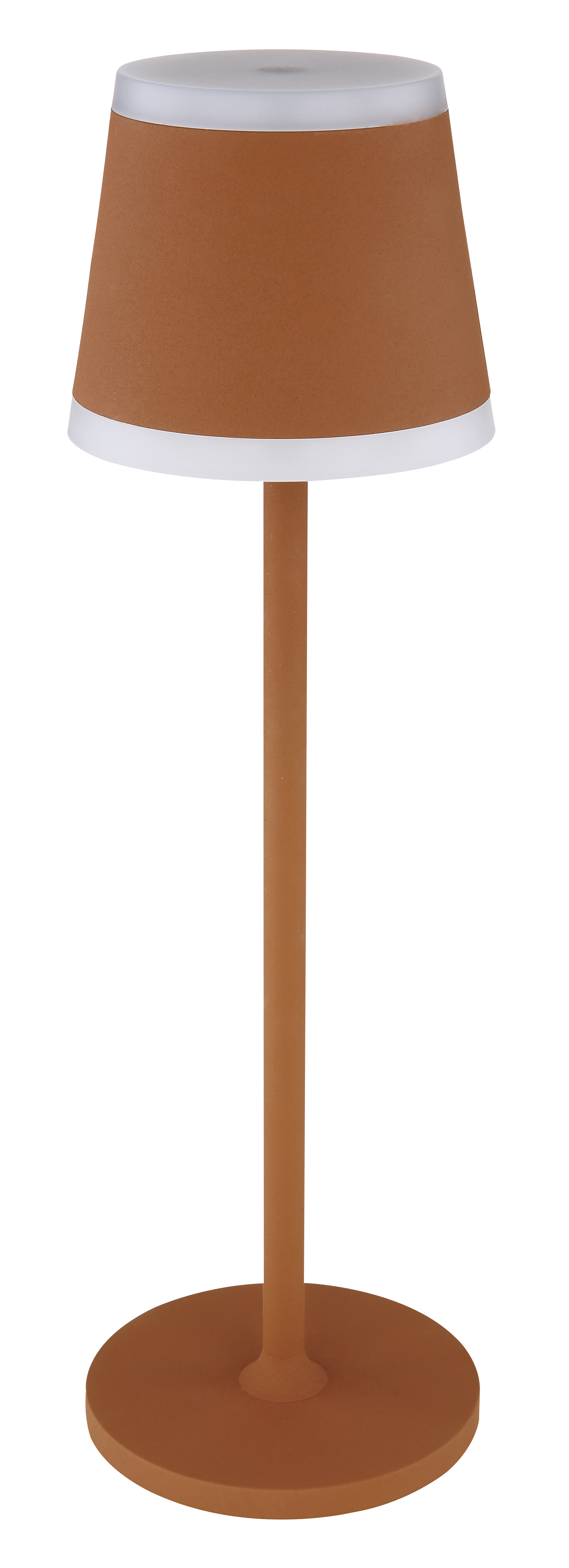 La lampada da tavolo RIDLEY colpisce per il suo design moderno e le sue pratiche funzioni. L'alloggiamento in metallo color ruggine in combinazione con il paralume in acrilico effetto opalino conferisce alla lampada un aspetto unico. Con l'interruttore touch on/off e il dimmer touch continuo, puoi regolare la luminosità a tuo piacimento. Il RIDLEY è dotato di una potente batteria (CR18650 1800mAh 3.7V) che si ricarica completamente in circa 6 ore e offre un'autonomia fino a 5 ore e 45 minuti. La lampada da tavolo è certificata IP54 e può quindi essere utilizzata anche all'esterno. La lampada a LED integrata con 4,6 W e potenza di 220 lm produce una piacevole luce bianca calda con una temperatura di colore di 3000K. Il set include un cavo USB e un adattatore per una comoda ricarica. Con il RIDLEY puoi creare un'atmosfera accogliente in ogni stanza.