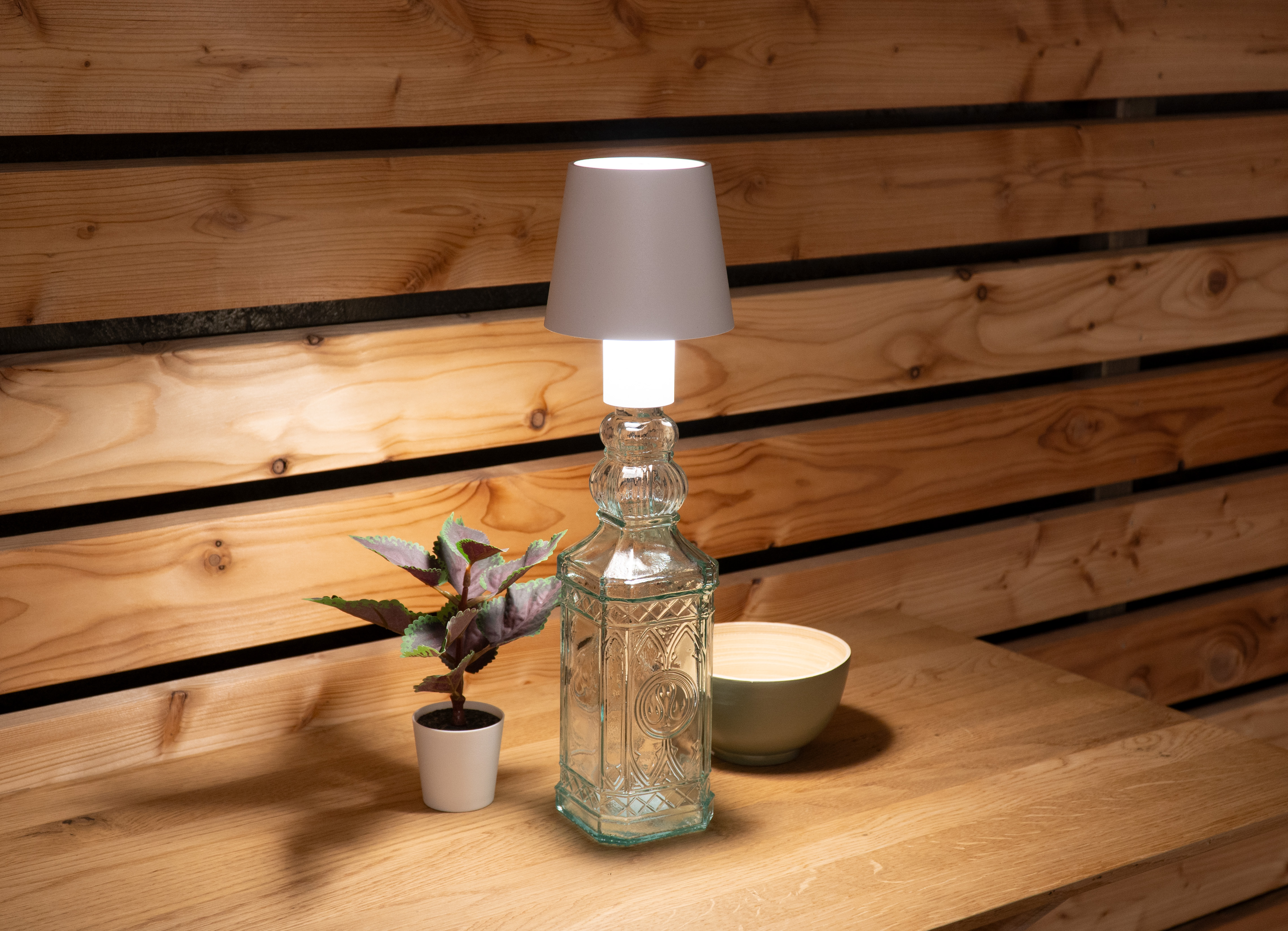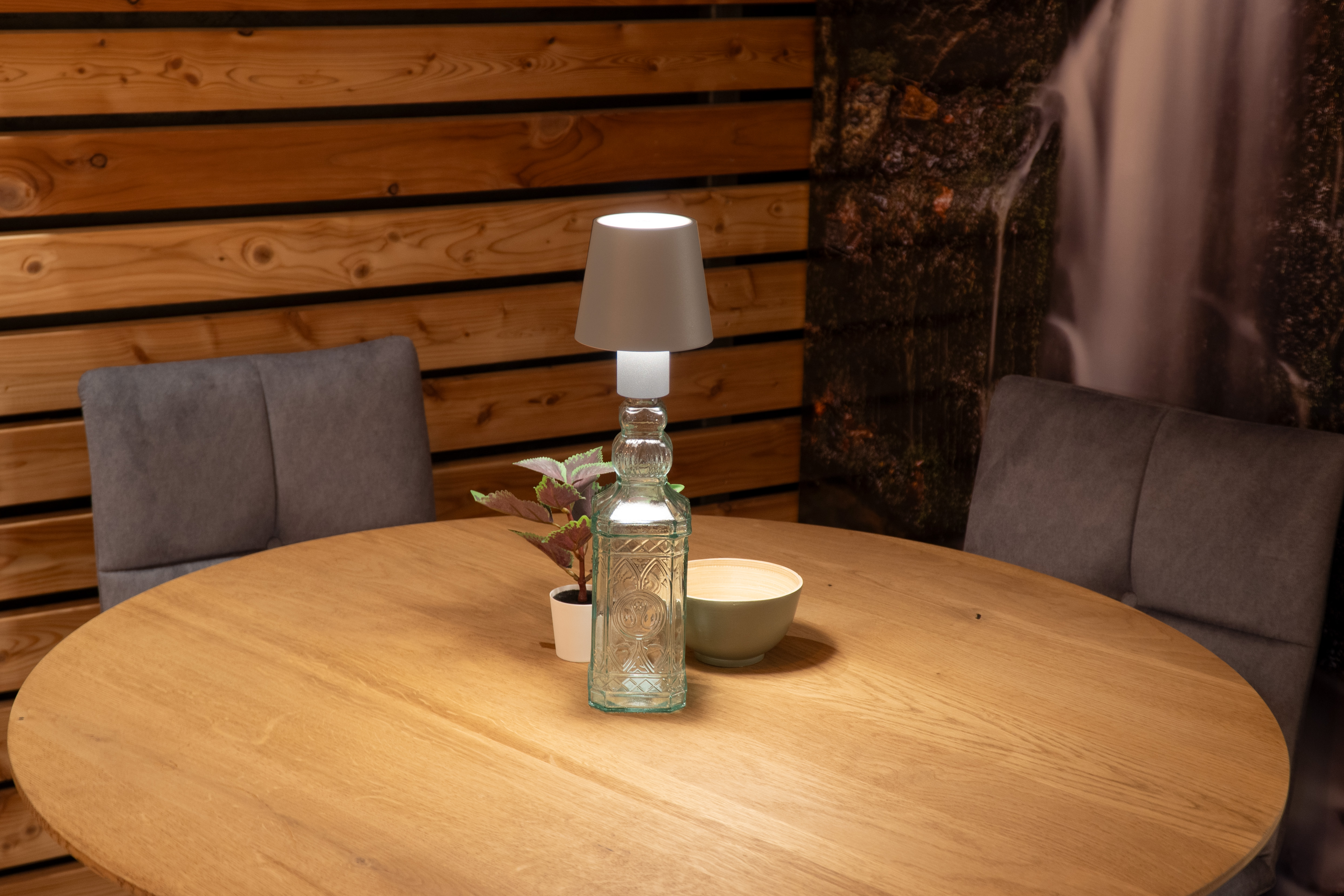La lampada da tavolo VANNIE colpisce per il suo design semplice e moderno con plastica bianca opaca e metallo bianco opaco. La plastica opalina fornisce una luce piacevole e uniforme. Con un pratico interruttore touch on/off e un dimmer touch continuo, la luminosità può essere regolata individualmente. L'apparecchio dispone anche di una funzione di memoria che memorizza l'ultima luminosità impostata. La batteria di tipo CR18650 con una capacità di 1800mAh garantisce un'autonomia di circa 4-6 ore e può essere ricaricata in circa 4 ore. L'apparecchio è certificato IP44 e quindi adatto anche per l'uso esterno. Grazie al suo design, la lampada può essere posizionata su bottiglie con un diametro fino a 3 cm al collo della bottiglia. La lunghezza del cavo è di 1500 mm e un LED con potenza di 3W e uscita di 130 lm fornisce una luce piacevole con una temperatura di colore di 3000K. È incluso un cavo USB, l'adattatore deve essere acquistato separatamente.