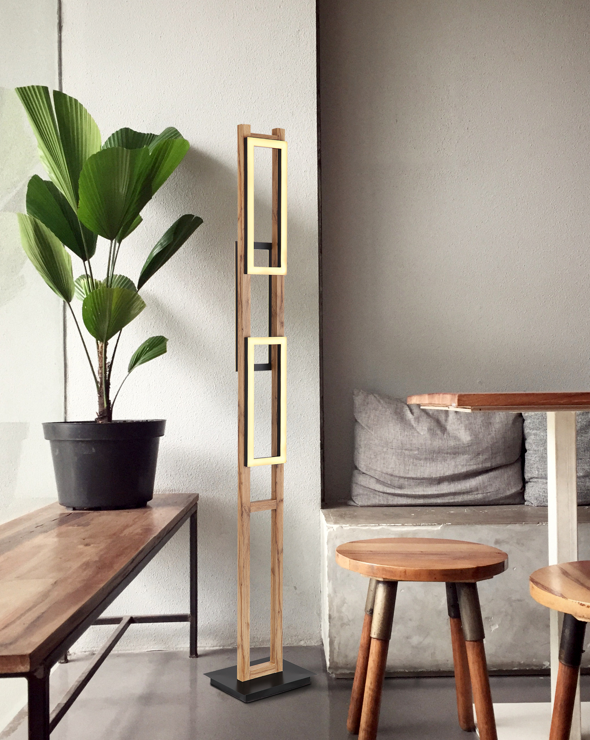 Questa piantana moderna ispira con il suo aspetto favoloso. Consiste in un telaio di legno a forma di scala con un'altezza di 1,5 m e tre pannelli LED rettangolari attaccati. L'intensità della luce di 3000 Kelvin crea una piacevole luce bianca calda e fornisce così una grande atmosfera alla stanza.