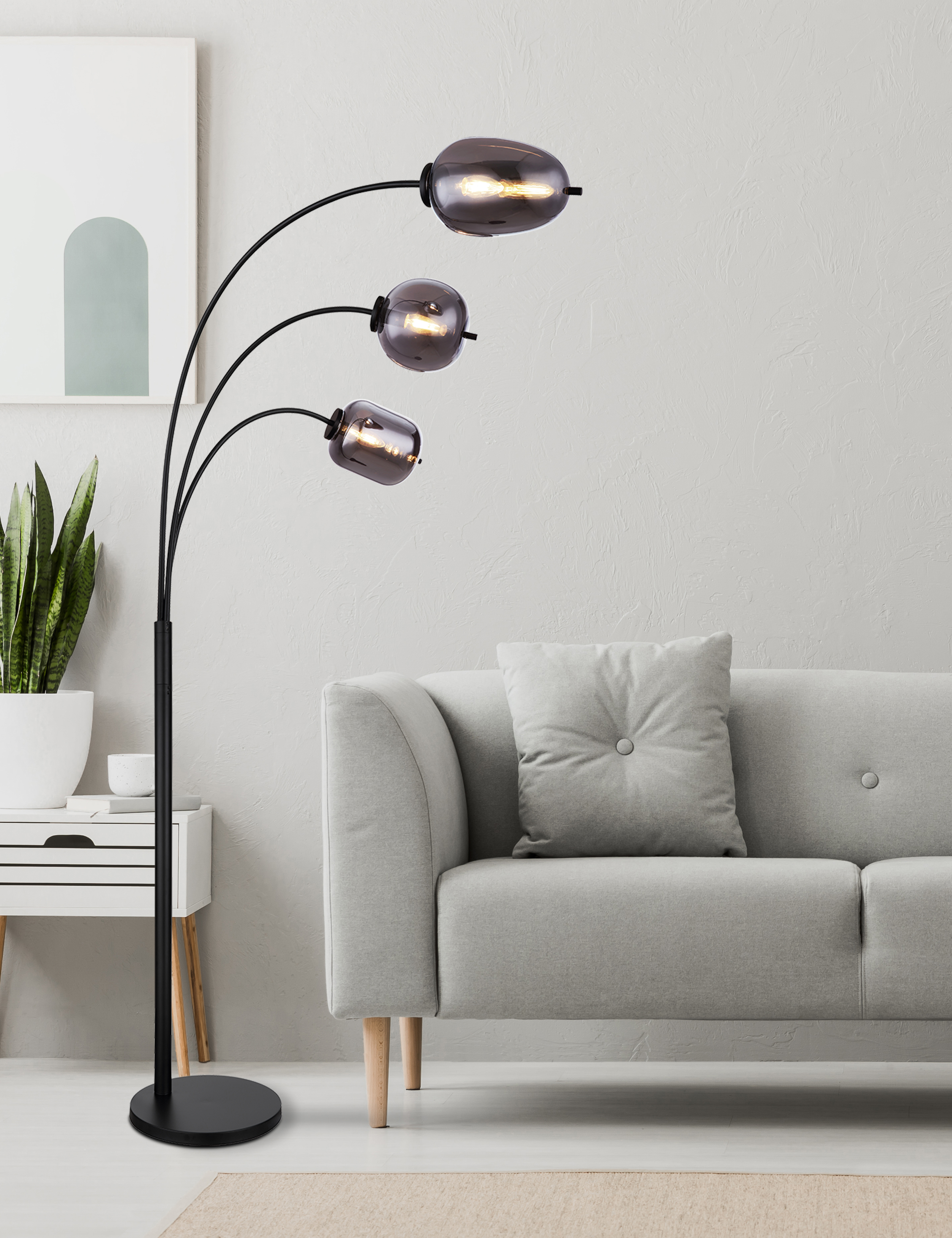 Questa grande lampada da terra della serie Blacky ispira per il suo bel design. Da una base sporge un'asta di metallo nero opaco da cui sporgono altre tre aste di metallo, ciascuna con una presa E14 all'estremità. Sugli attacchi E14 si trova un paralume in vetro fumé di diverse forme e permette di scegliere liberamente fino a una potenza massima di 40 watt.