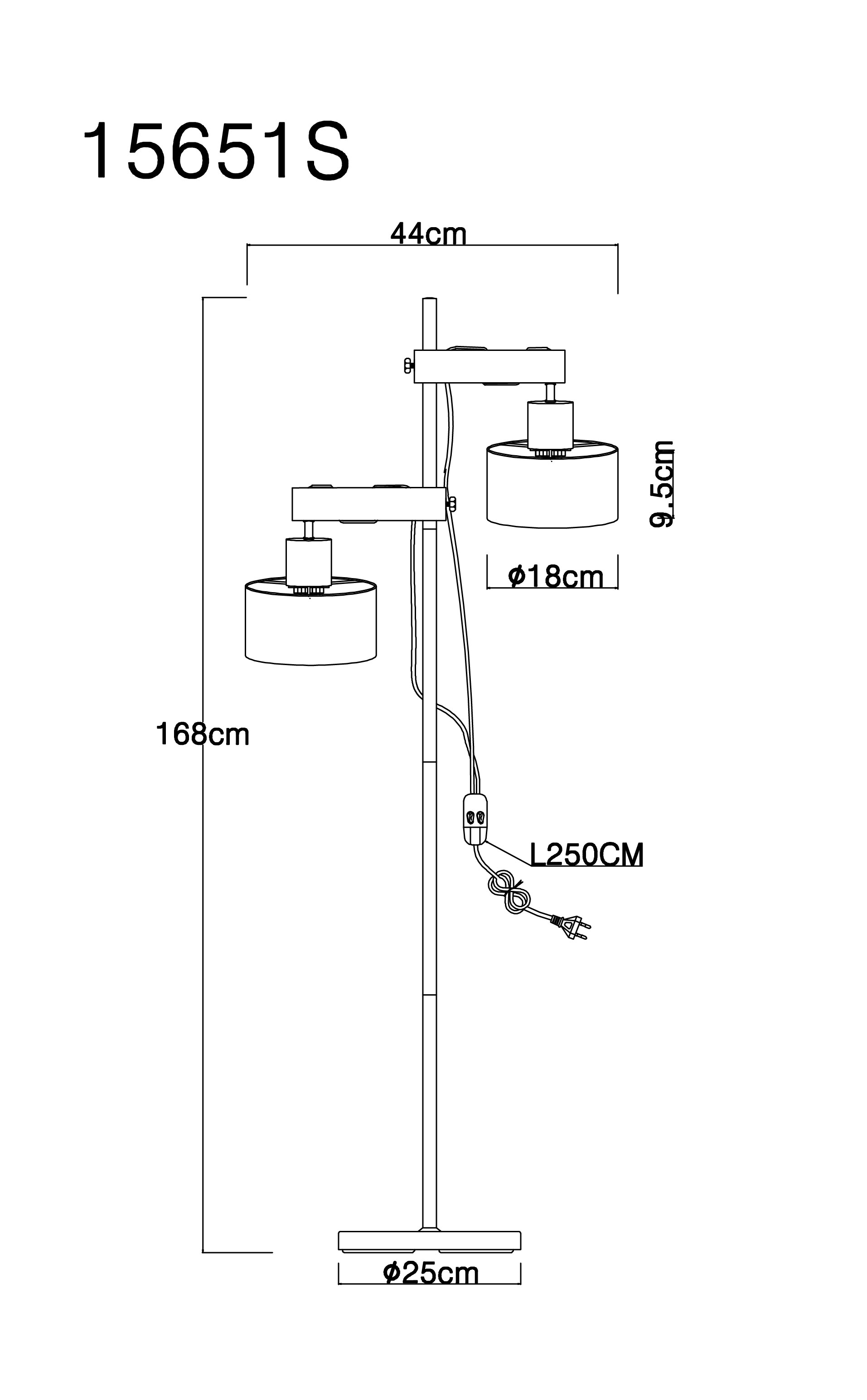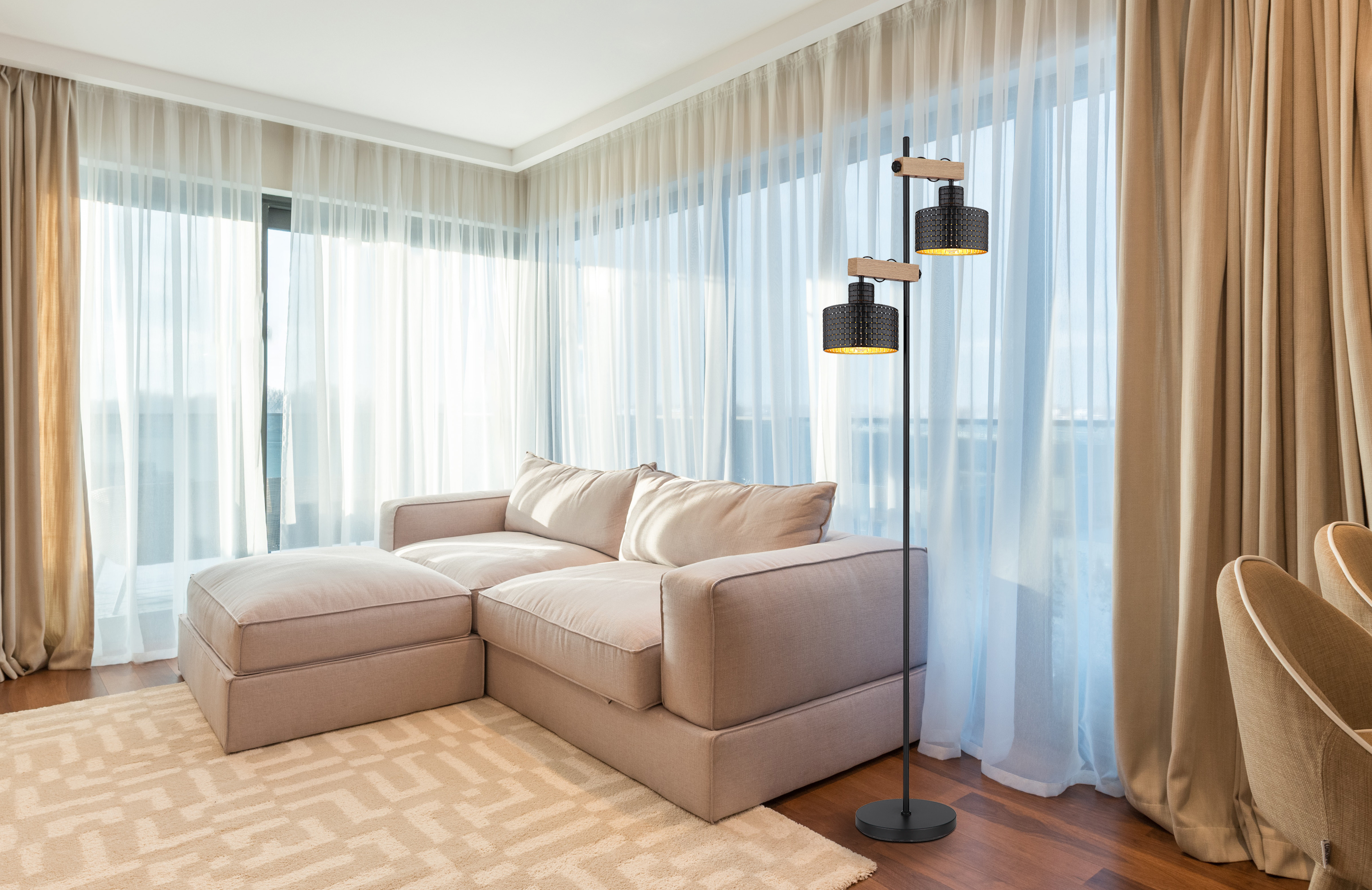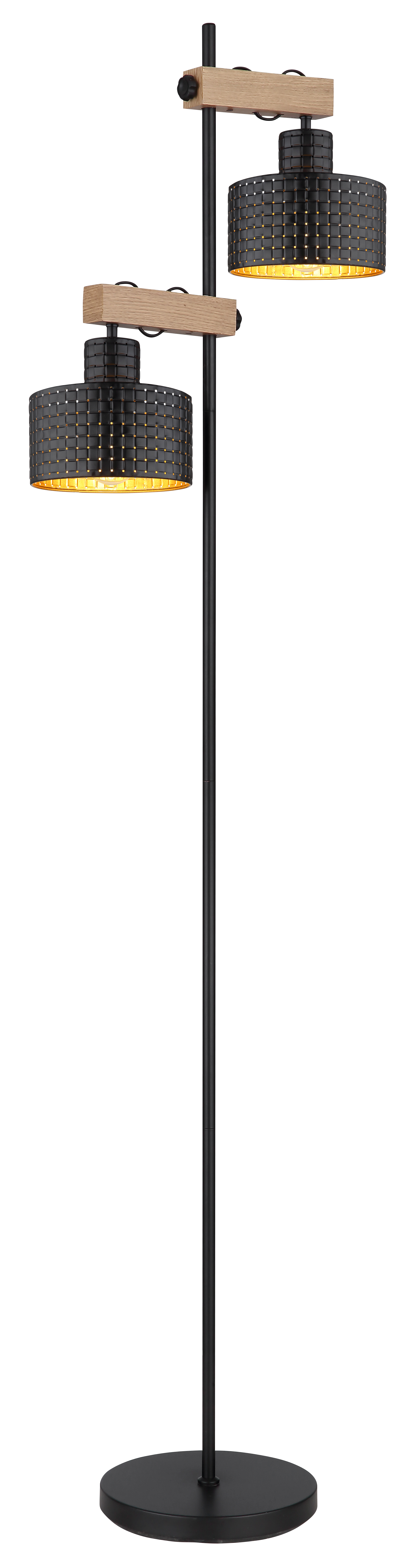 Questa moderna lampada da terra della serie RIELLY ispira con i suoi colori oro, nero e legno. Da una base rotonda sporge un'asta metallica lunga 168 cm con due travi in MDF regolabili in altezza in un bellissimo effetto legno, su ognuna delle quali si trova una presa E27. La lampada è rivestita da un paralume decorativo in nero e oro e può essere azionata tramite un interruttore ON/OFF. L'attacco E27 consente di determinare il colore e la luminosità della luce fino a una potenza massima di 40 watt. Per la longevità e il risparmio energetico, si consigliano le lampadine a LED.