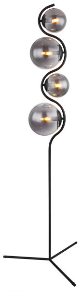 Questa moderna lampada da terra ispira con un grande design. Un'asta metallica ricurva lunga 1,6 m sporge da un treppiede nero opaco, su cui si trovano quattro prese E14, ciascuna con un paralume in vetro color fumé. Gli attacchi E14 consentono di determinare il colore e la luminosità della luce fino a una potenza massima di 25 watt. Per la longevità e il risparmio energetico, si consigliano le lampadine a LED.