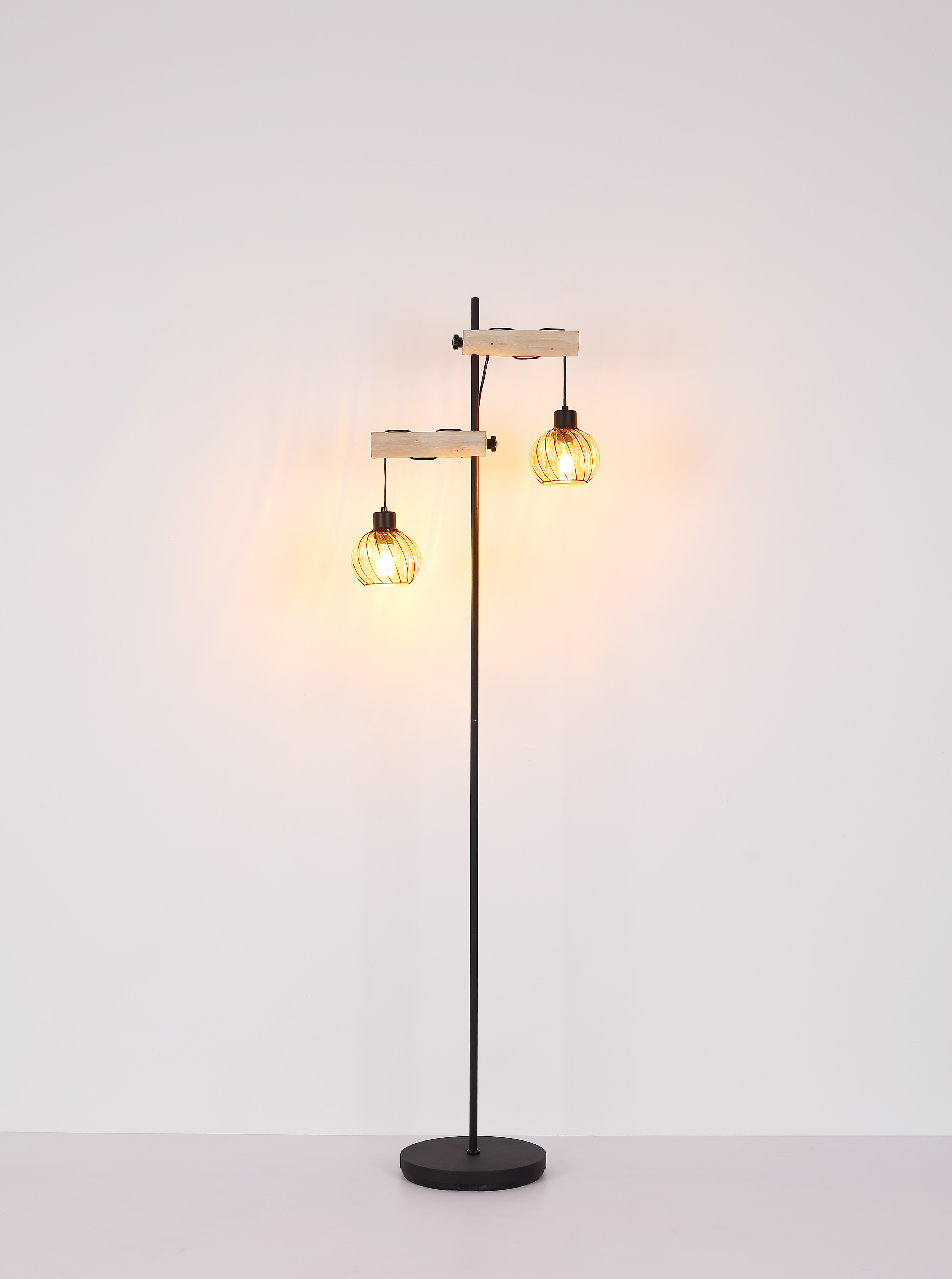 Questa bellissima lampada da terra della serie Paulo ispira con il suo grande design. Da una base rotonda nera (Ø 28 cm) sporge un'asta in metallo nero opaco lunga quasi 1,7 m, sulla quale si trovano due bracci in legno regolabili in altezza. Ognuno di essi è dotato di un paralume in vetro ambrato splendidamente decorativo, con aste in metallo nero (Ø 13 cm) e una presa E27, anch'esse regolabili in altezza su cavi neri. Gli attacchi E27 danno la possibilità di decidere il colore della luce e la luminosità fino a una potenza massima di 15 watt. Per la longevità e il risparmio energetico, si consigliano le lampadine a LED.