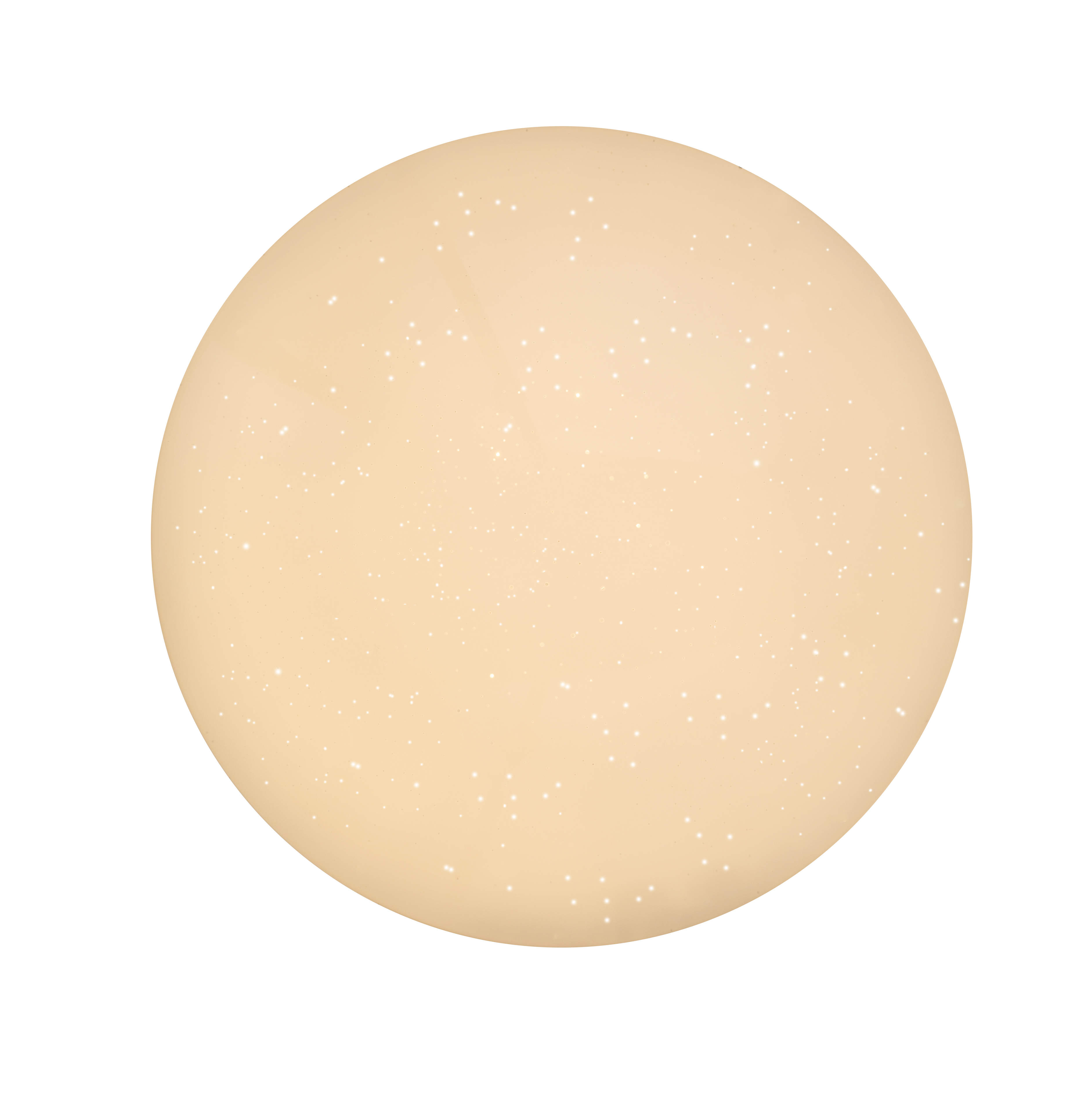 Un vetro acrilico opalino rotondo in look cielo stellato è montato su una piastra di sospensione rotonda a specchio (29x29 cm). Questa classica plafoniera della serie Atreju I è versatile e offre una luce forte da 850 lumen con un piacevole colore della luce a 4000K.