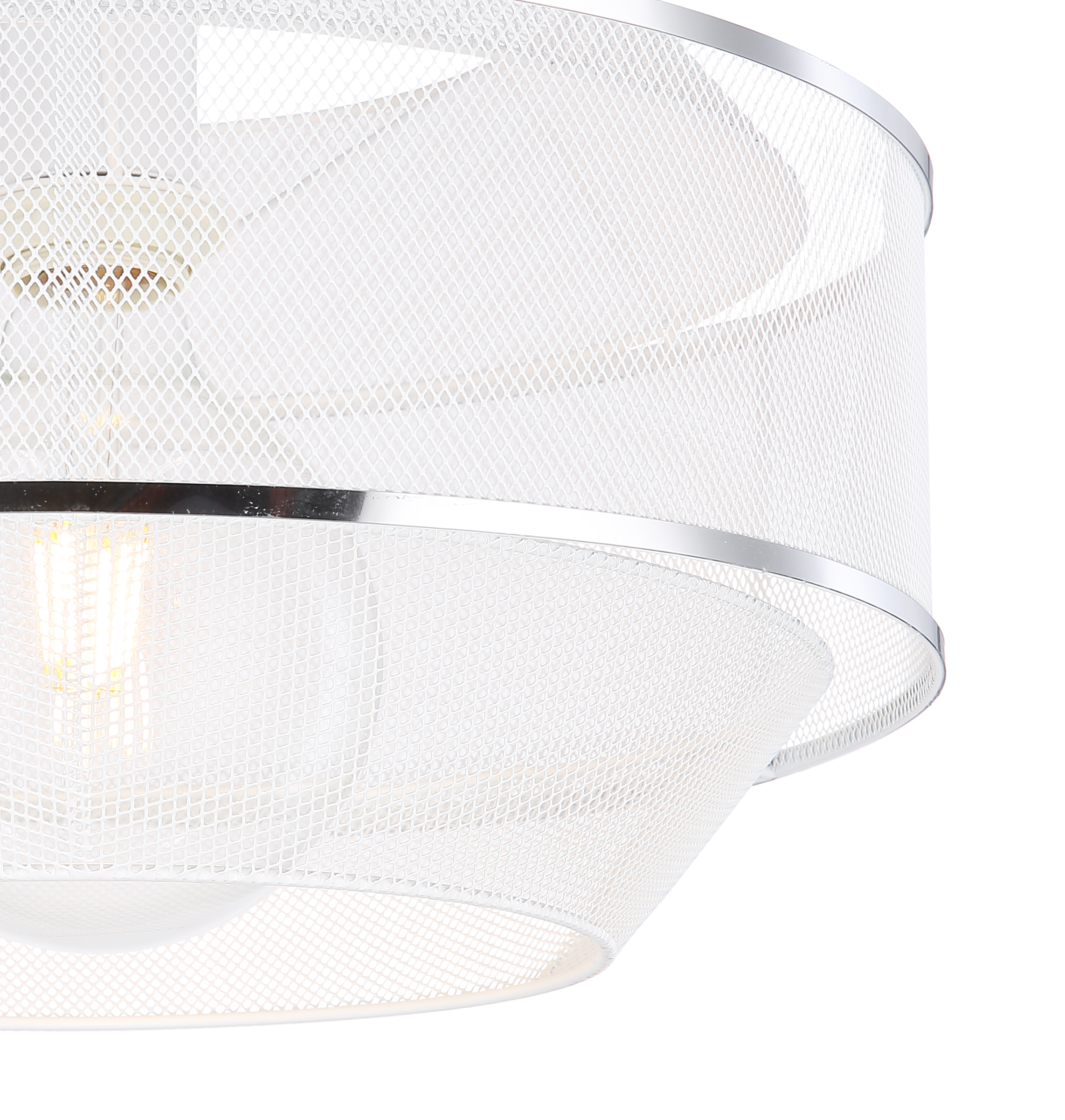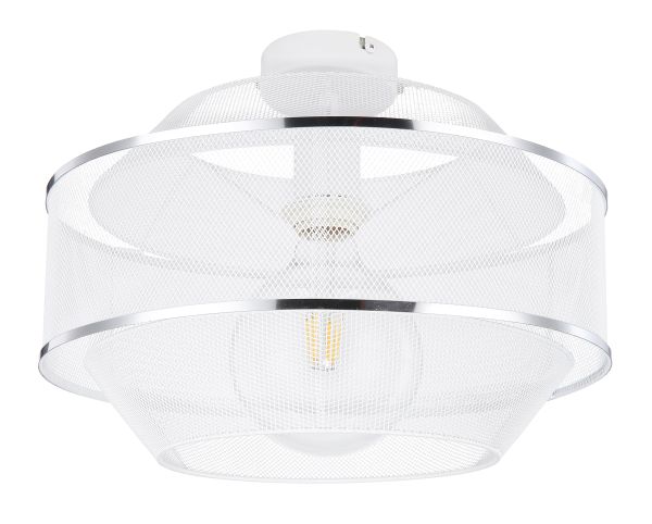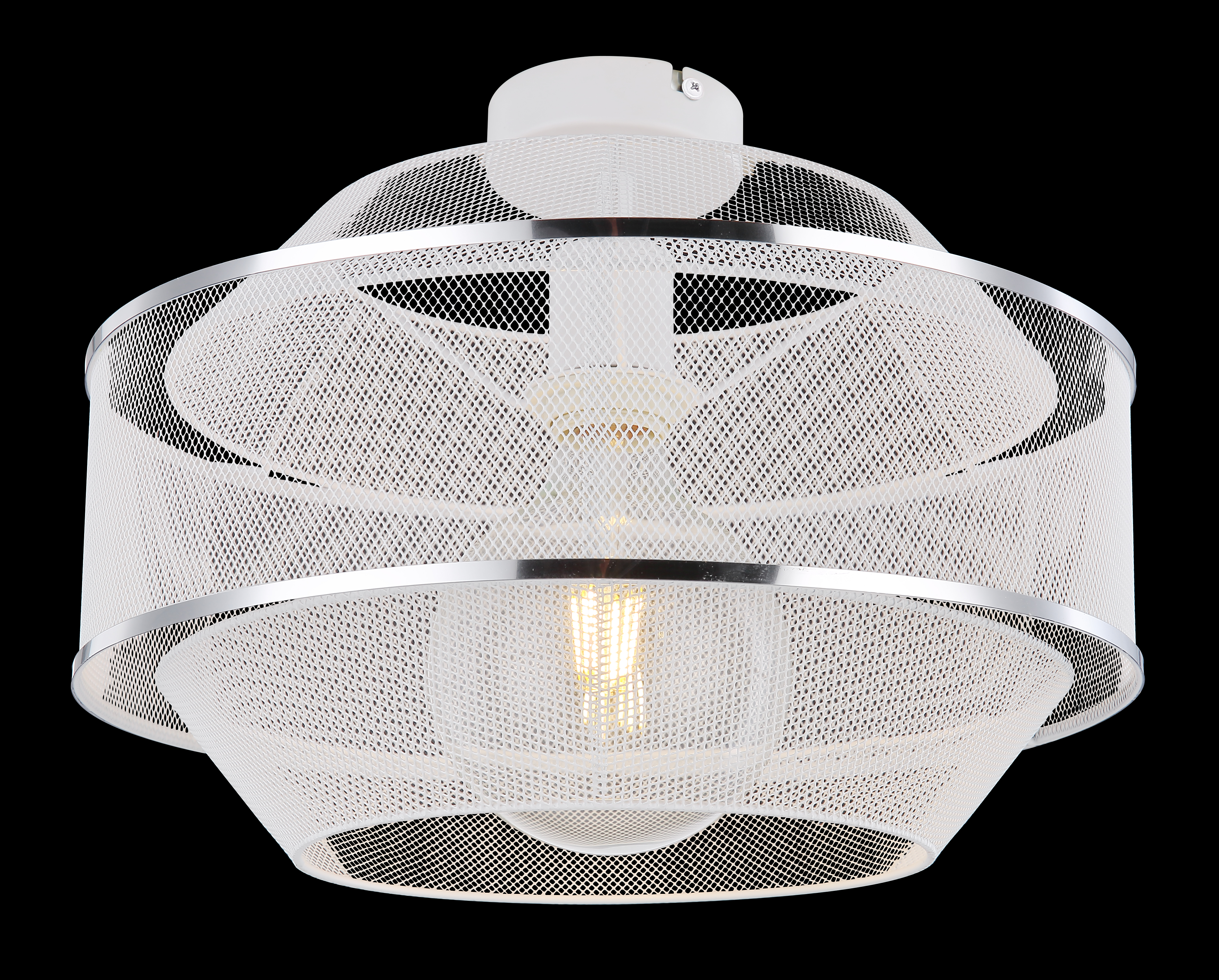 La plafoniera della serie VIGATTO (Ø35cm) colpisce per il suo aspetto moderno. La lampada è in bianco e 2 anelli cromati d'argento, il paralume è costituito da una rete metallica curva. La presa E27 integrata è progettata per un massimo di 60W e permette di sostituire la lampadina.
