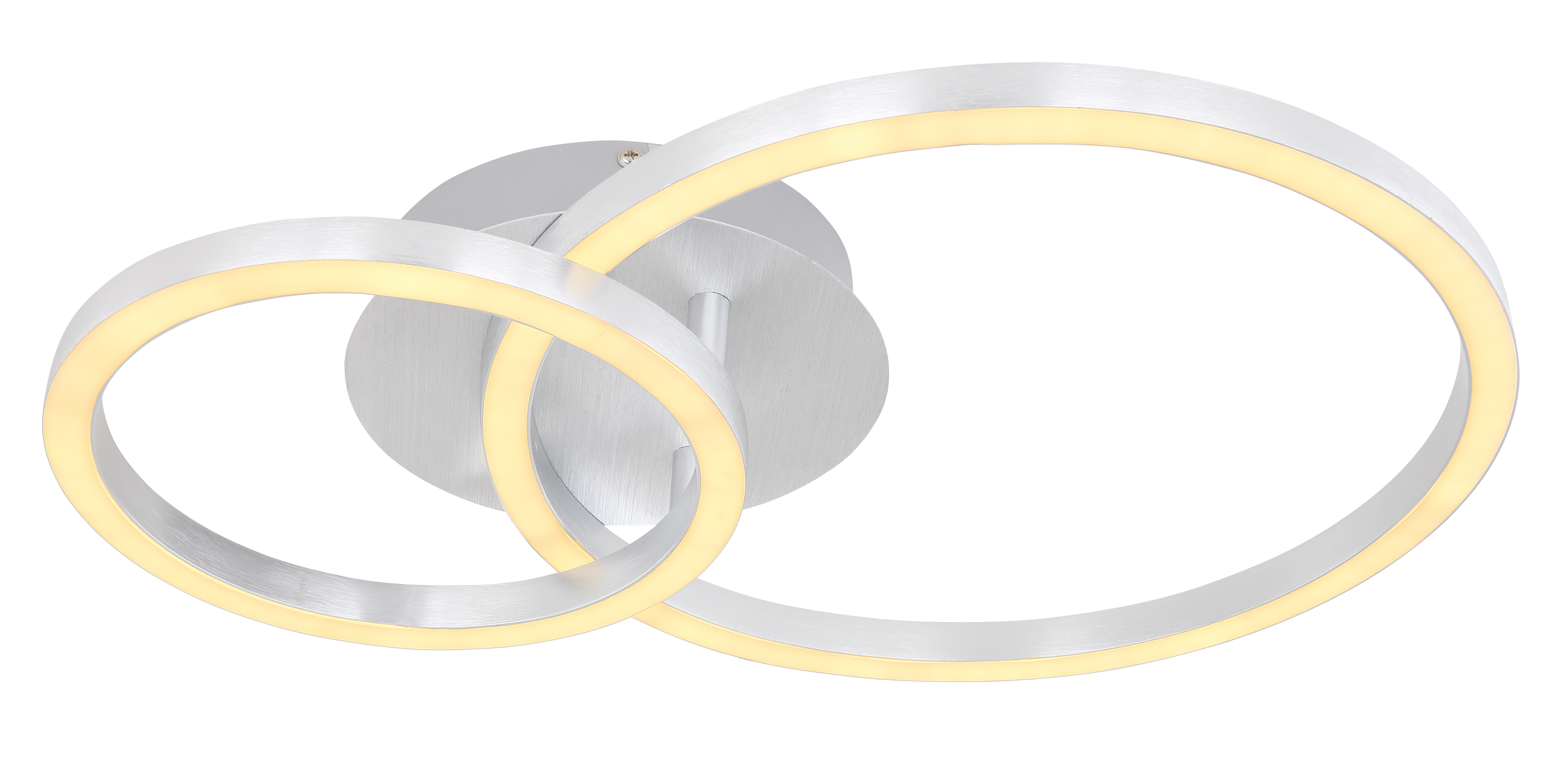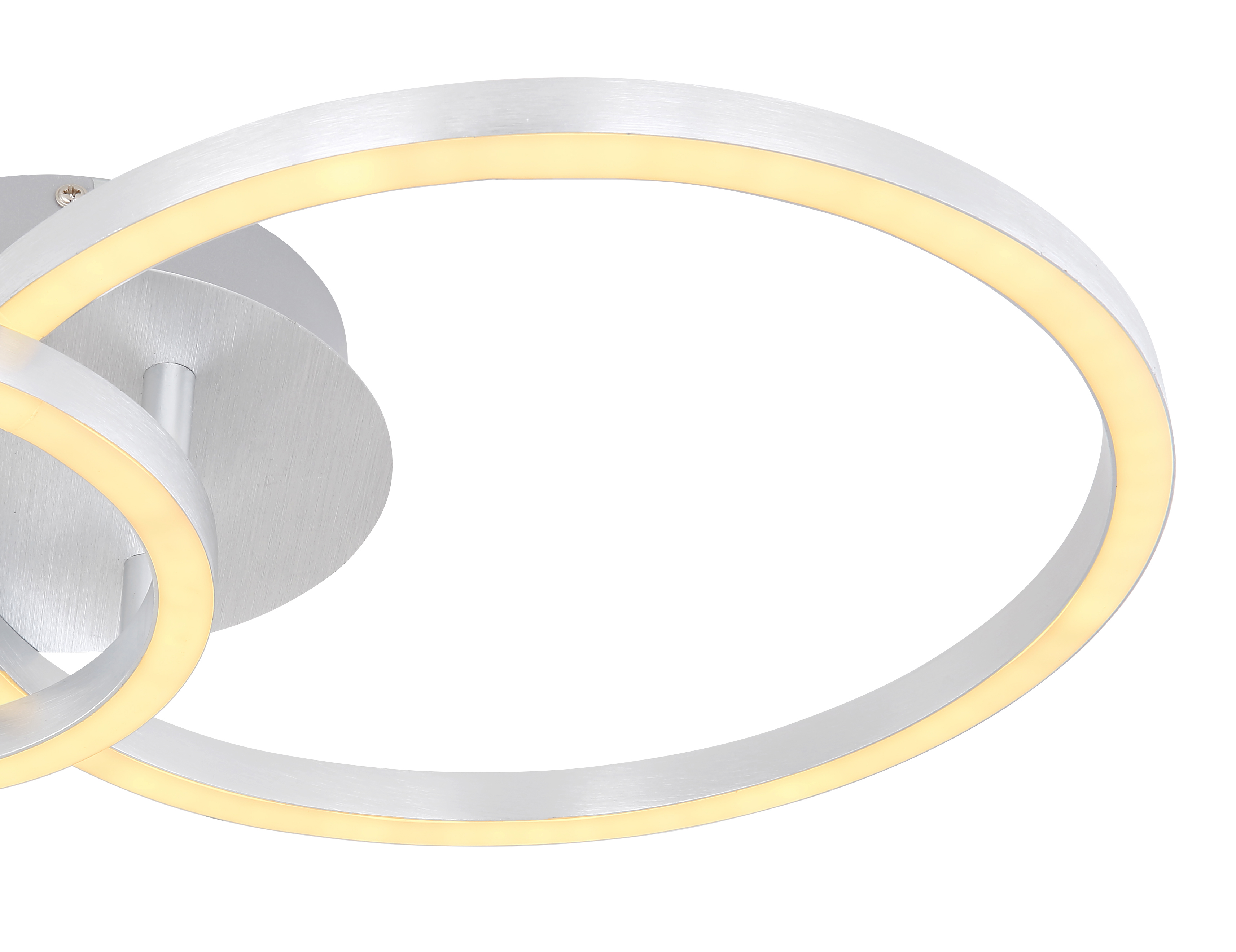 Questa plafoniera della serie Reggy (42x30 cm) colpisce per il suo design elegante in alluminio spazzolato e acrilico opalino. Un anello di alluminio più grande e uno più piccolo sono fissati alla piastra rotonda di alluminio, che si sovrappongono meravigliosamente e sono dotati di acrilico opalino. Questo copre le lampadine LED incluse, con le quali la plafoniera fornisce 950 lumen di luce forte con un colore di luce di 3000 Kelvin (bianco caldo). Con altri modelli della stessa serie, si può completare il quadro generale all'interno delle stanze e creare un ambiente elegante.