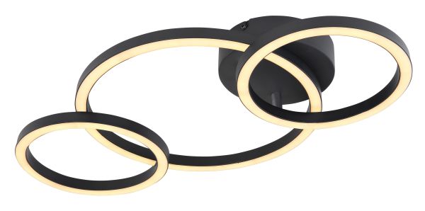 Questa plafoniera della serie Reggy (54,5x30 cm) colpisce per il suo design elegante in metallo nero e acrilico opalino. Consiste in un anello più grande e due più piccoli in metallo, che si sovrappongono splendidamente e sono ricoperti di acrilico opalino. Questo copre le lampadine LED incluse, con le quali la plafoniera fornisce 760 lumen di luce forte con un colore di luce di 3000 Kelvin (bianco caldo). Con altri modelli della stessa serie, si può completare il quadro generale all'interno delle stanze e creare un ambiente elegante.