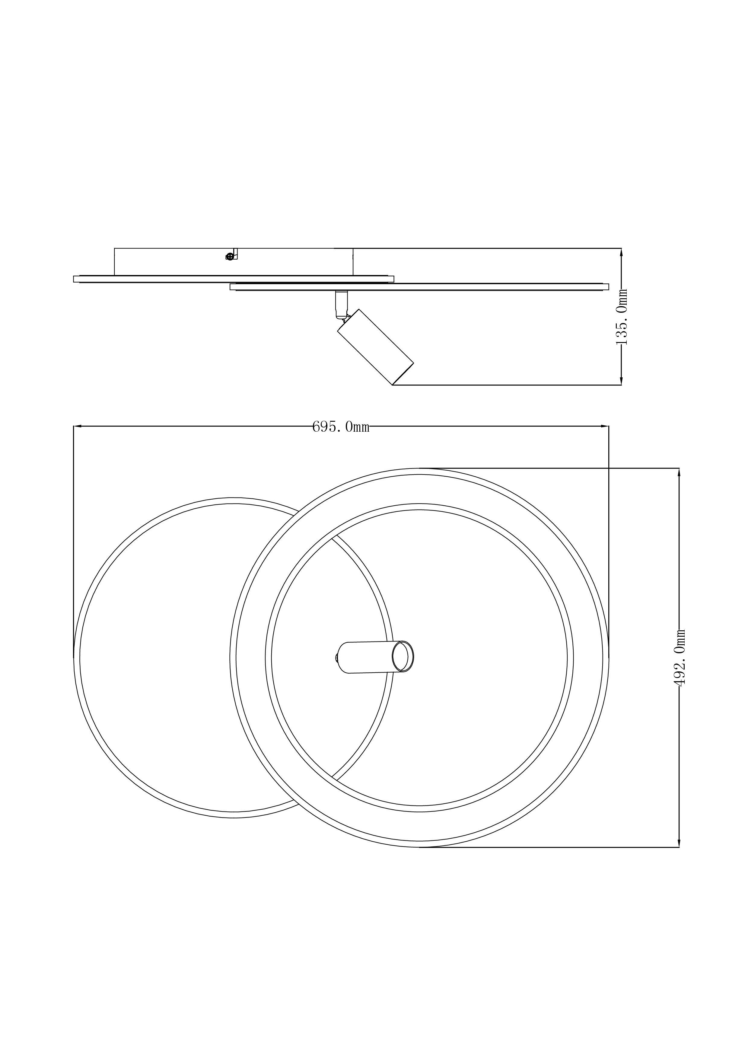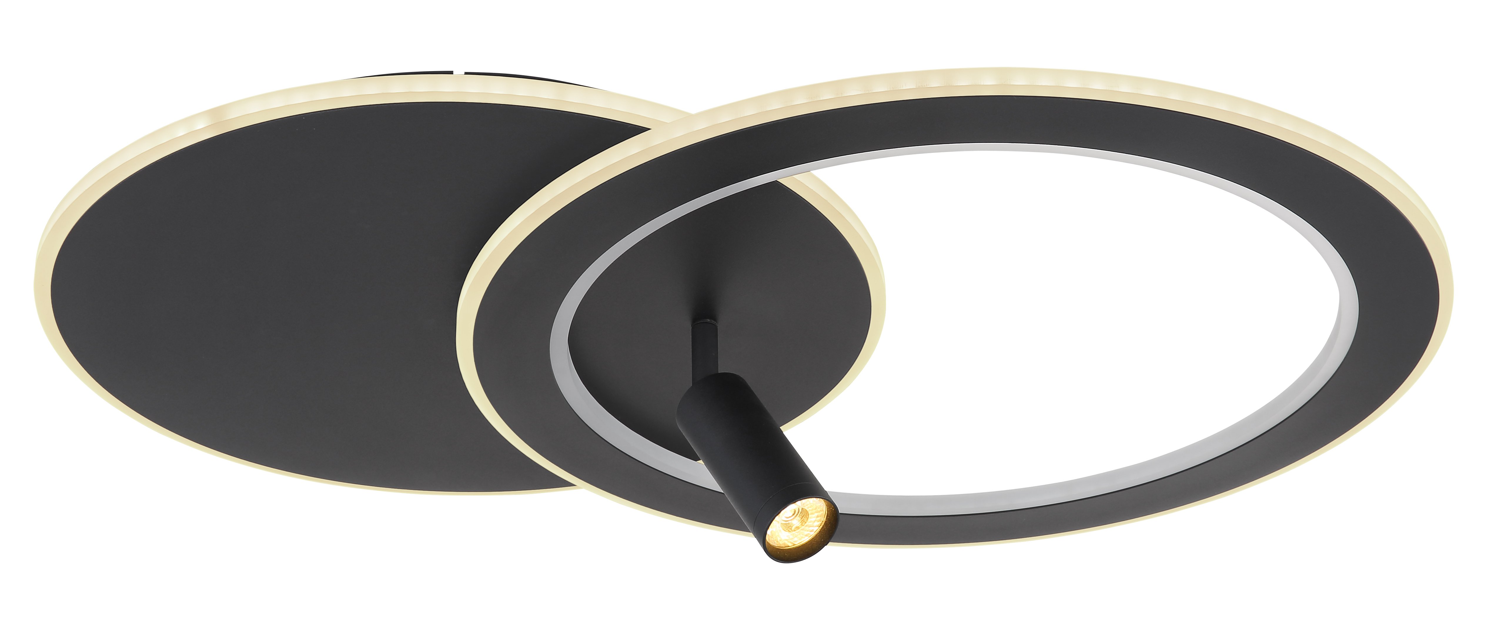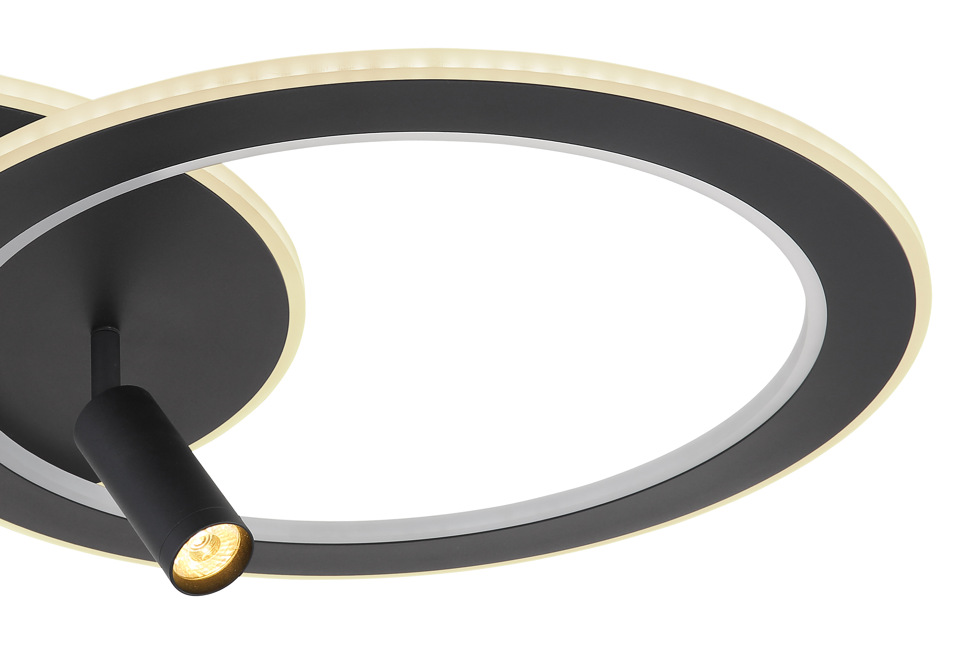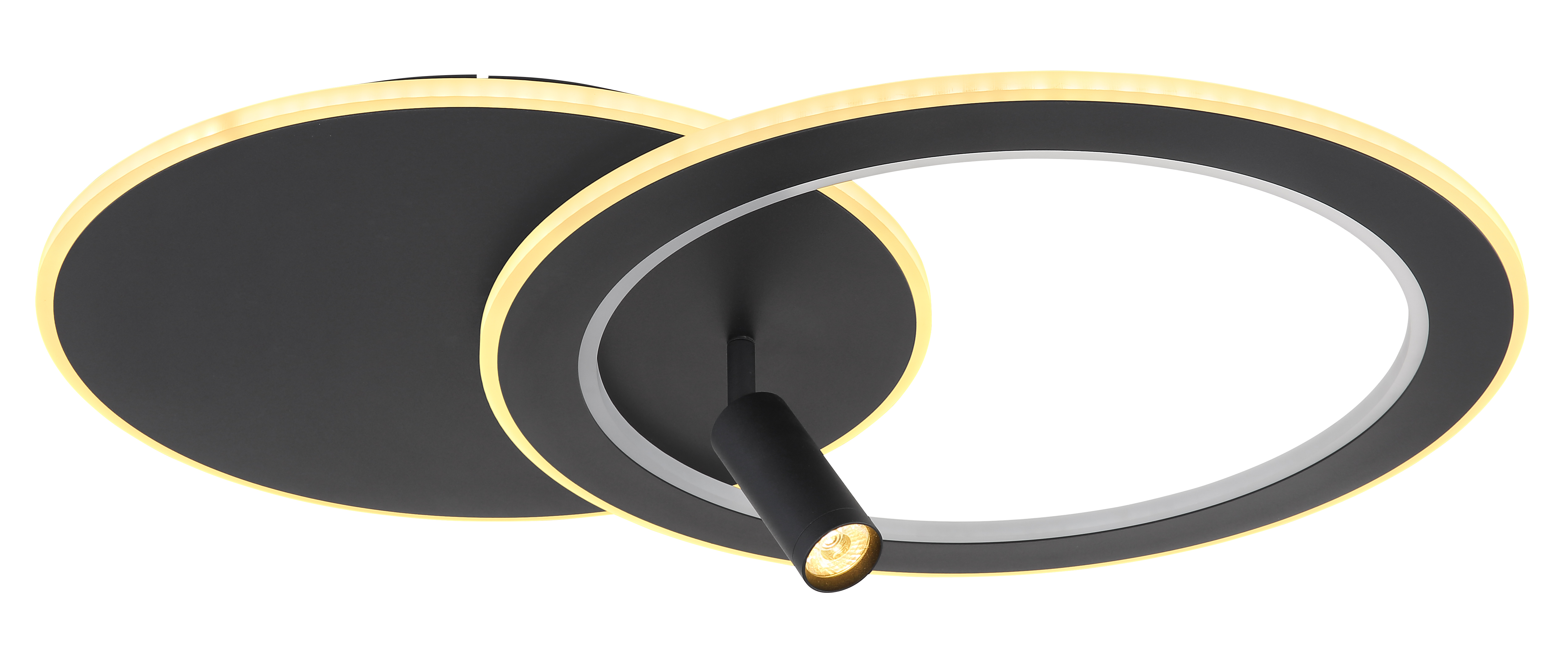 Questa lampada da soffitto estremamente moderna (70x49cm) convince non solo per il suo aspetto, ma soprattutto per le sue funzioni. La lampada è composta da due anelli formosi dotati di un faretto cilindrico e due pannelli LED con funzione rossa, verde e blu. Questo brilla da 2700 Kelvin bianco caldo fino a 6500 Kelvin luce bianca fredda e ha una funzione di dimmerazione, una funzione di memoria e può anche essere fissato nei colori rosso, verde e blu. Il telecomando in dotazione consente di determinare autonomamente l'intensità della luce e il colore della luce e crea così un'atmosfera fantastica.