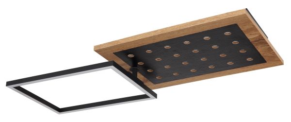 Questa moderna plafoniera ispira per il suo grande aspetto. È composta da una struttura LED ruotabile e da un pannello fisso in MDF in effetto legno con luci LED aggiuntive di lunghezza e larghezza massime di 63x27 cm. Emettono una piacevole luce bianca calda da 3000 Kelvin con 3 livelli tramite l'interruttore a parete e hanno una funzione di memoria che salva l'ultima impostazione utilizzata.