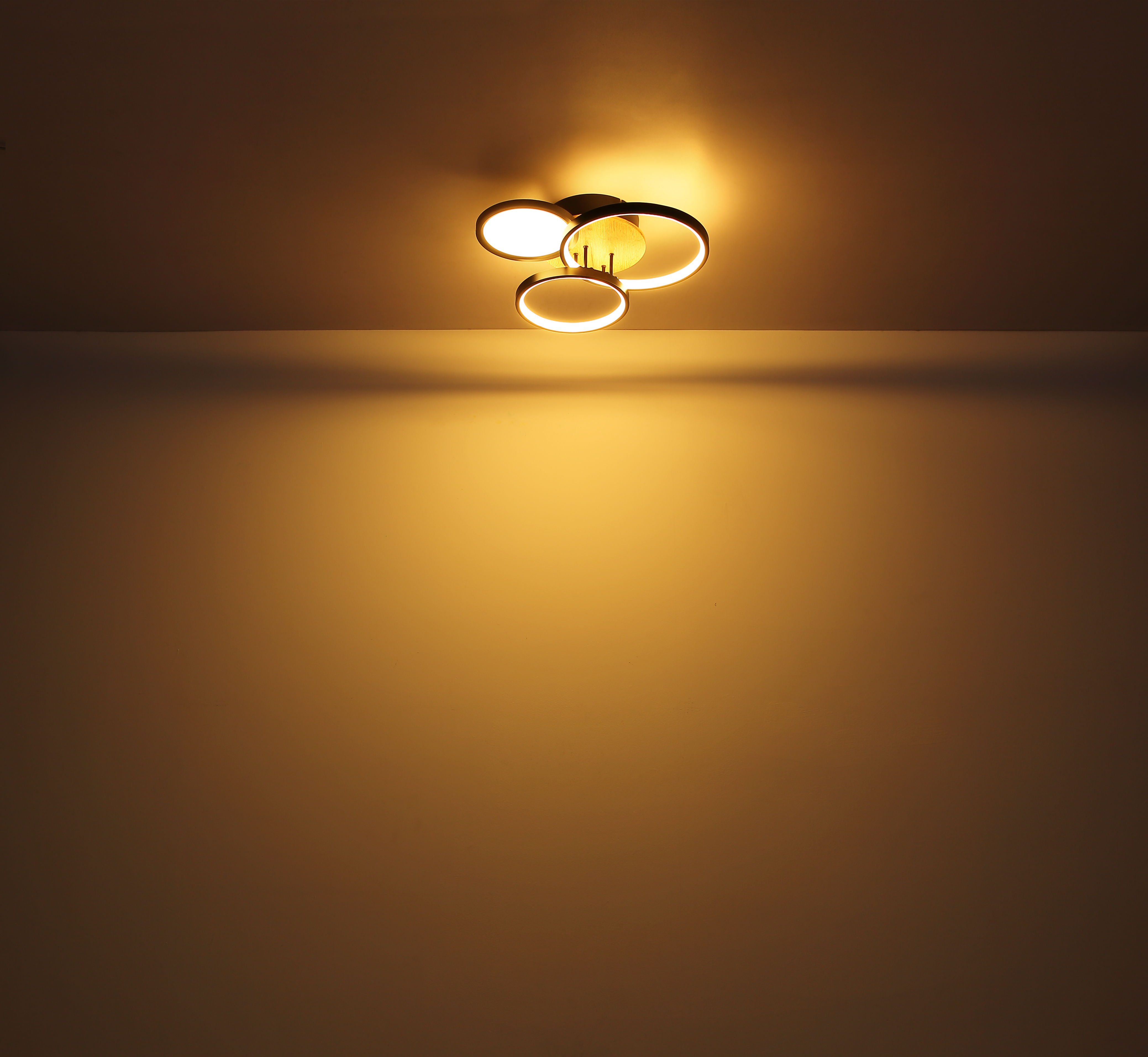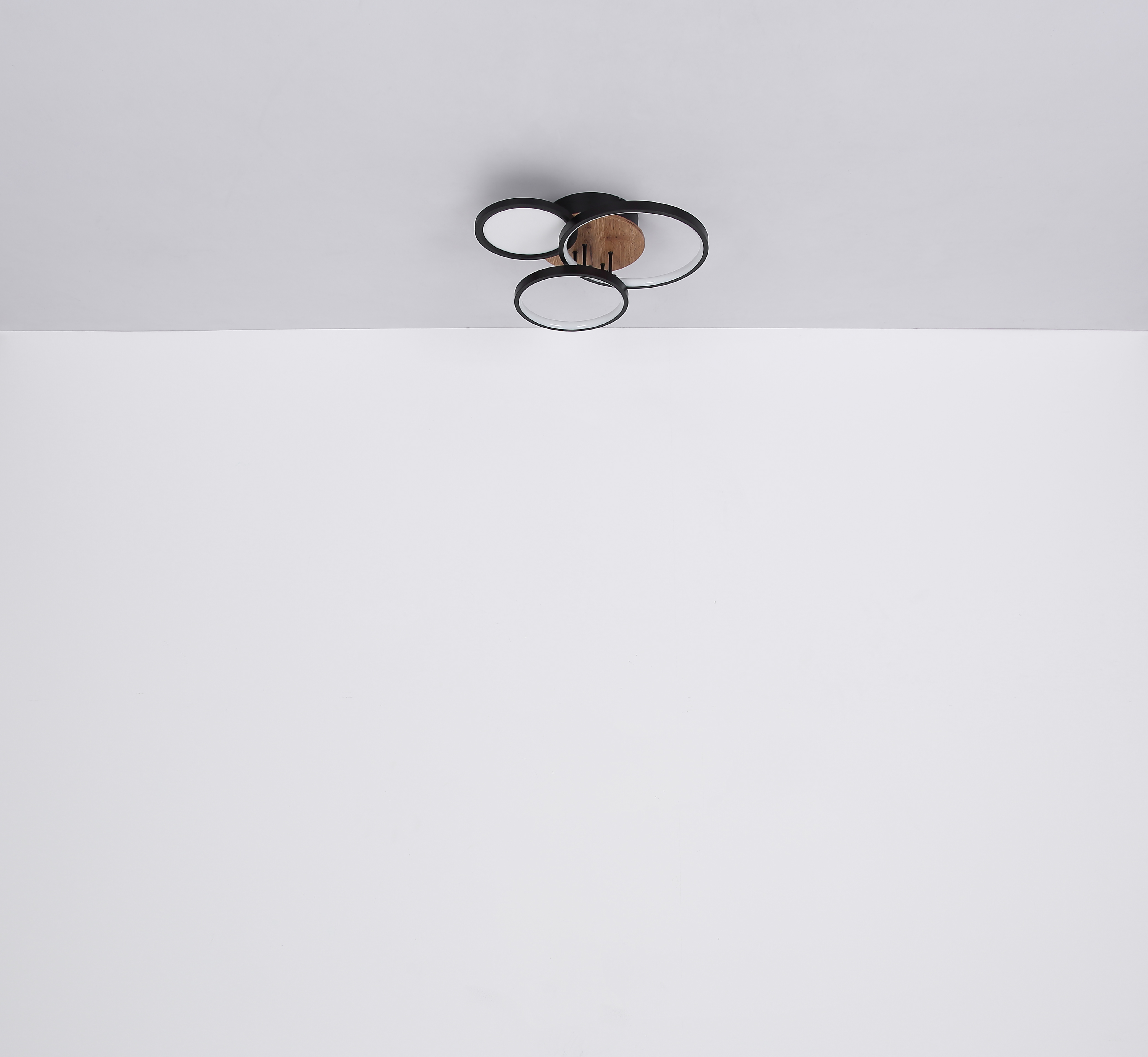 Questa splendida plafoniera della serie Sid ispira per il suo grande design. Da un supporto a soffitto rotondo in nero opaco con una bella decorazione in effetto legno, sporgono tre elementi luminosi rotondi di diverse dimensioni (40x38 cm) con ogni scheda LED integrata che emette una luce bianca calda da 3000 Kelvin e fornisce così una piacevole atmosfera.