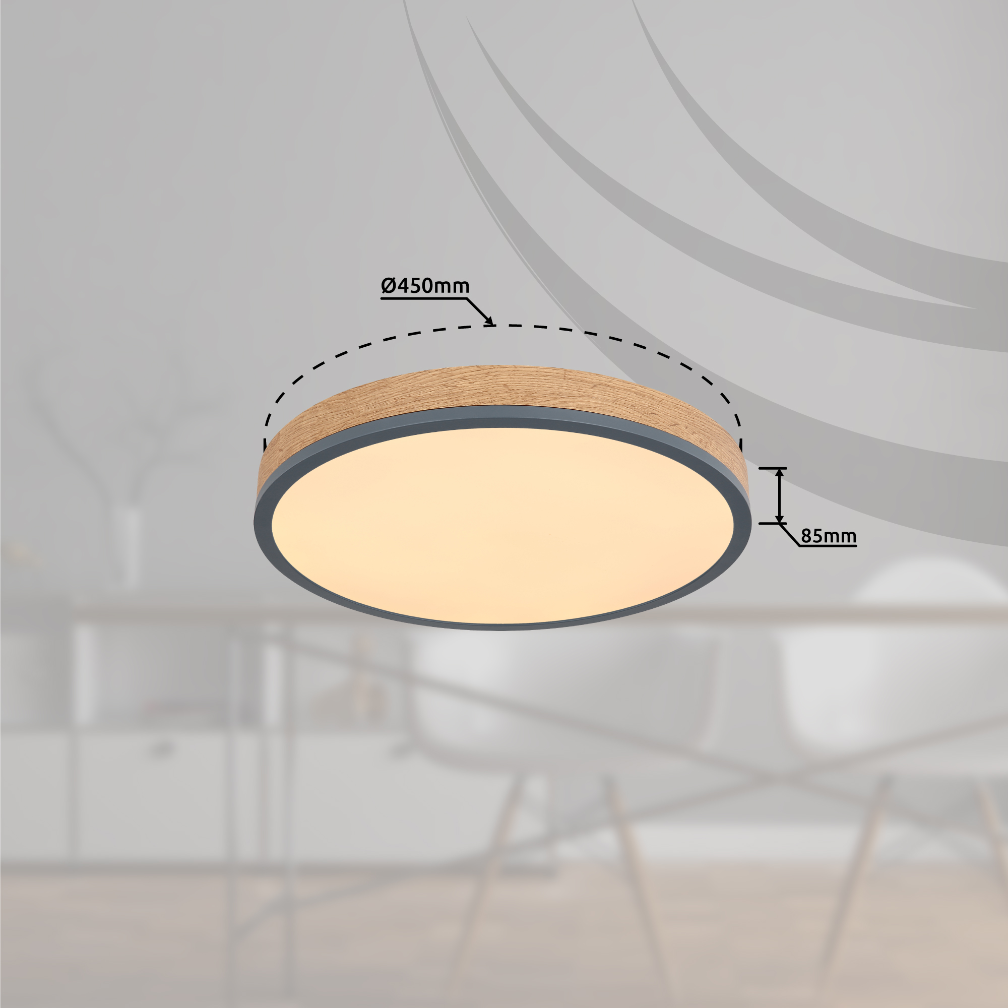 Questa plafoniera rotonda ispira per il suo grande design. La plastica opalina, che ricopre le lampadine LED incluse, è racchiusa da un alloggiamento esterno rotondo in metallo e MDF in effetto legno (Ø45cm). Le lampadine a LED forniscono una piacevole luce bianca calda a 3000 Kelvin.