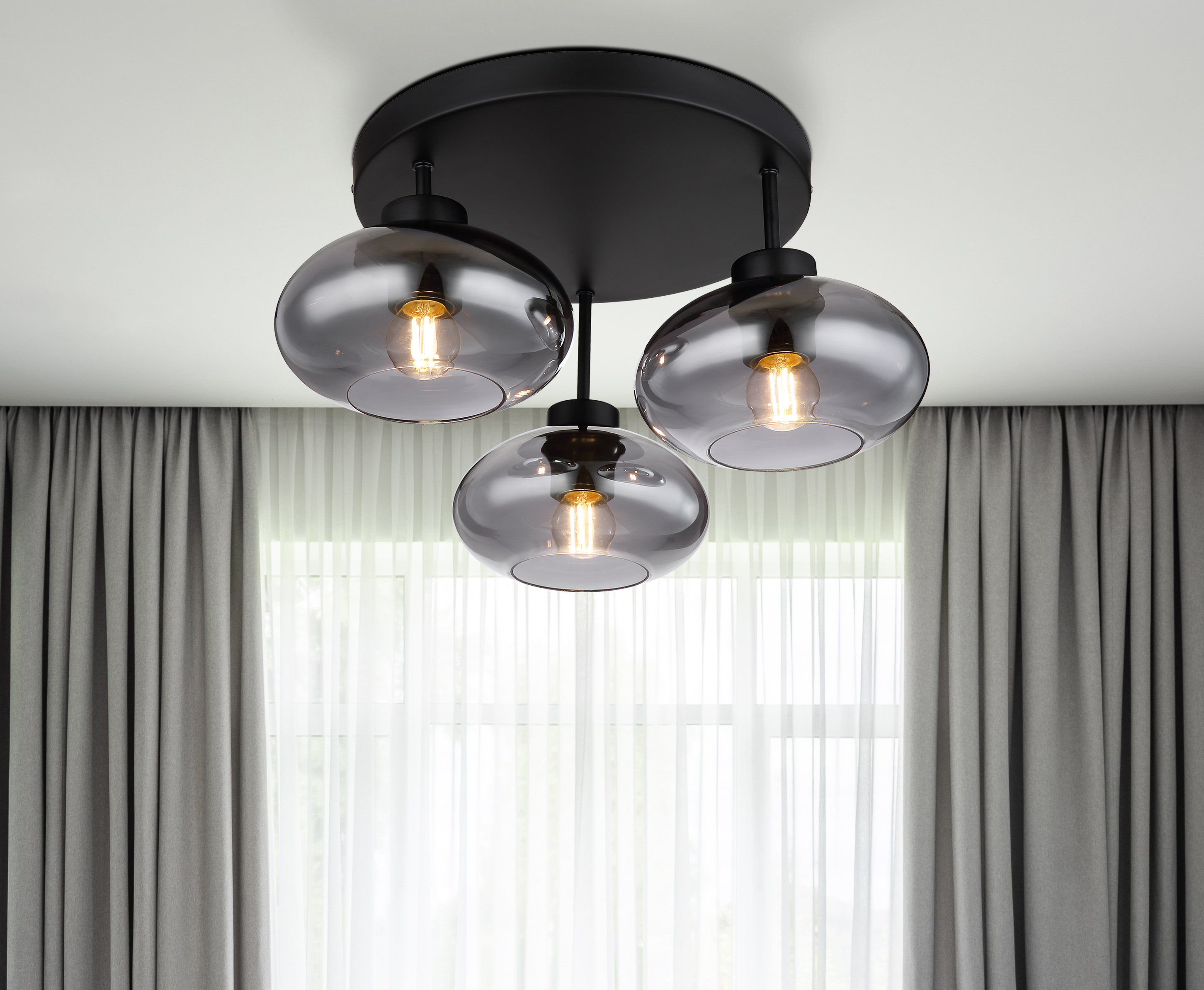 Questa plafoniera rotonda della serie SHAUN convince per il suo design elegante. Tre aste in metallo nero opaco sporgono da un attacco a soffitto rotondo e ciascuna estremità è collegata a una presa E27, dotata di paralumi in vetro color fumé. Gli attacchi E27 consentono di scegliere liberamente, fino a una potenza massima di 40 watt, per determinare il proprio colore di luce e la propria luminosità.