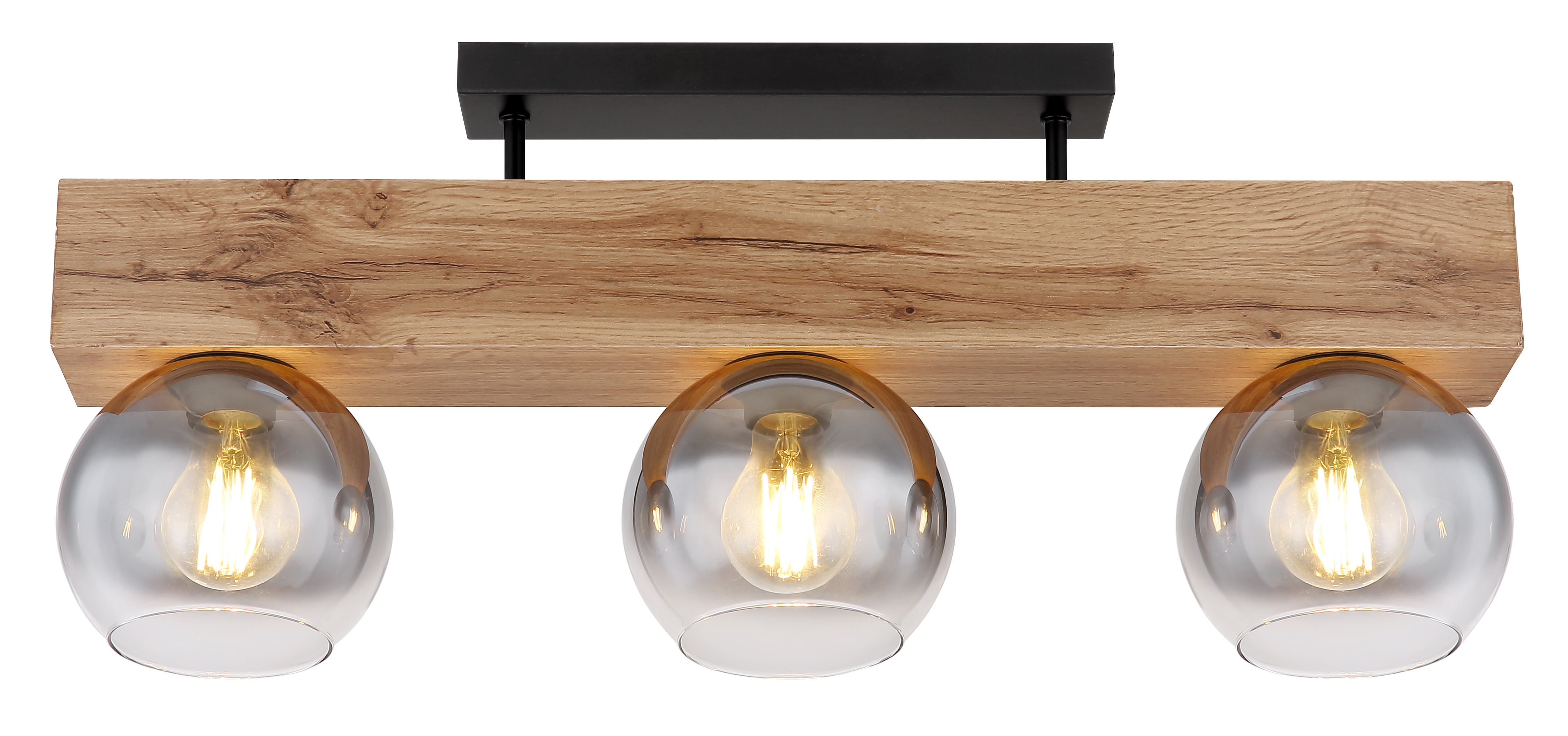 Questa bella plafoniera della serie MOITAS ispira con un grande design. Da un attacco a soffitto rettangolare nero, due corte aste metalliche sporgono in un blocco in legno (65x15 cm). Sono presenti tre prese E27, ciascuna con un paralume in vetro nei colori fumé. Gli attacchi E27 consentono di decidere autonomamente il colore e l'intensità della luce fino a una potenza massima di 40 watt.