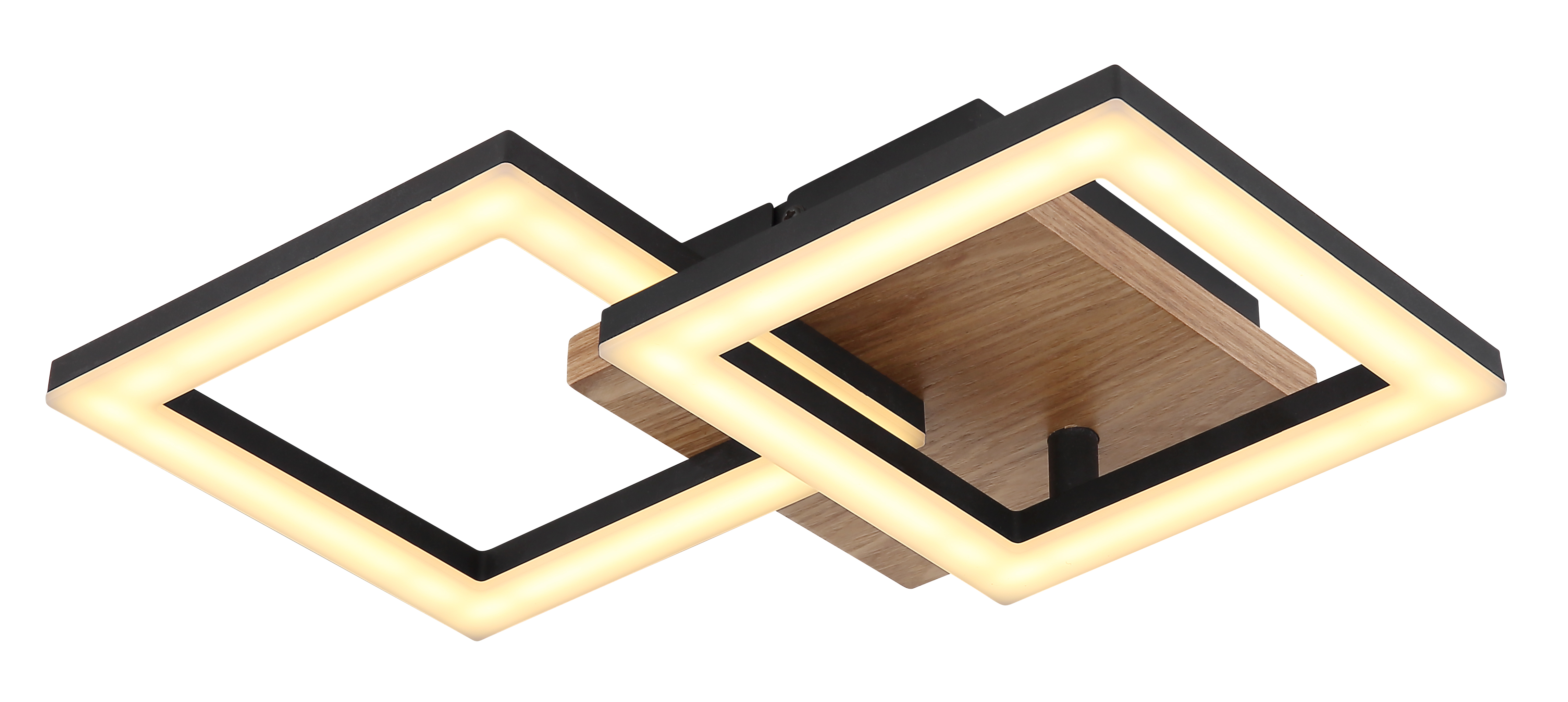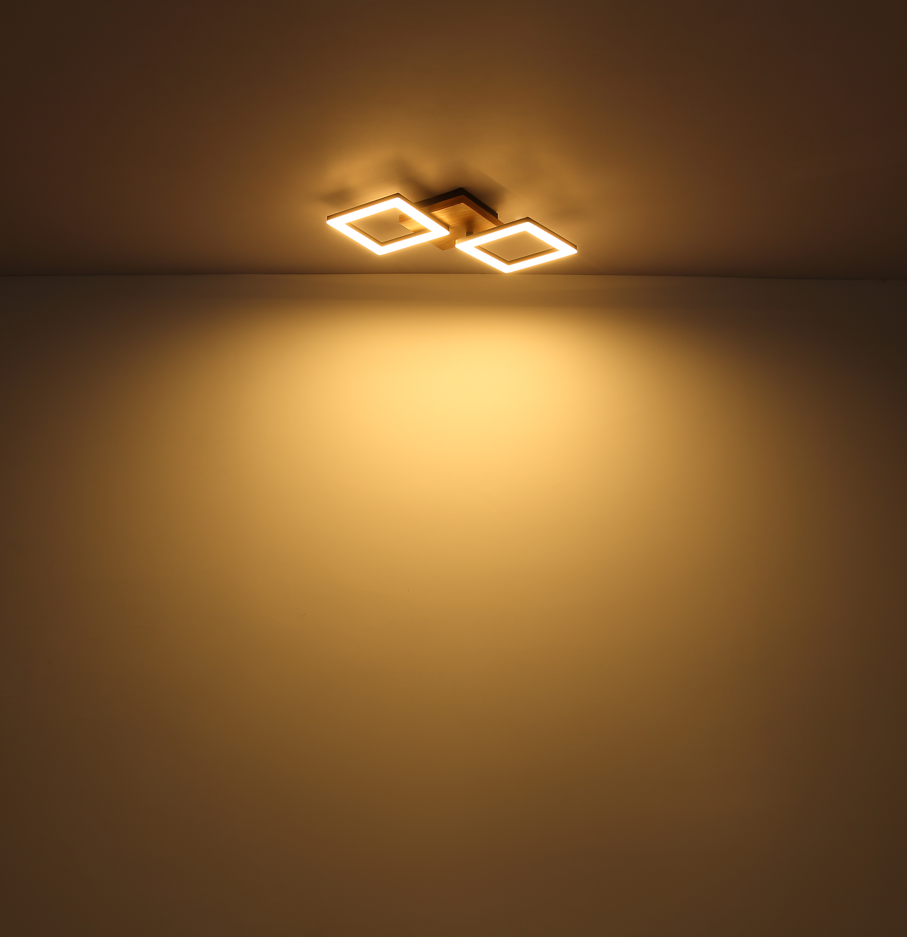 Questa moderna plafoniera della serie KERRY ispira con un grande design e diventa il centro di ogni stanza. Su un attacco a soffitto in effetto legno si trovano due pannelli LED quadrati con una lunghezza totale di 46 cm, che emanano una luce bianca calda da 3000 Kelvin e creano così una grande atmosfera.