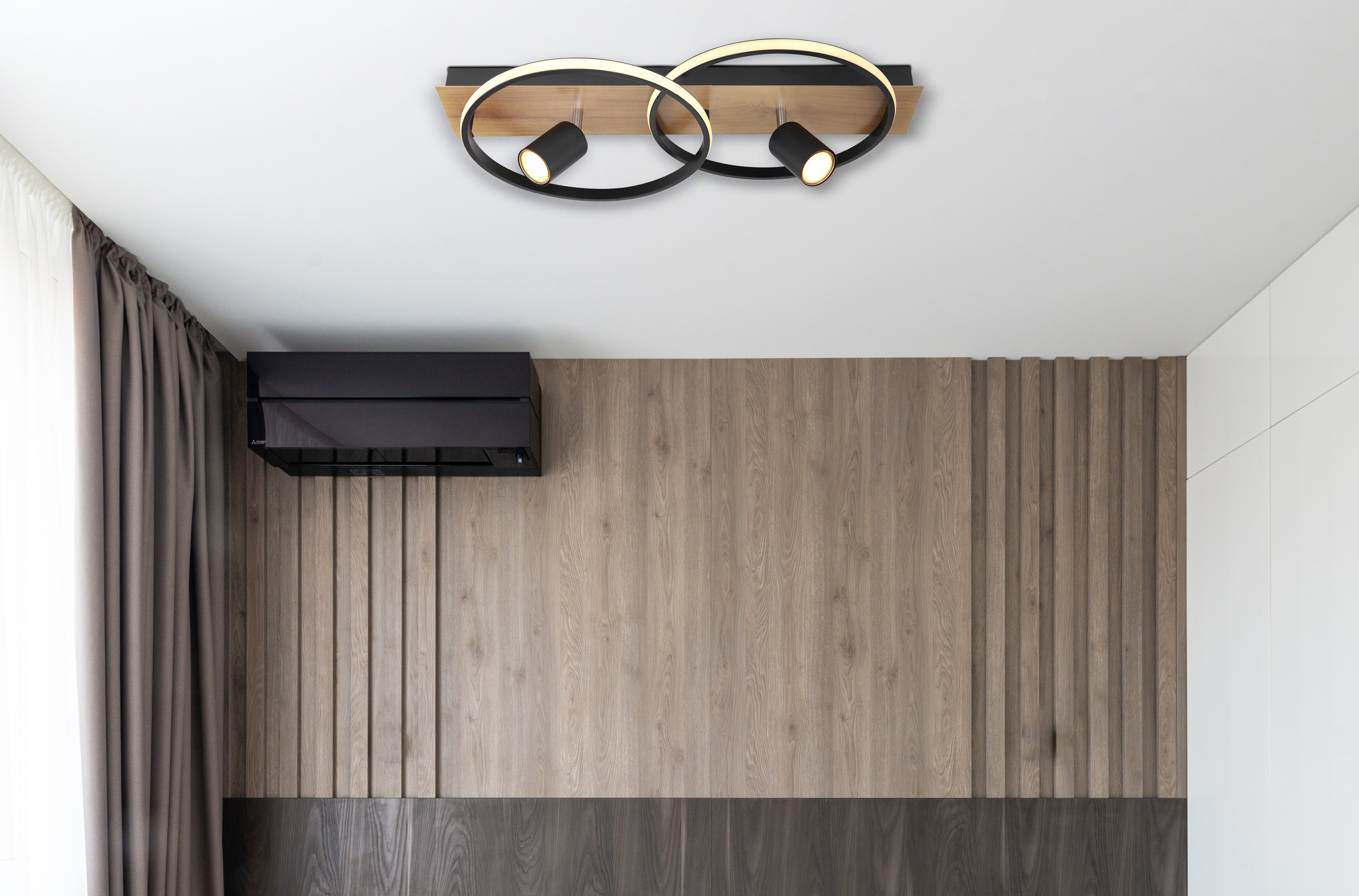 Questa moderna plafoniera con decorazioni in legno convince per l'ottima fattura. Su un attacco a soffitto rettangolare di colore nero con decorazioni in legno sono presenti due pannelli LED rotondi che emettono una luce bianca calda a 3000 Kelvin e che quindi creano una piacevole atmosfera. Inoltre, dall'attacco a soffitto sporgono due prese GU10 che consentono di decidere il colore della luce e la luminosità fino a una potenza massima di 36 watt. La funzione di memoria salva le ultime impostazioni utilizzate dell'apparecchio.