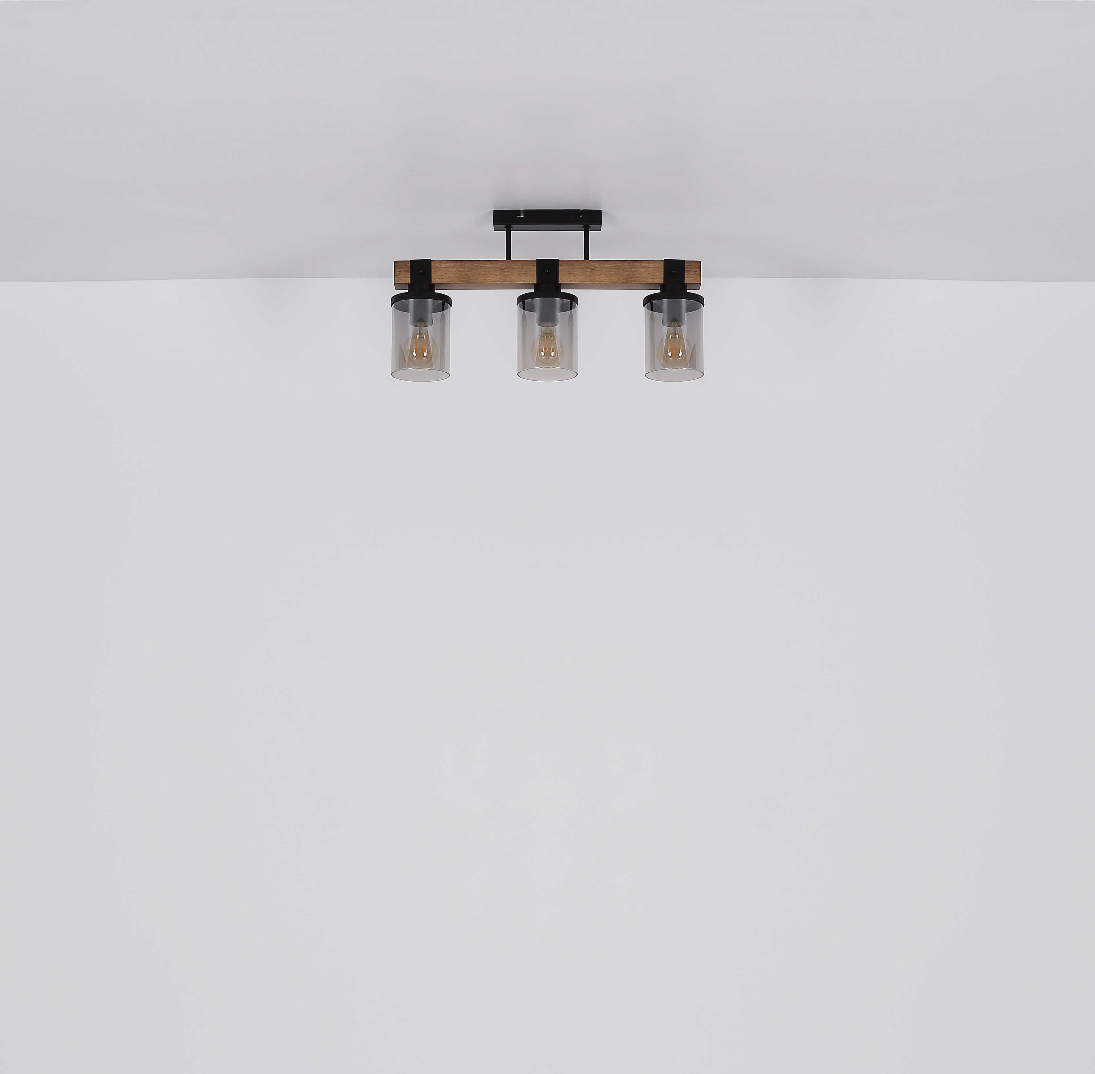 This beautiful ceiling lamp inspires with great design. From a narrow ceiling attachment, two black metal rods run to a 52 cm long wooden trunk. On the wooden framework there are three E27 sockets, each with a smoke-coloured shade (Ø10cm) in the form of a cylinder. By freely selecting the bulbs, you can determine the light color or brightness yourself, up to a maximum power of 60 watts. Set new accents in your premises.