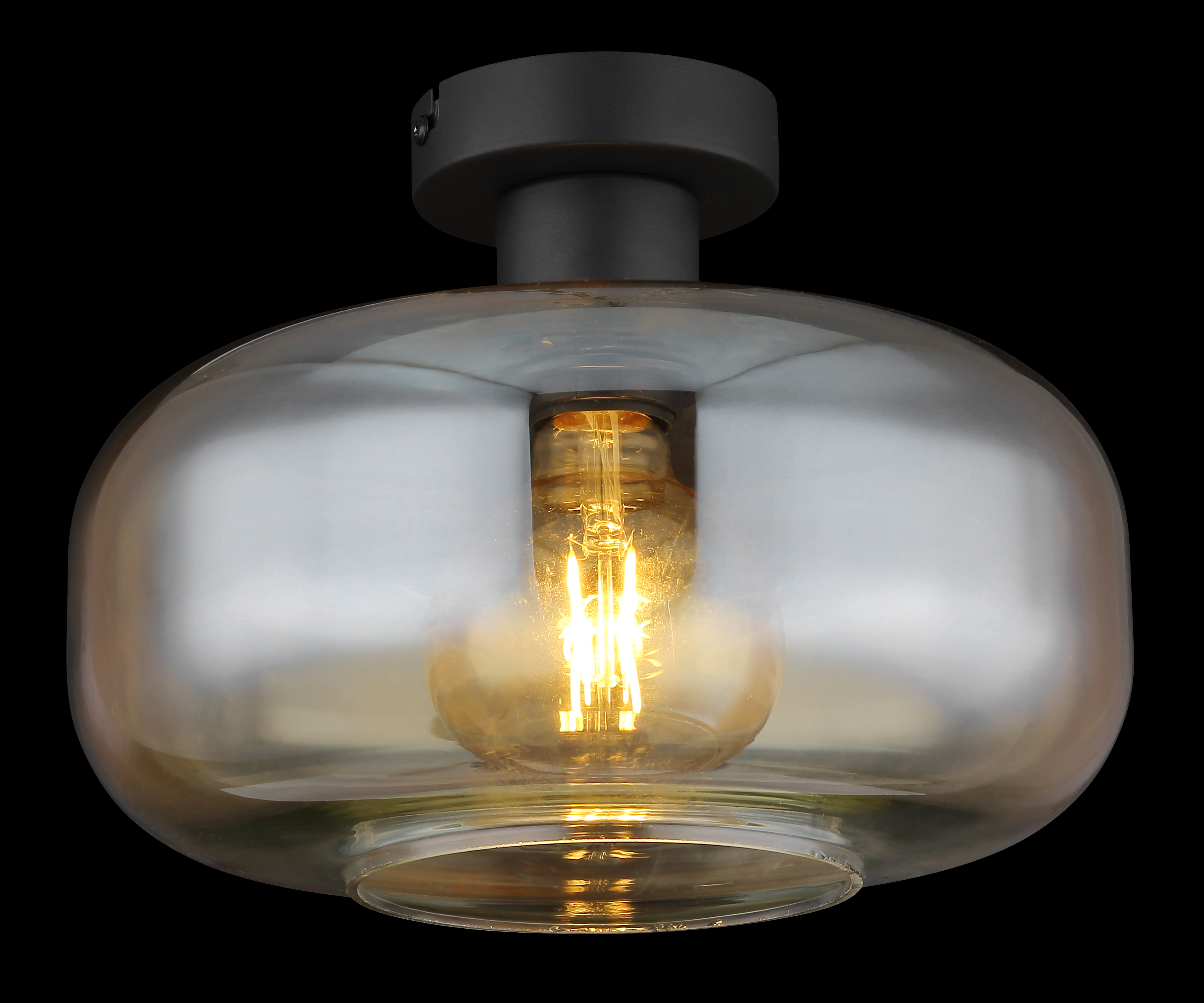 Questa semplice plafoniera convince per il suo design. Da un attacco a soffitto rotondo sporge una presa E27, coperta da un paralume in vetro (Ø28 cm) color ambra. L'attacco E27 consente di determinare il colore della luce e la luminosità fino a una potenza massima di 40 watt. Per il risparmio energetico e la longevità, si consigliano le lampadine a LED.