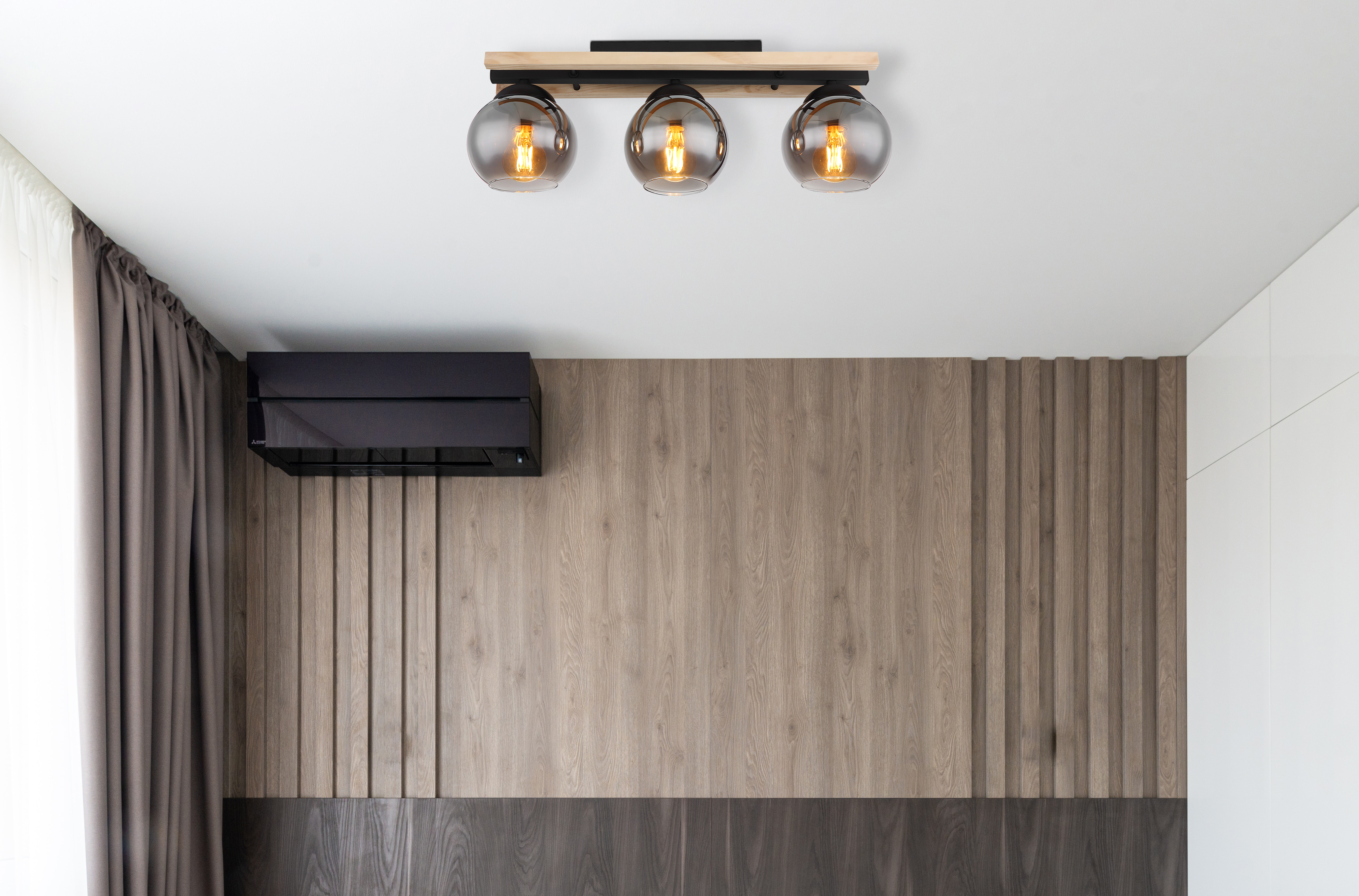 Questa semplice plafoniera ispira con il suo bel design. Da un attacco a soffitto rettangolare nero (60 x 15 cm) con decorazioni in legno, sporgono tre attacchi E27, ciascuno con un paralume in vetro color fumé (Ø 18 cm). Gli attacchi E27 consentono di determinare il colore della luce e la luminosità fino a una potenza massima di 40 watt. Per la longevità e il risparmio energetico, si consigliano le lampadine a LED.
