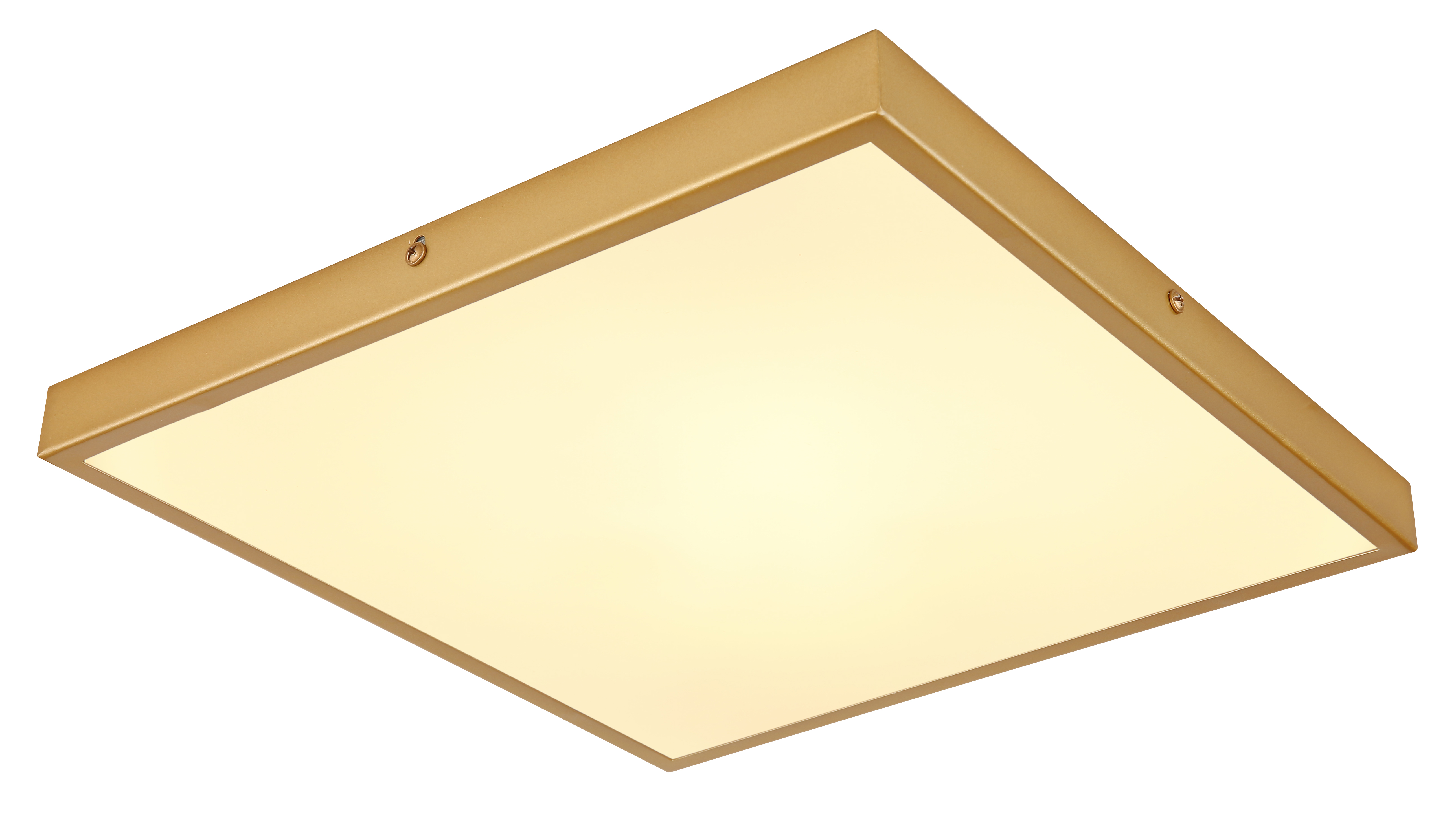 Realizzata in metallo color ottone, la lampada da soffitto della serie TIBEY colpisce per il suo design semplice. La plafoniera quadrata (35 cm) con coperchio in plastica opalina ha un pannello LED incorporato che emette una luce bianca calda da 3000 Kelvin e crea così un'atmosfera piacevole.