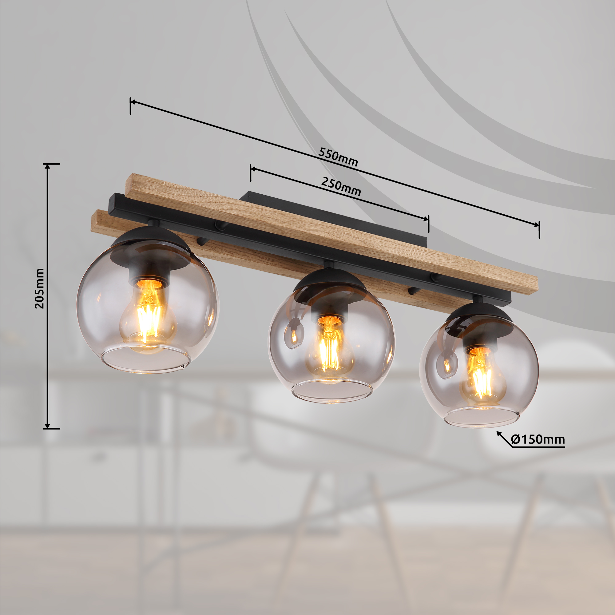 La lampada da soffitto CONNI unisce un design moderno ad un tocco di fascino vintage. Con il suo bar dritto e rettangolare e i vetri a bulbo, è un vero e proprio colpo d'occhio in qualsiasi stanza. Il corpo della lampada da soffitto CONNI è realizzato in metallo nero opaco e legno marrone scuro, che crea un contrasto armonioso e le conferisce un tocco rustico. Le lenti sono realizzate in vetro color fumo e forniscono un'illuminazione piacevole e priva di abbagliamento. Con una lunghezza di 600 mm e una larghezza di 150 mm, la lampada da soffitto CONNI si adatta perfettamente ad ambienti di diverse dimensioni. Che si tratti del soggiorno, della sala da pranzo o del corridoio, crea un punto culminante decorativo ovunque. Questa plafoniera non è solo visivamente accattivante, ma anche funzionale. Offre una buona emissione luminosa e crea un'atmosfera accogliente. Con CONI, puoi contare su una soluzione di illuminazione elegante e di alta qualità per la tua casa.