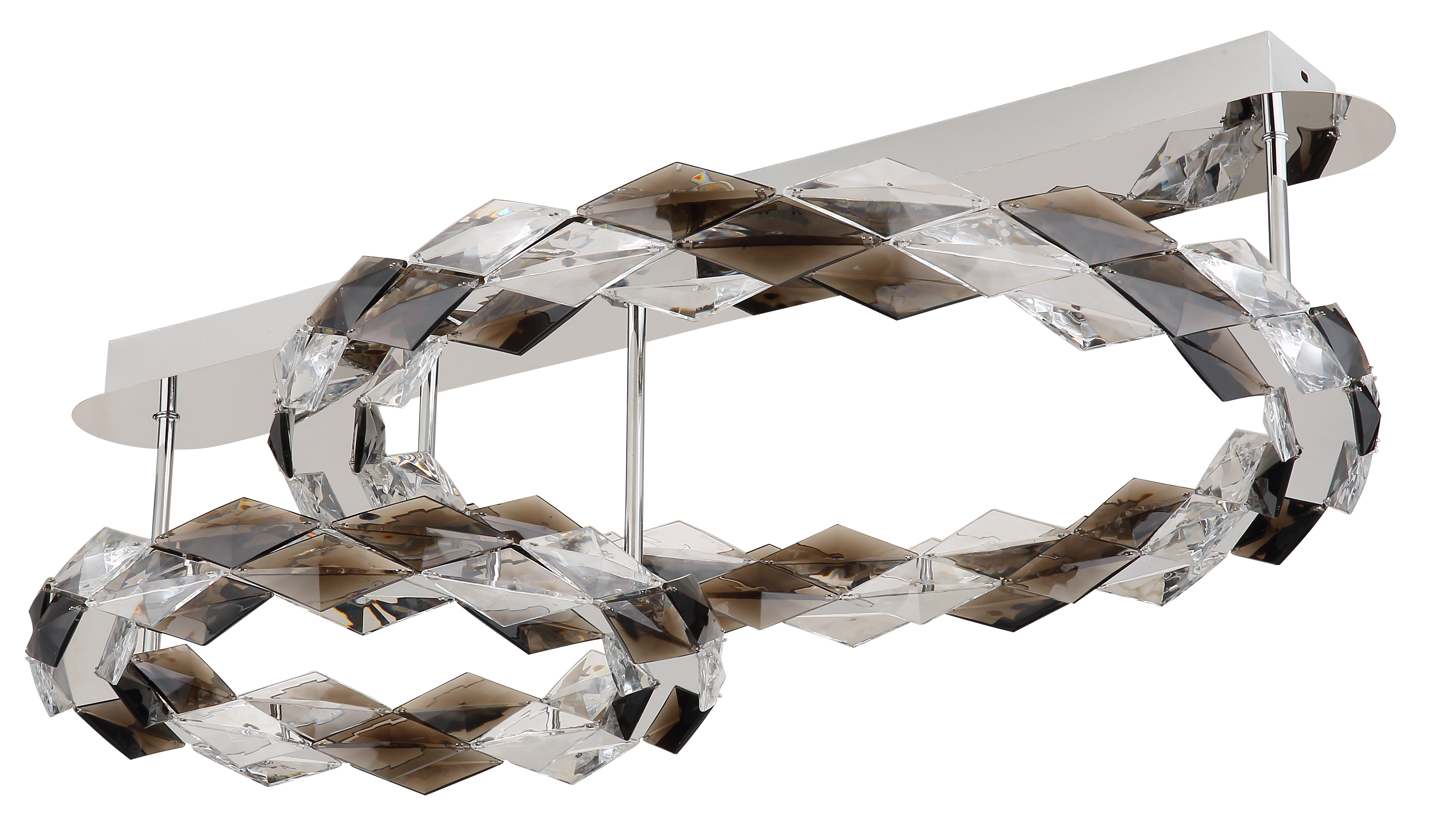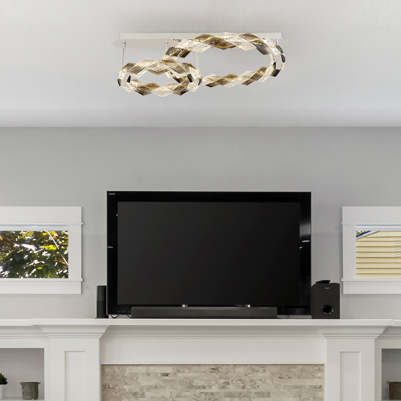 La lampada da soffitto è realizzata in metallo cromato e cristalli acrilici color fumo, disposti in un diametro di 550 mm e 370 mm. L'apparecchio è dotato di una lampadina a LED con una potenza di 50 W e una tensione di 230 V. La sorgente luminosa ha una luminosità di 5700 lm e una potenza di uscita di 1300 lm ad una temperatura di colore di 4000K. Questa lampada da soffitto è un vero e proprio colpo d'occhio ed è ideale per gli spazi abitativi moderni. La combinazione di metallo cromato e cristalli acrilici color fumo conferisce alla lampada un aspetto elegante. Con la lampada a LED, risparmi energia e proteggi l'ambiente. La plafoniera ha una lunghezza di 800 mm, una larghezza di 550 mm e un'altezza di 240 mm. È ideale per stanze con soffitti alti o come elemento centrale in una stanza. La luminosità della lampada a LED offre un'illuminazione piacevole che bagna la stanza in una luce calda. La lampada da soffitto è composta da due anelli con un diametro rispettivamente di 55 cm e 37 cm. Questa disposizione conferisce all'apparecchio un aspetto moderno e garantisce un'illuminazione uniforme in tutta la stanza.
