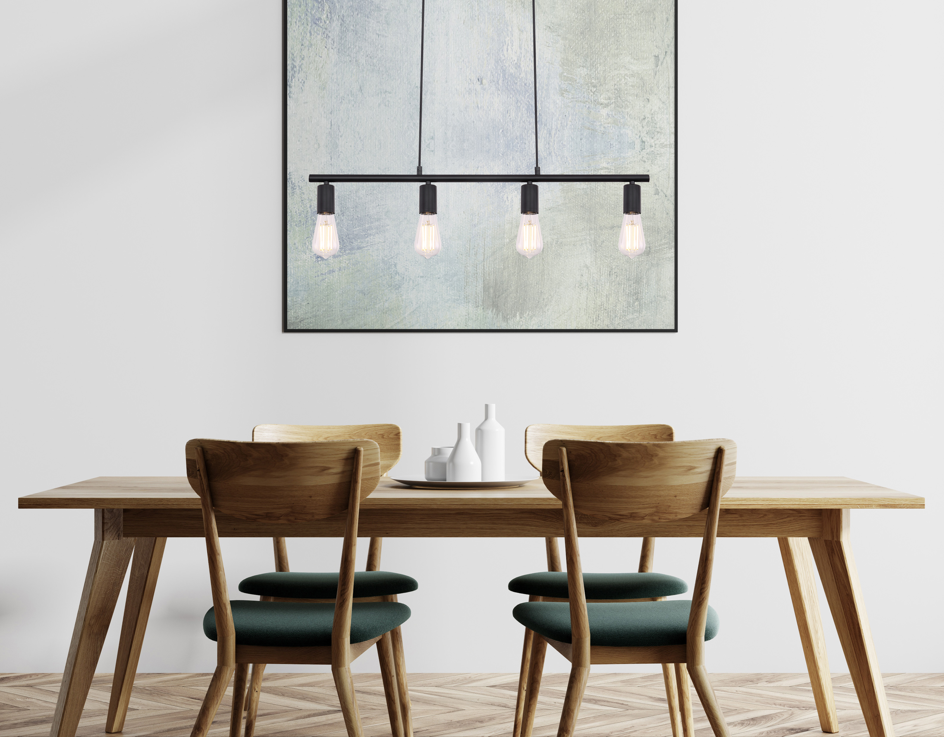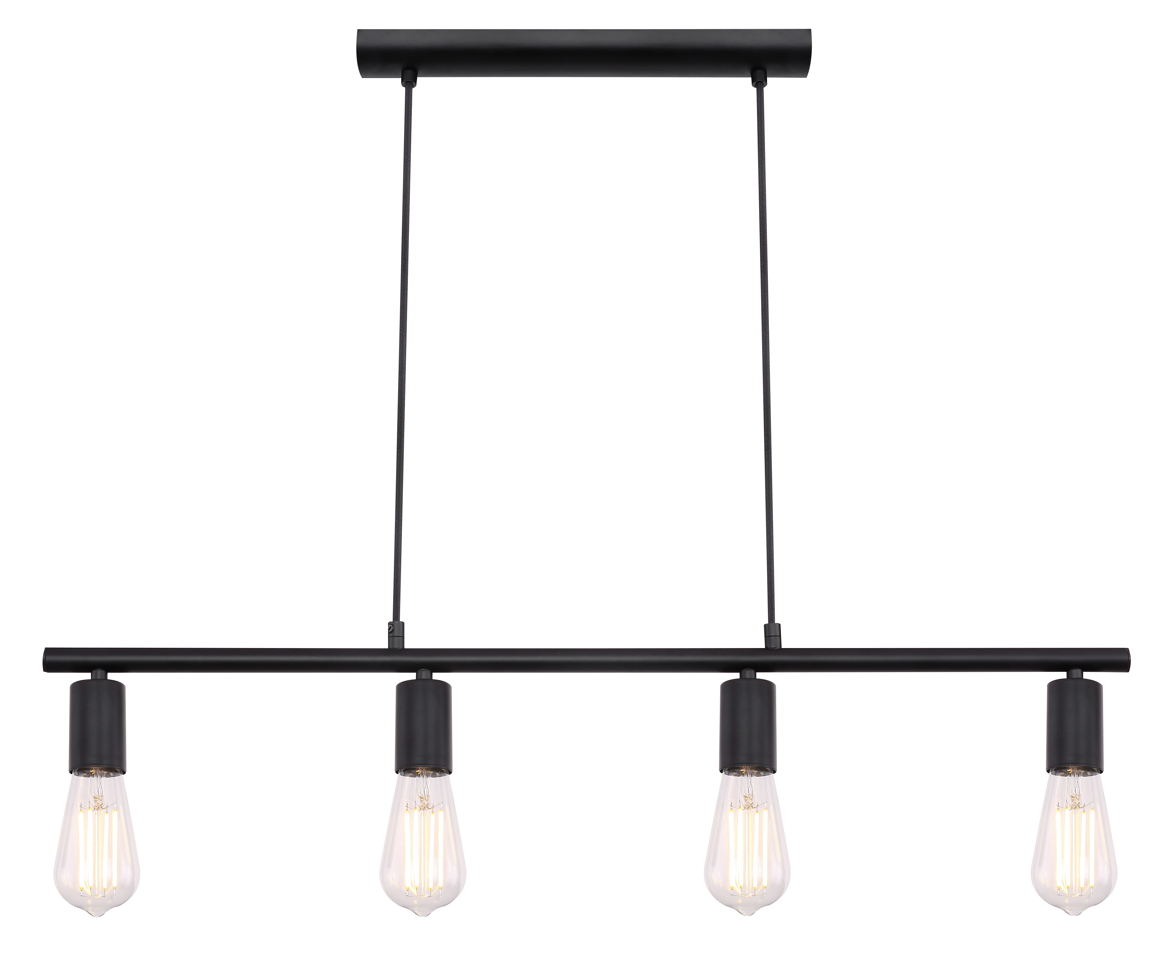 La lampada a sospensione a quattro luci, lunga 80 cm, si integra perfettamente in ogni casa. Con il suo moderno design vintage, è pienamente in linea con le ultime tendenze e può essere integrato in molte varianti di arredamento contemporaneo. Così, la lampada è molto adatta per l'illuminazione della tavola in cucina o in sala da pranzo. È possibile equipaggiare la lampada con quattro lampadine con l'attacco E27 max. 60W. Grazie alla loro longevità e al risparmio energetico, raccomandiamo le lampadine a LED. Con ulteriori modelli di questa serie si potrà abbellire ulteriormente ogni soggiorno.