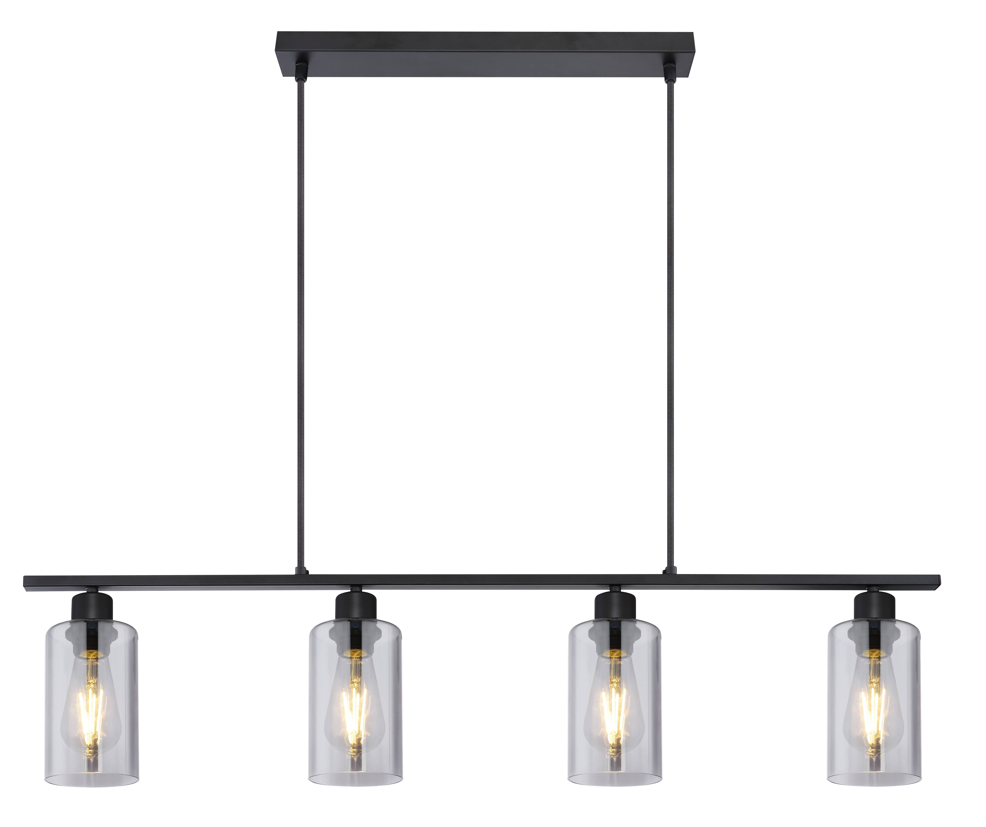 Grazie alla sua forma allungata, la sospensione della serie Hadera in metallo nero opaco è meravigliosamente adatta ad essere montata sopra un tavolo da pranzo, che quindi sperimenta un'illuminazione uniforme. La sospensione lunga 98 cm può essere dotata di quattro lampadine E27 a scelta, ognuna delle quali è poi circondata da un vetro cilindrico fumé e pende dal soffitto per 1,2 m. Questo permette di determinare individualmente il colore e la luminosità della luce. Con diversi articoli della serie Hadera, si può completare il quadro generale del proprio spazio interno.