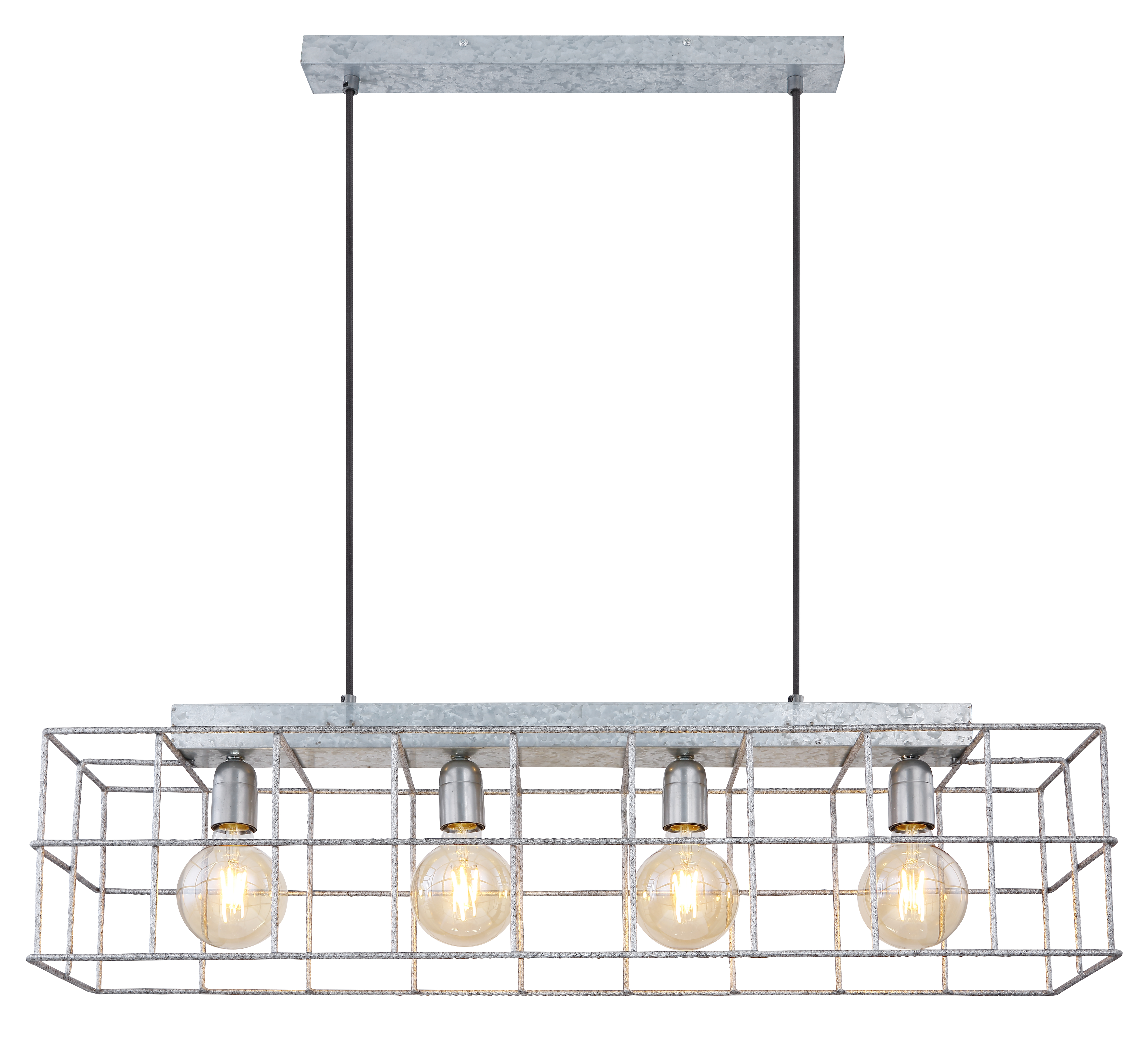 Questa sospensione della serie Merril convince con il suo elegante design in metallo color argento. La sospensione lunga 90 cm consiste in un cuboide di metallo allungato, che è dotato di una griglia di metallo argentato e pende dal soffitto su due cavi neri. L'altezza della sospensione può essere regolata fino a 150 cm durante il montaggio. Inoltre, è possibile equipaggiare le quattro prese E27 all'interno della griglia metallica con lampadine adatte di propria scelta, il che dà la possibilità di determinare il colore della luce e la luminosità secondo le proprie preferenze. Utilizzando diversi modelli della stessa serie, è possibile completare il quadro generale nei propri interni.