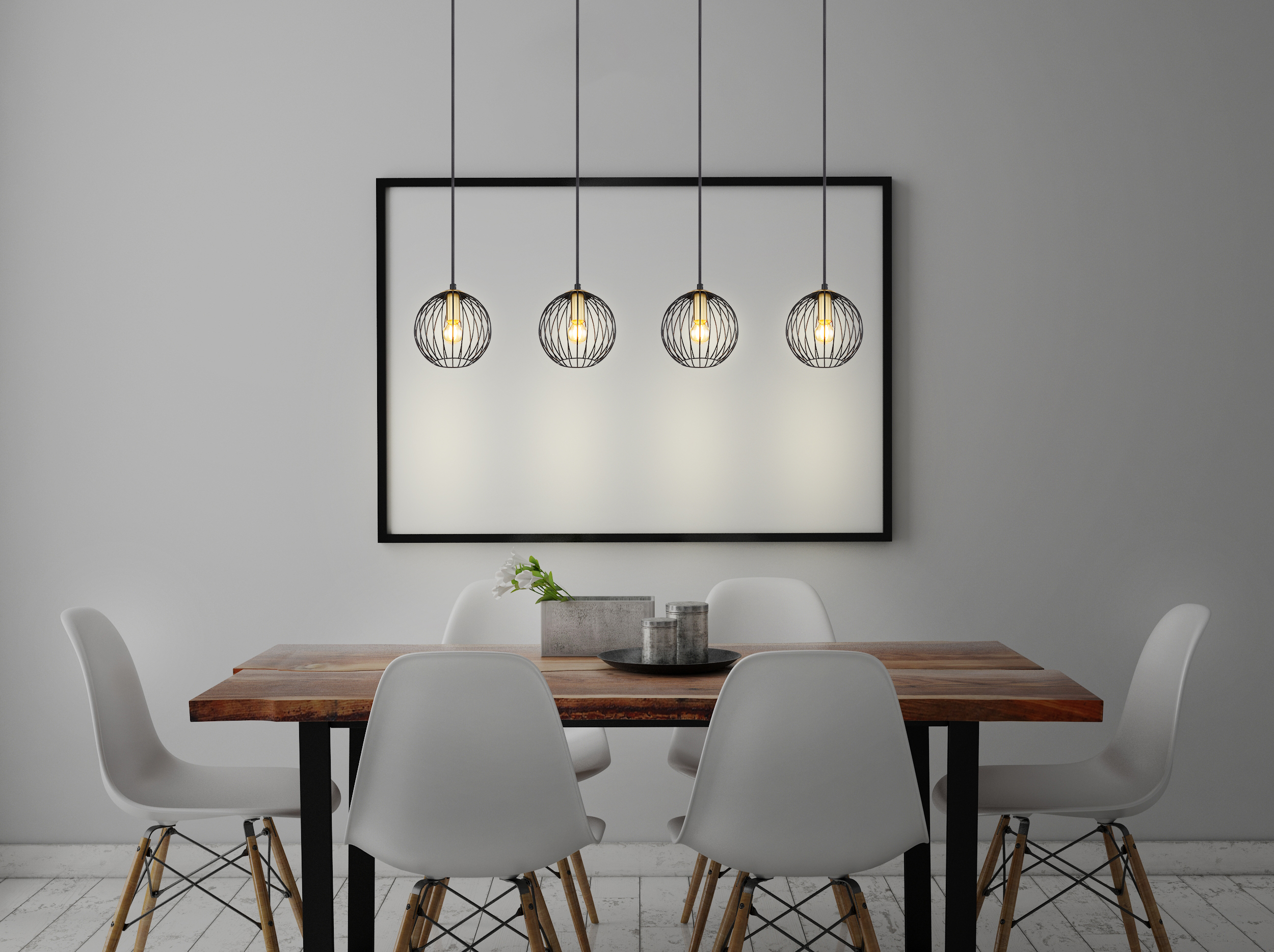 Questa sospensione della serie Eusebius (ø 39 cm) è una meravigliosa aggiunta ai propri interni. Consiste in una piastra di metallo nero da cui pendono tre tonalità sferiche di rete metallica da cavi neri. Le prese E27 all'interno delle tonalità, incorniciate dal metallo color ottone, possono essere montate con lampadine abbinate di propria scelta, dando a ciascuno la possibilità di determinare individualmente il colore della luce e la luminosità. Inoltre, l'altezza della sospensione può essere regolata fino a 150 cm quando è montata. Con altri modelli della stessa serie, si può completare il quadro generale all'interno dell'ambiente.